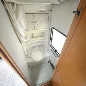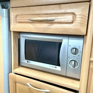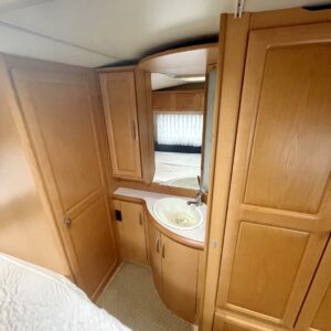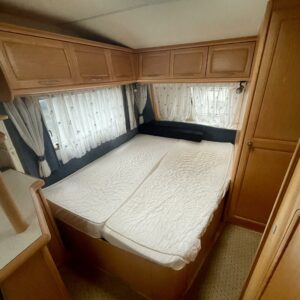 Takaosassa iso pöytäryhmä. Keskeltä vaunua löytyy keittiö sekä pienempi pöytäryhmä. Keulassa parivuode ja wc.