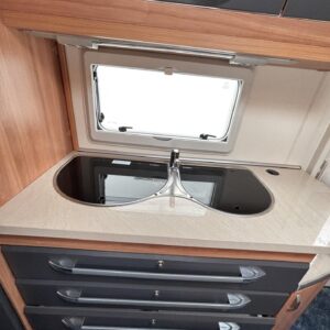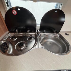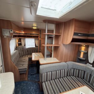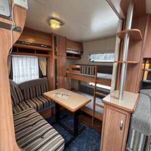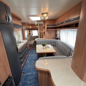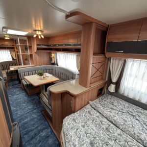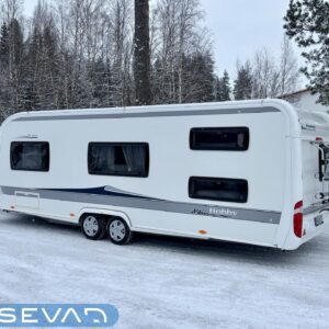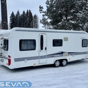 Perhemallin Hobby niin sanottuna lastenhuone versiona. Vaunun takaosaan on sijoitettu pitkittäiset kerrosvuoteet, sekä kulmasohva ja alas laskettava pöytä. Tänne majoittelee hienosti ainakin 3 juniorikaravaanaria. Tämän osaston saa myös suljettua omaksi sopeksi välioven avulla. Keskellä vanua on keittiö, sekä U-ryhmä ruokailu/seurustelutoimintoja varten. Tähänkin saa sijattua yhden vuoteen tarpeen tullen. Keittiössä on mukavasti säilytystiloja isoissa vetolaatikoissa. Laskutilaa on lisänä sohvaryhmän molempien reunojen aputasoilla. Ja koska iso vaunu ja paljon asukkaita, niin jääkaappi on myös mitoitettu sen mukaisesti ihan reilun kokoiseksi. Etuosassa on pitkittäinen parivuode ja WC/kylpyhuonetilat. Ihan nätti vaunu ja etenkin sisätiloiltaan oikeinkin siistissä kunnossa.
