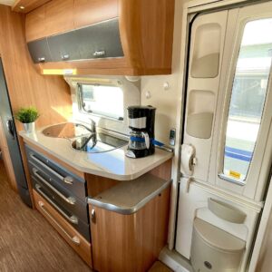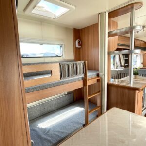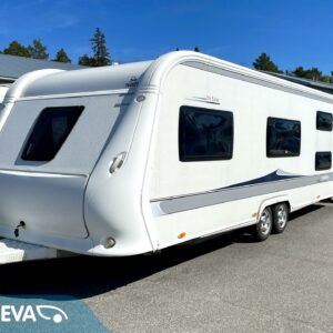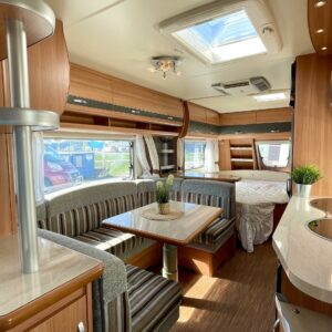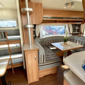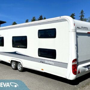 Aldellinen ilmastoitu Hobby jossa takapäässä lapsille oma huone ja etupäässä aikuisten valtakunta. Keskelle porukka sitten kokoontuu ruokailemaan.