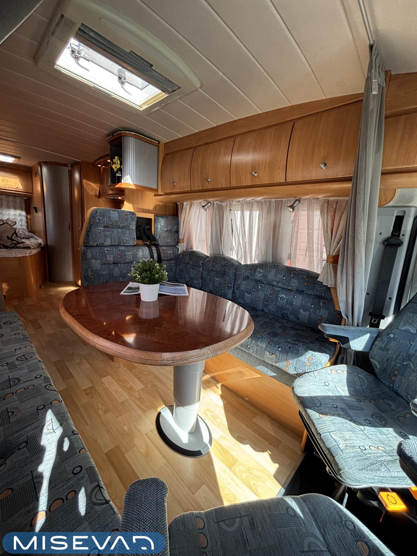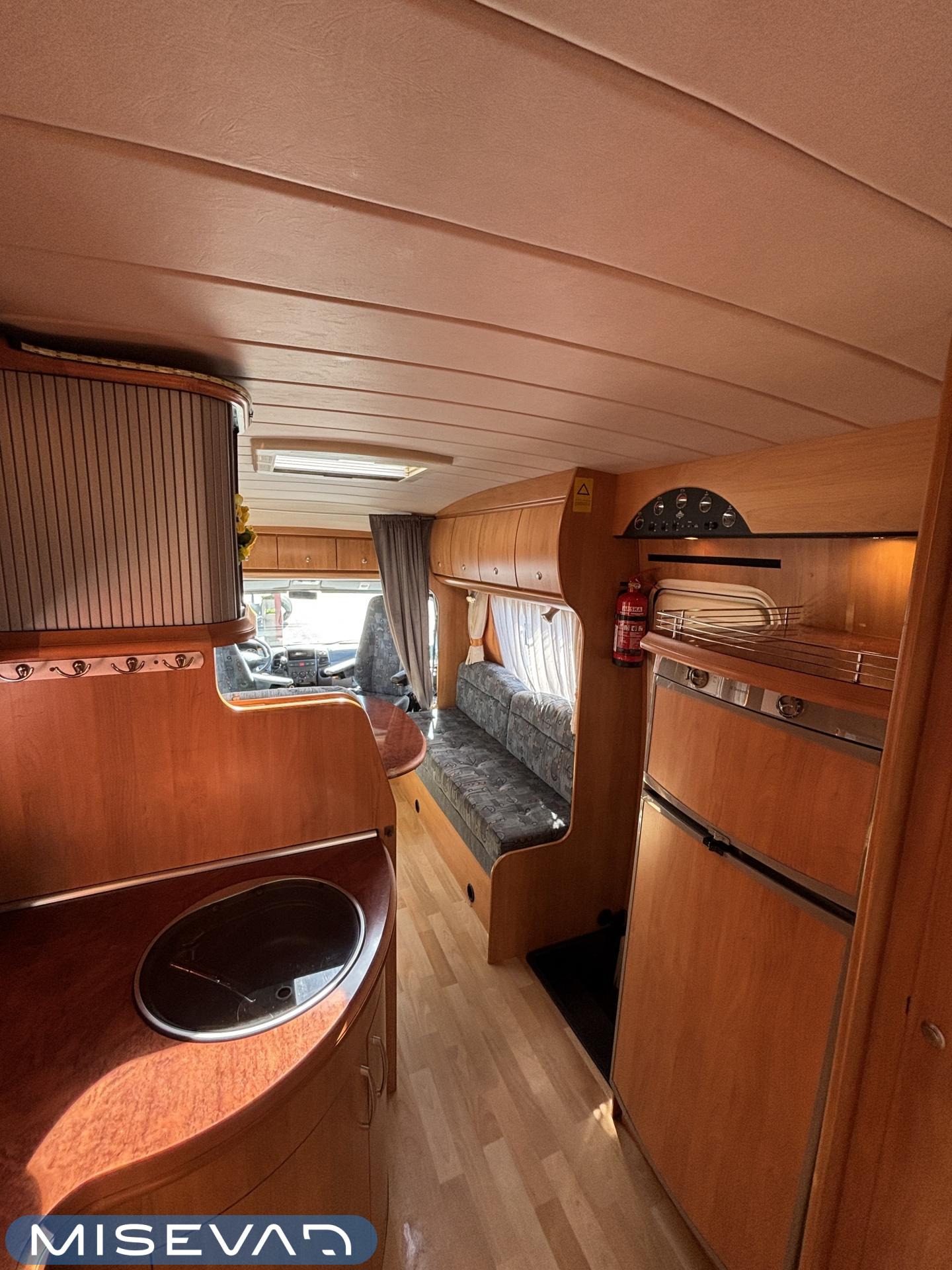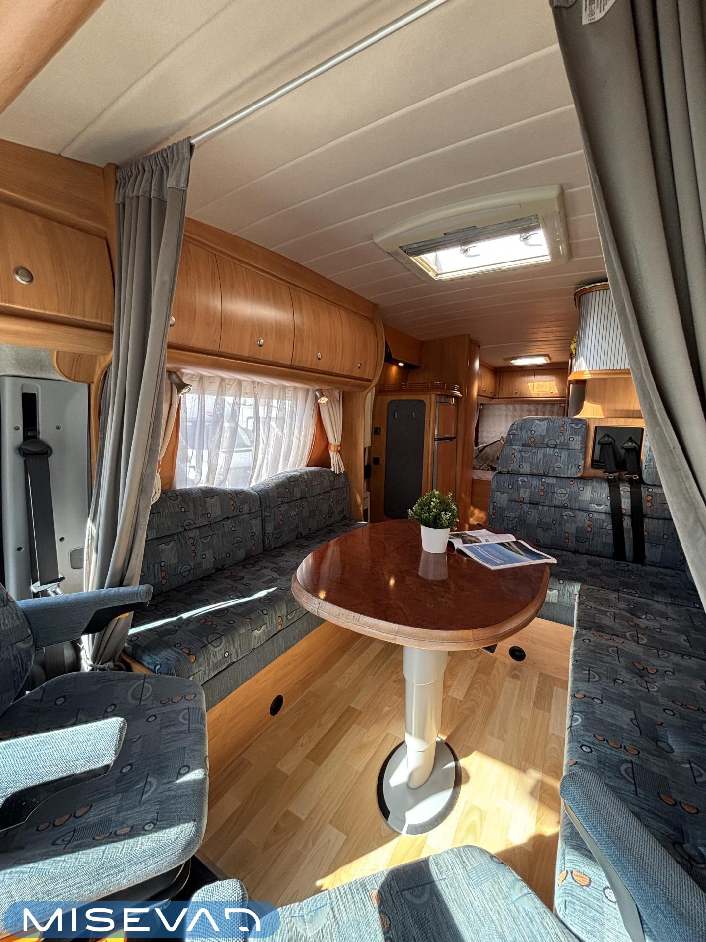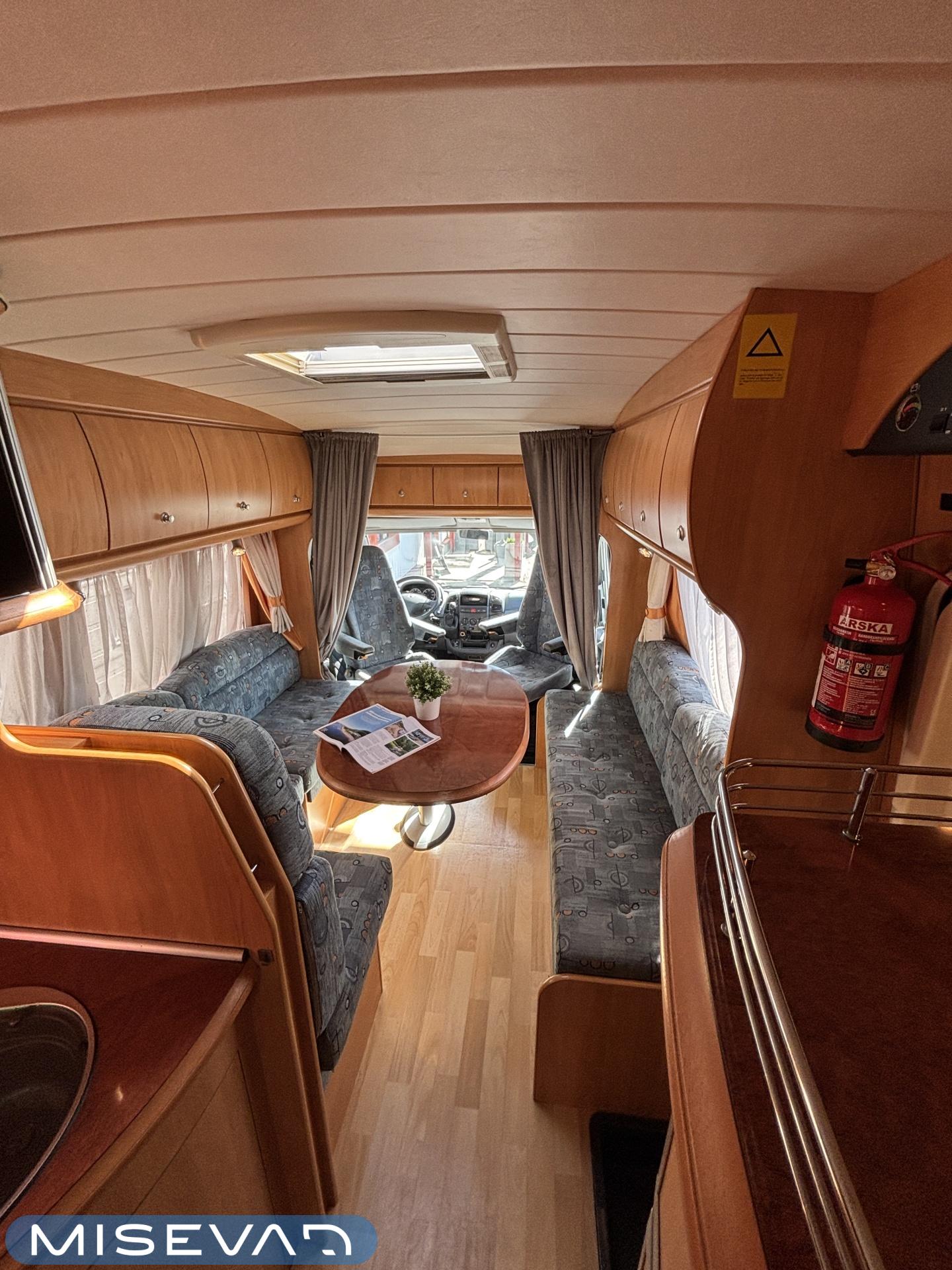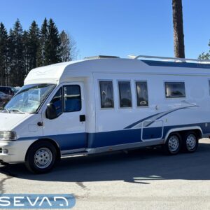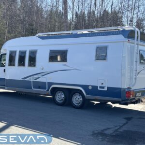 Hotellihuone pyörillä! Lähes kahdeksan metrin kokonaispituuden omaava aikansa legenda ja vieläpä ihan kohtuullisen ajomäärän omaavana. Pöytäryhmän ympärille mahtuu isompikin porukka lyömään korttia ja parantamaan maailmaa. Melkoisen hienossa kunnossa säilynyt visuaalisesti, etenkin sisätiloiltaan. Eikä tuo nyt hassumpi ole ulkohipiältäänkään. Tilaa on ruhtinaallisesti, etenkin säilytystiloja, eli voisi toimittaa hienosti vaikkapa pidempiaikaisemmankin majapaikan virkaa. Auton takaosa on makkari / kylppäritiloja missä suihku on omana erillisenä tilanaan. Keskelle sijoittuu L-keittiö, pari isompaa pystykaappia ja tilava jääkaapi/pakastin yhdistelmä. Keittiötaso tarjoilee mukavasti laskutilaa esim. kahvinkeittimelle / leivänpaahtimelle / airfryerille. Etuosahan on sitten olohuonetta. Molemmin puolin on isot sivusohvat ja taittopöytä keskellä. Tähän yhdistyvät vielä kääntyvät ohjaamon penkit, eli isommankin ryhmän illanistujaiset ovat mahdolliset. Ohjaamosta löytyy mm. ilmastointi, sekä vakionopeuden säädin. Autohan on neljälle rekisteröity ja neljälle löytyy myös vyöpaikat. Sohvaryhmästä saadaan pitkittäissuuntaiset vuoteet kooltaan 160X65 ja 190X65. Lisäksi pöytä on laskettavaa mallia. Auto on ajamiseen vaaditaan vähintään C1-luokan ajokortti. Näitä ei ole liikaa tarjolla … kuka kerkeää???