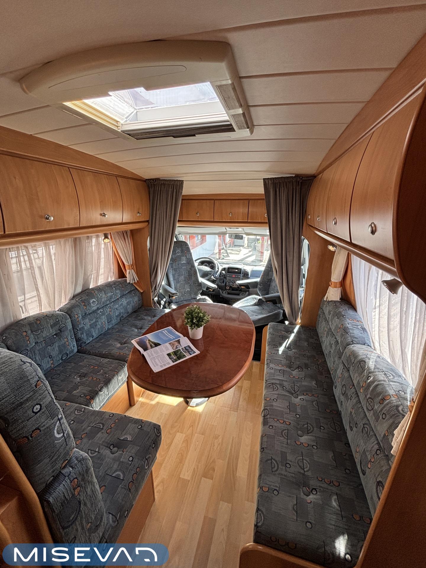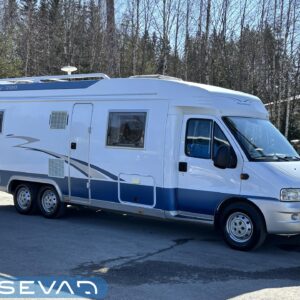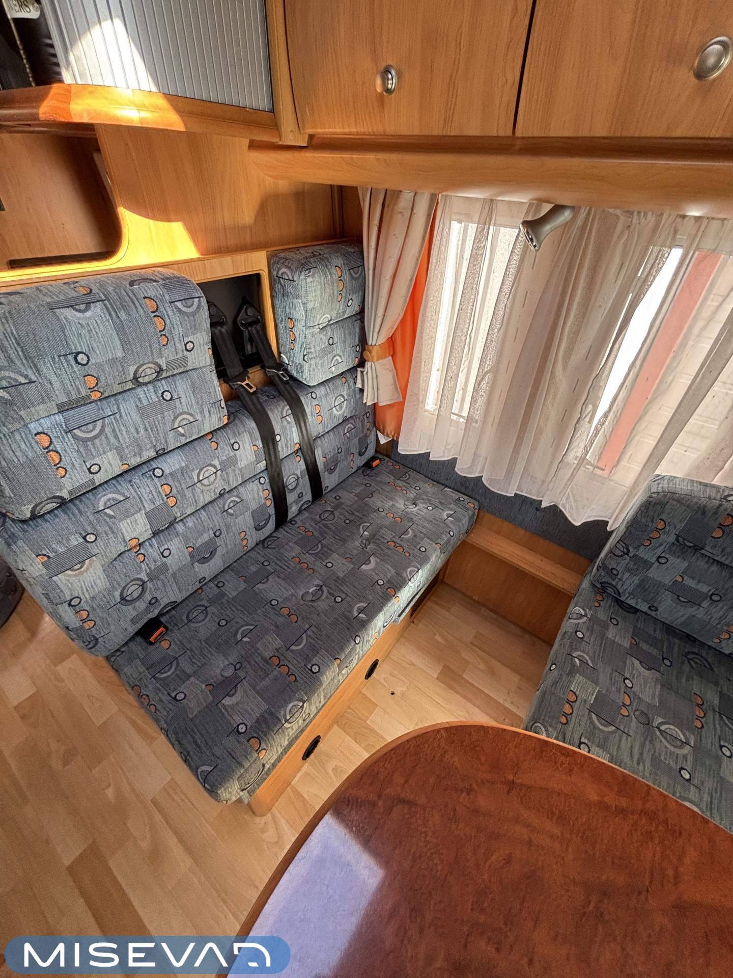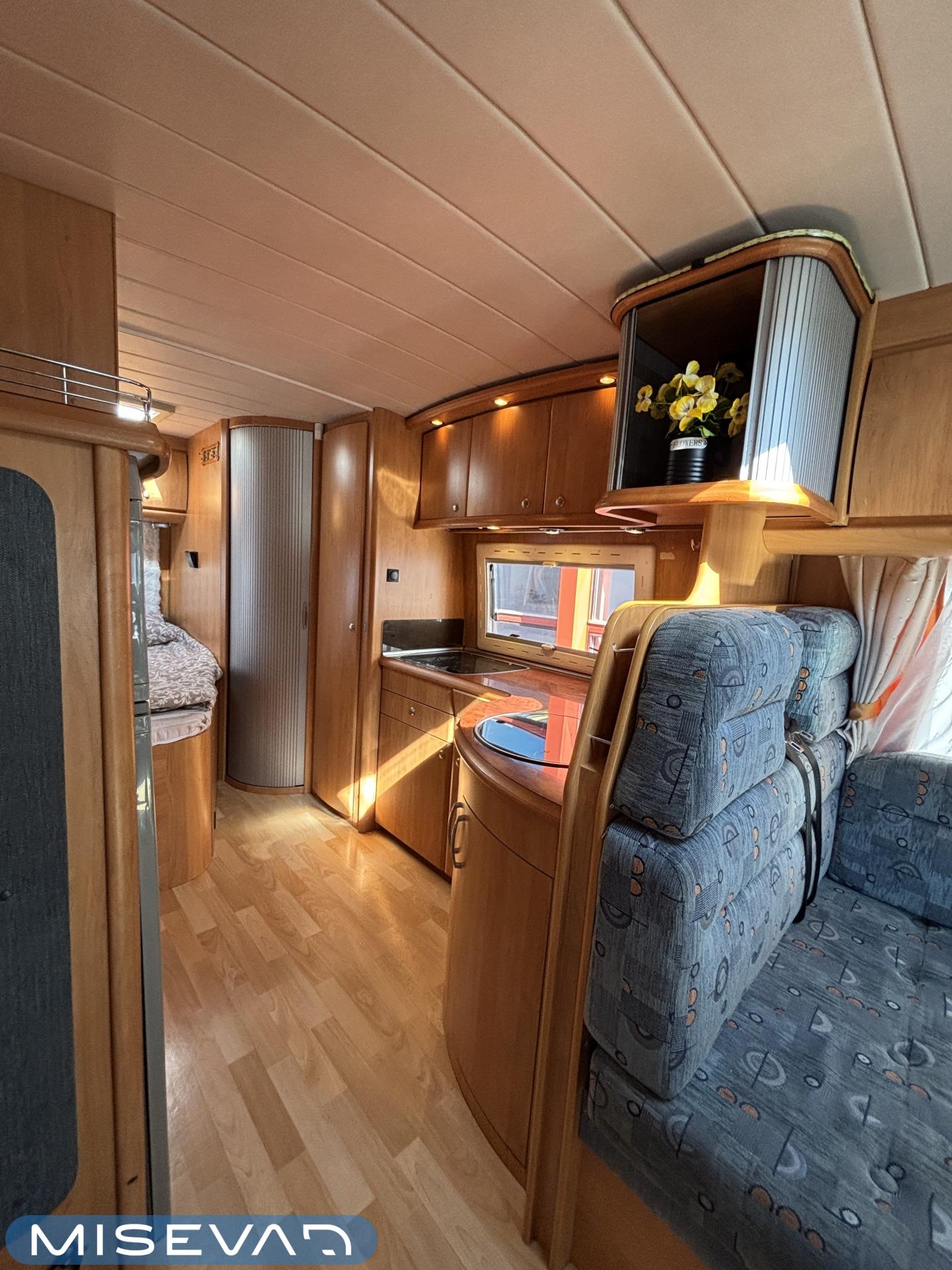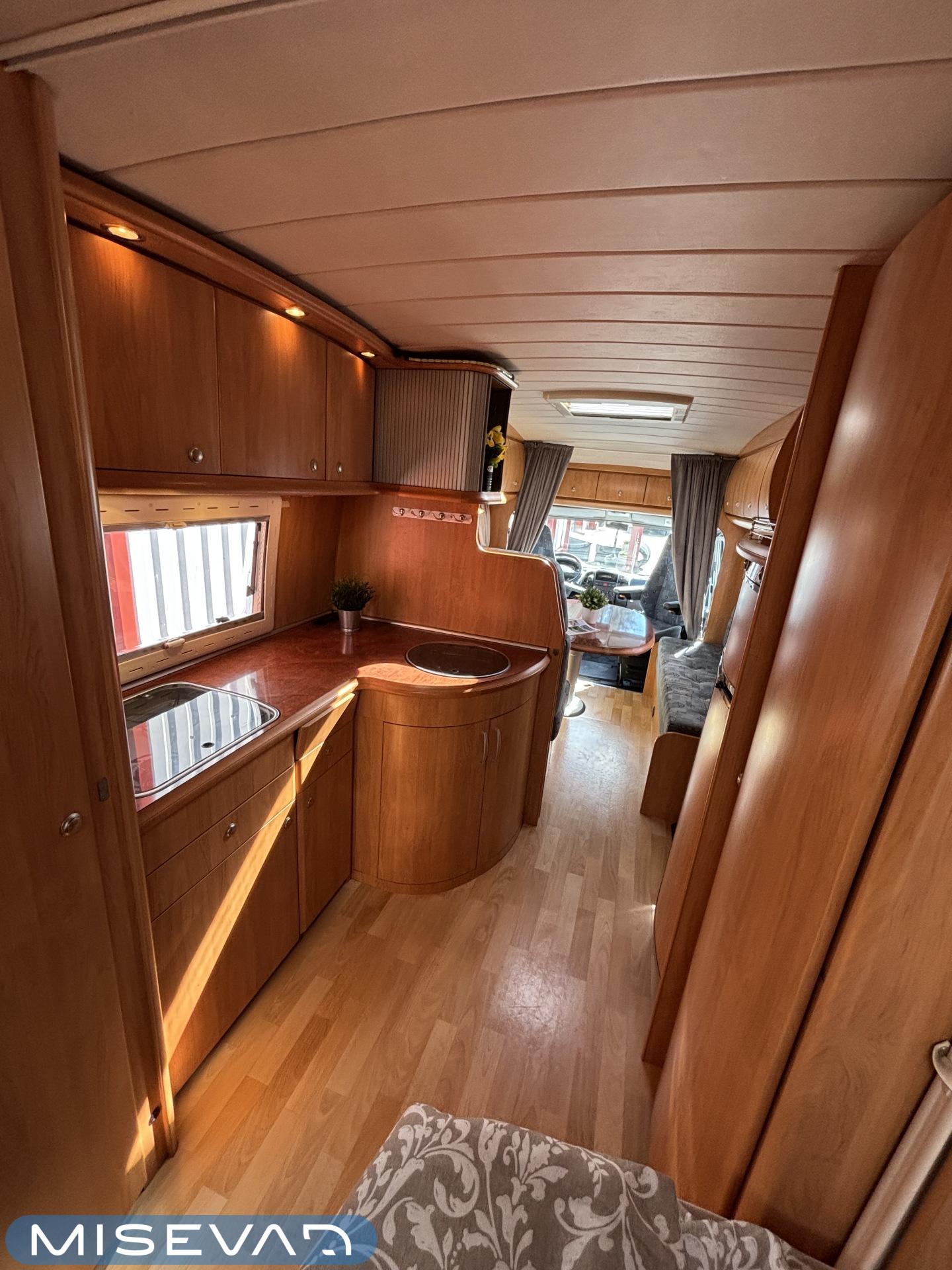 Hotellihuone pyörillä! Lähes kahdeksan metrin kokonaispituuden omaava aikansa legenda ja vieläpä ihan kohtuullisen ajomäärän omaavana. Pöytäryhmän ympärille mahtuu isompikin porukka lyömään korttia ja parantamaan maailmaa. Melkoisen hienossa kunnossa säilynyt visuaalisesti, etenkin sisätiloiltaan. Eikä tuo nyt hassumpi ole ulkohipiältäänkään. Tilaa on ruhtinaallisesti, etenkin säilytystiloja, eli voisi toimittaa hienosti vaikkapa pidempiaikaisemmankin majapaikan virkaa. Auton takaosa on makkari / kylppäritiloja missä suihku on omana erillisenä tilanaan. Keskelle sijoittuu L-keittiö, pari isompaa pystykaappia ja tilava jääkaapi/pakastin yhdistelmä. Keittiötaso tarjoilee mukavasti laskutilaa esim. kahvinkeittimelle / leivänpaahtimelle / airfryerille. Etuosahan on sitten olohuonetta. Molemmin puolin on isot sivusohvat ja taittopöytä keskellä. Tähän yhdistyvät vielä kääntyvät ohjaamon penkit, eli isommankin ryhmän illanistujaiset ovat mahdolliset. Ohjaamosta löytyy mm. ilmastointi, sekä vakionopeuden säädin. Autohan on neljälle rekisteröity ja neljälle löytyy myös vyöpaikat. Sohvaryhmästä saadaan pitkittäissuuntaiset vuoteet kooltaan 160X65 ja 190X65. Lisäksi pöytä on laskettavaa mallia. Auto on ajamiseen vaaditaan vähintään C1-luokan ajokortti. Näitä ei ole liikaa tarjolla … kuka kerkeää???