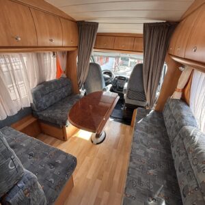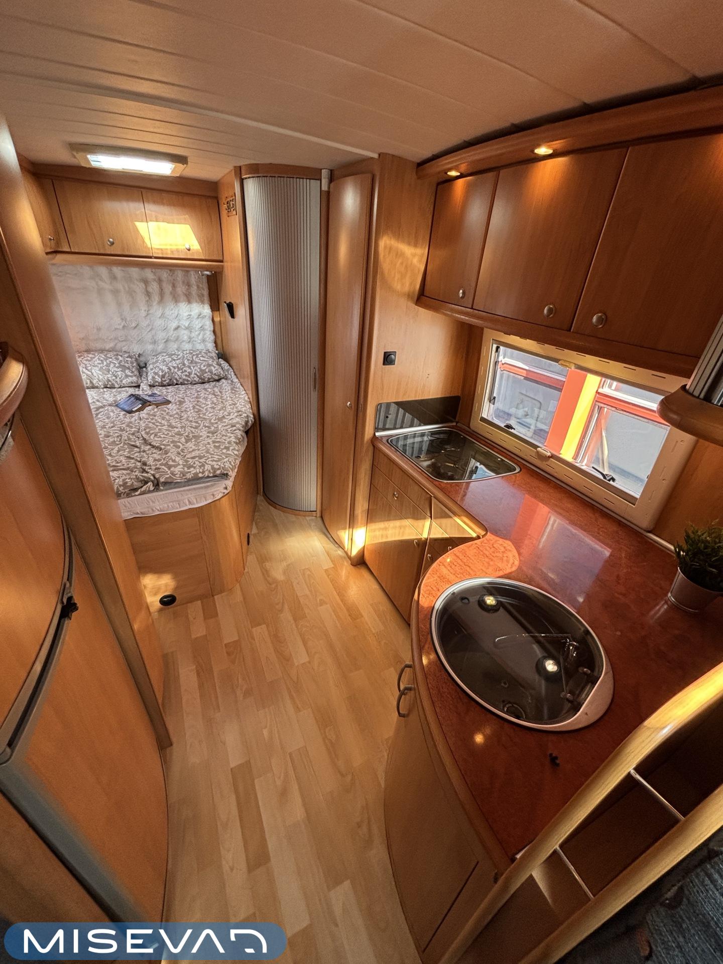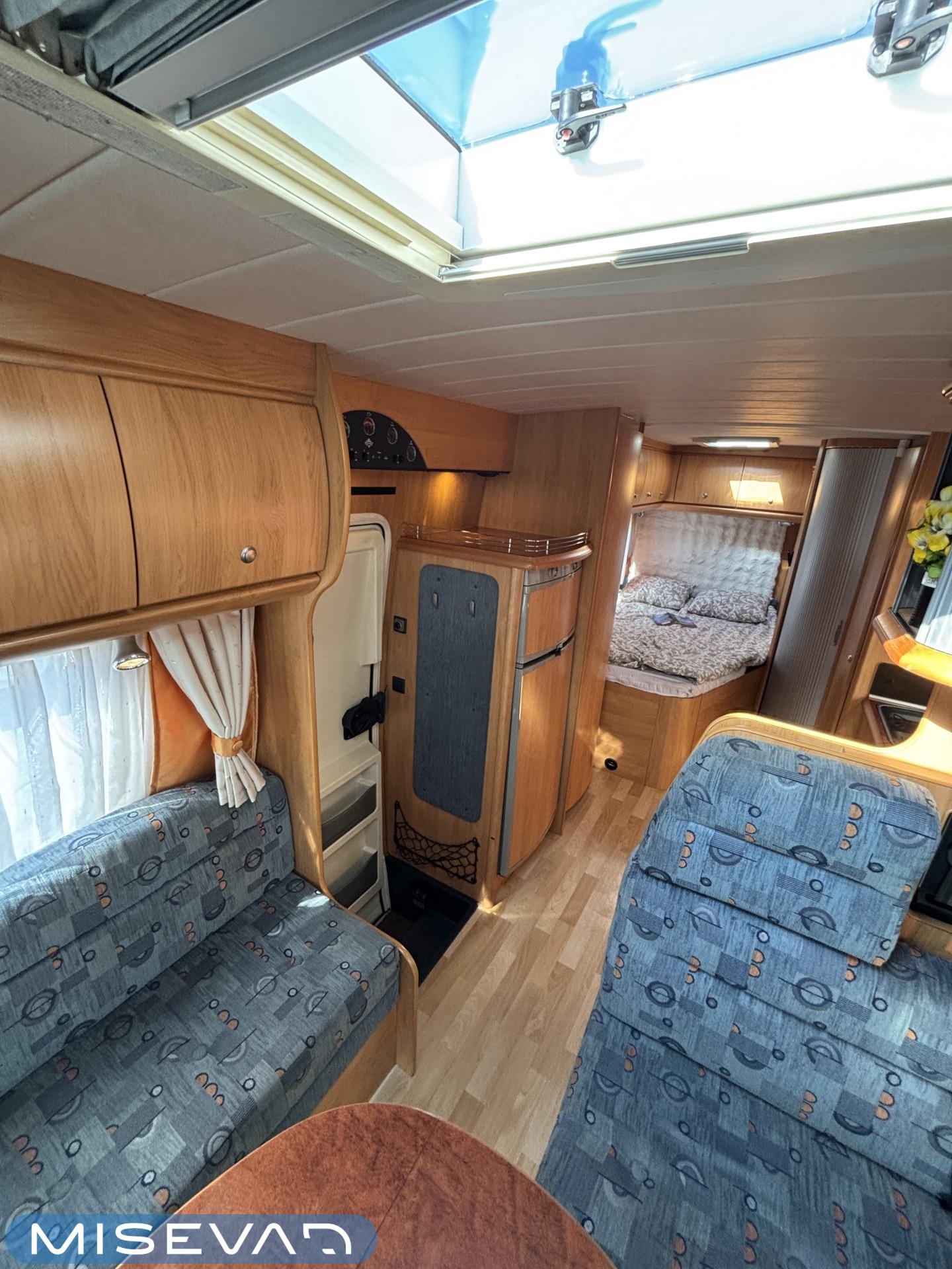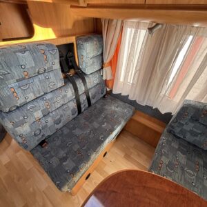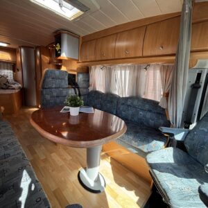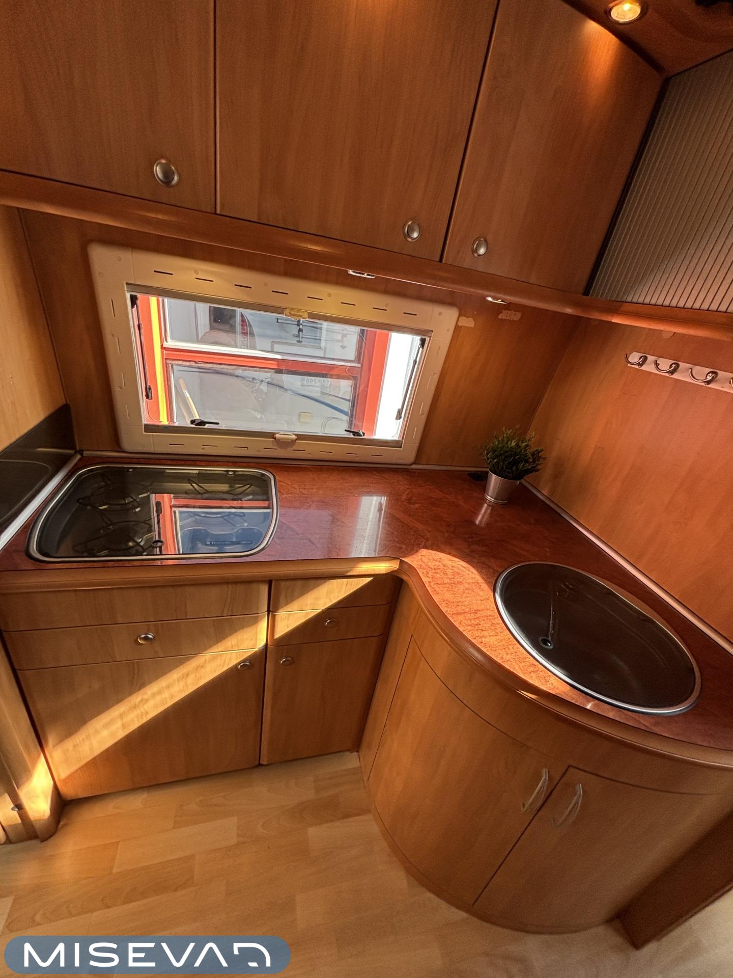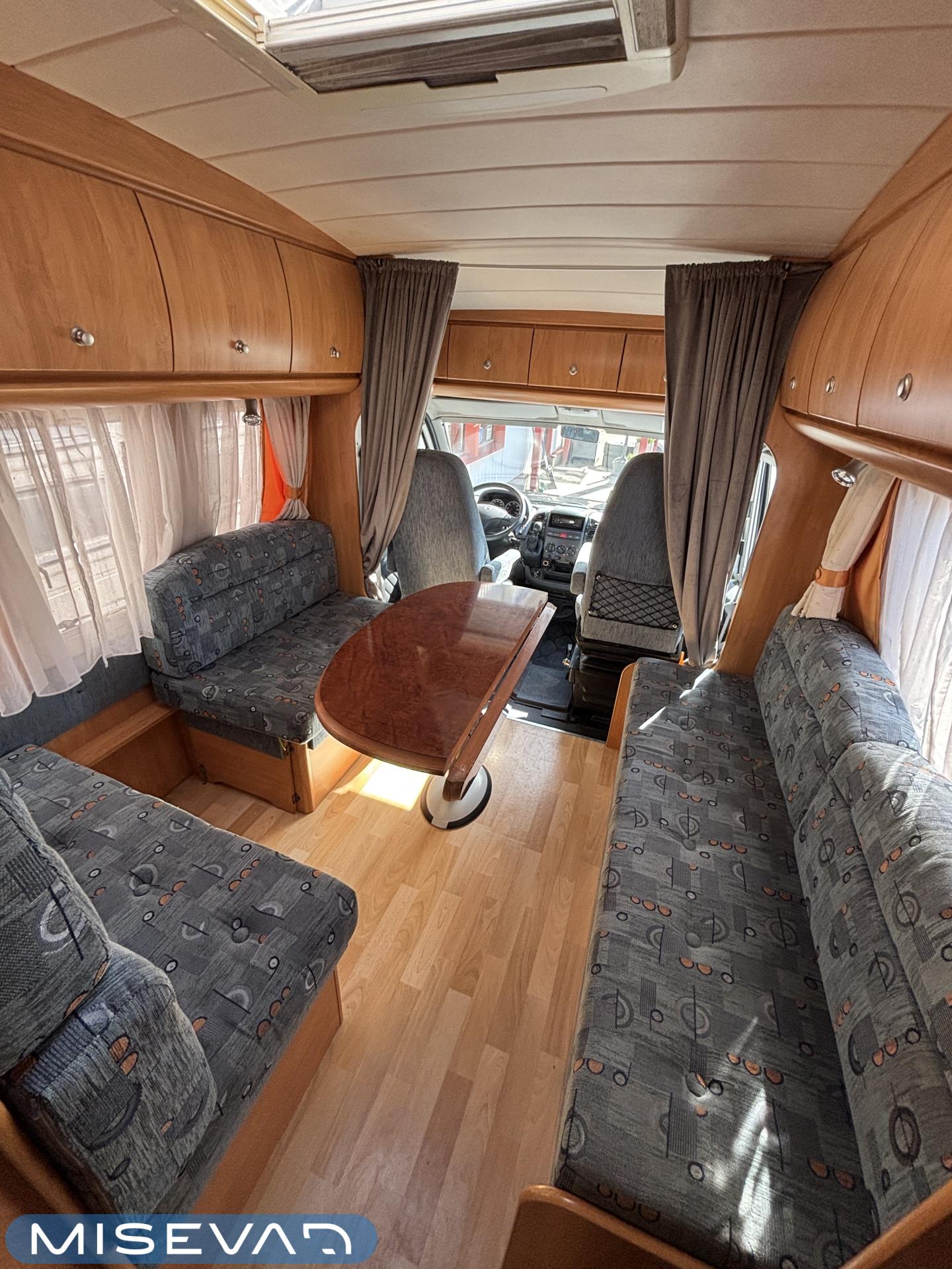 Hotellihuone pyörillä! Lähes kahdeksan metrin kokonaispituuden omaava aikansa legenda ja vieläpä ihan kohtuullisen ajomäärän omaavana. Pöytäryhmän ympärille mahtuu isompikin porukka lyömään korttia ja parantamaan maailmaa. Melkoisen hienossa kunnossa säilynyt visuaalisesti, etenkin sisätiloiltaan. Eikä tuo nyt hassumpi ole ulkohipiältäänkään. Tilaa on ruhtinaallisesti, etenkin säilytystiloja, eli voisi toimittaa hienosti vaikkapa pidempiaikaisemmankin majapaikan virkaa. Auton takaosa on makkari / kylppäritiloja missä suihku on omana erillisenä tilanaan. Keskelle sijoittuu L-keittiö, pari isompaa pystykaappia ja tilava jääkaapi/pakastin yhdistelmä. Keittiötaso tarjoilee mukavasti laskutilaa esim. kahvinkeittimelle / leivänpaahtimelle / airfryerille. Etuosahan on sitten olohuonetta. Molemmin puolin on isot sivusohvat ja taittopöytä keskellä. Tähän yhdistyvät vielä kääntyvät ohjaamon penkit, eli isommankin ryhmän illanistujaiset ovat mahdolliset. Ohjaamosta löytyy mm. ilmastointi, sekä vakionopeuden säädin. Autohan on neljälle rekisteröity ja neljälle löytyy myös vyöpaikat. Sohvaryhmästä saadaan pitkittäissuuntaiset vuoteet kooltaan 160X65 ja 190X65. Lisäksi pöytä on laskettavaa mallia. Auto on ajamiseen vaaditaan vähintään C1-luokan ajokortti. Näitä ei ole liikaa tarjolla … kuka kerkeää???