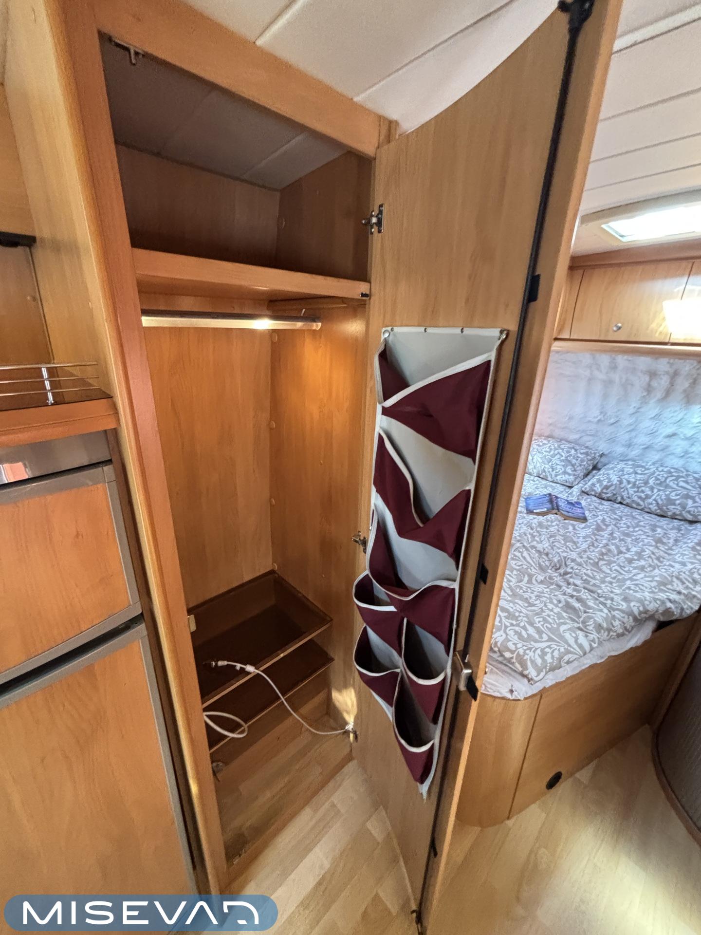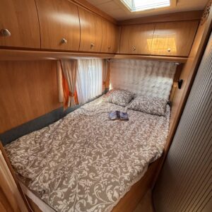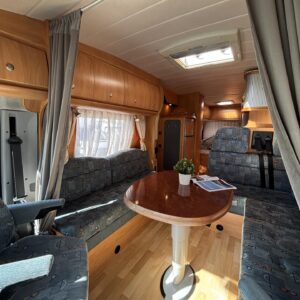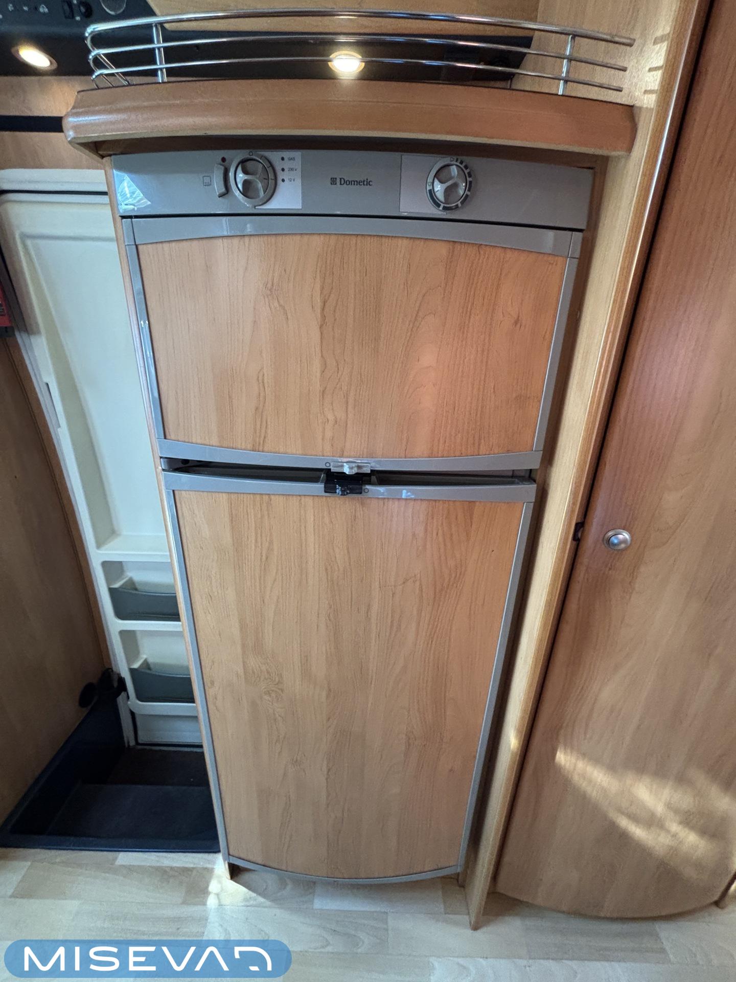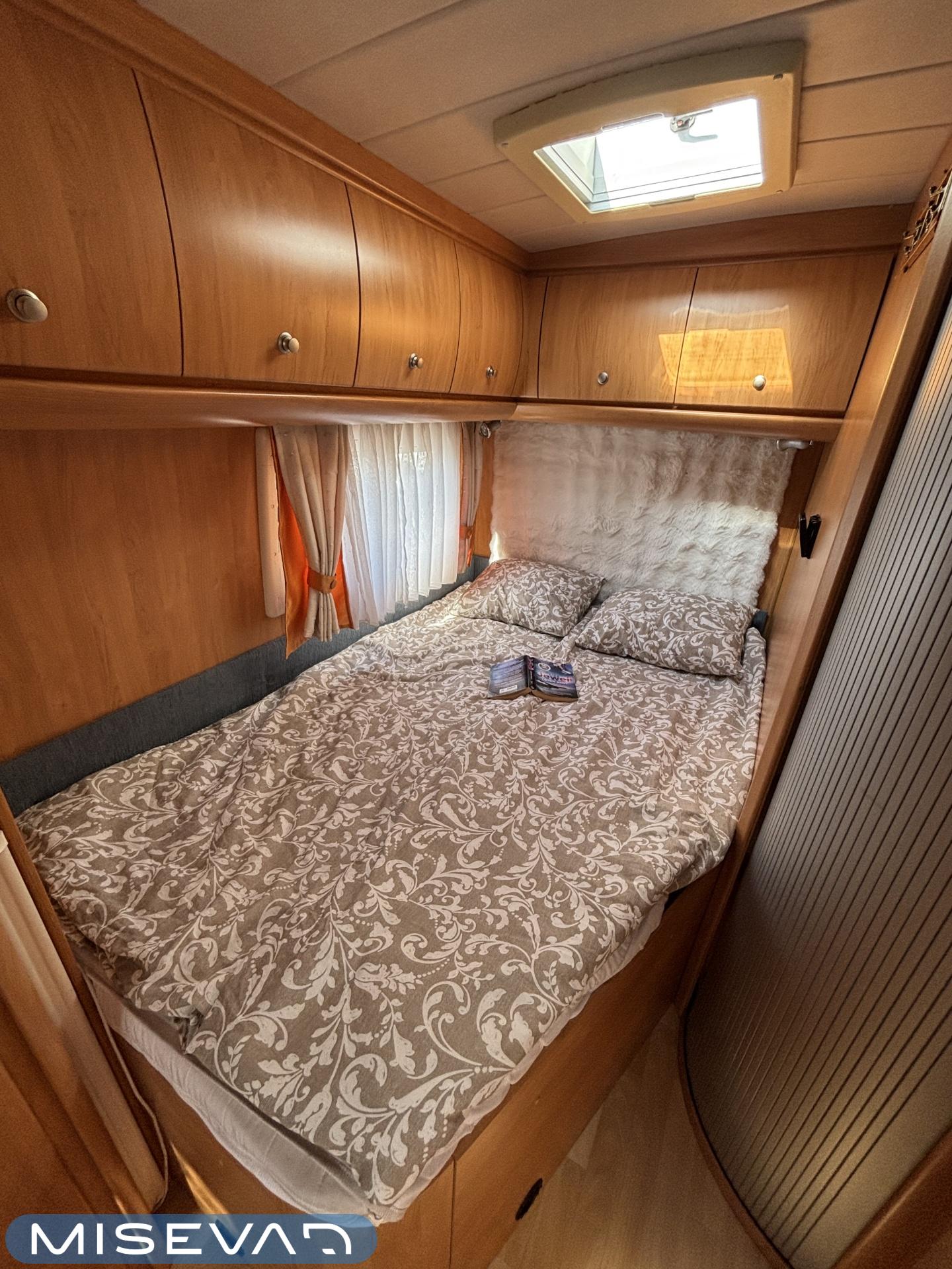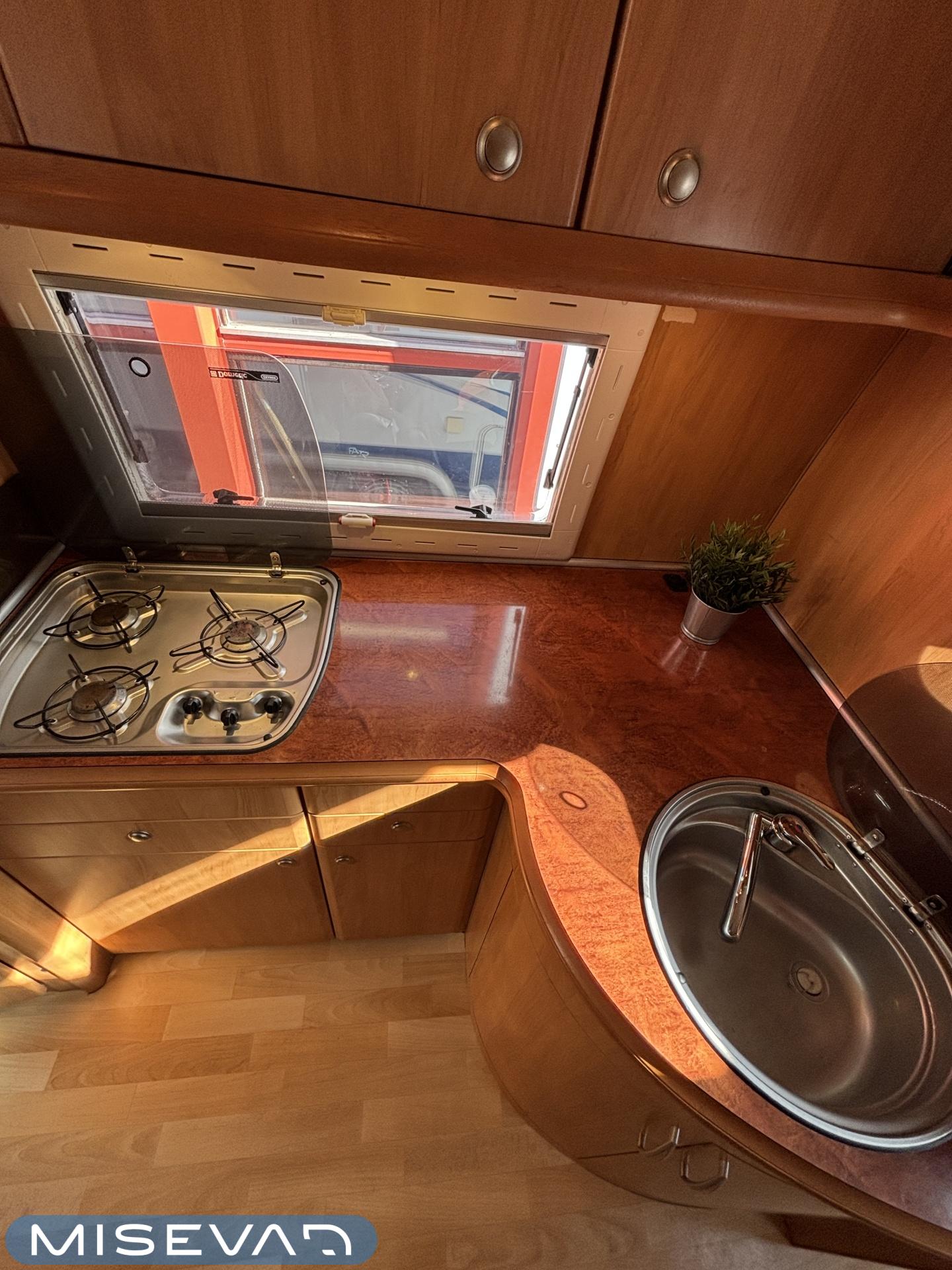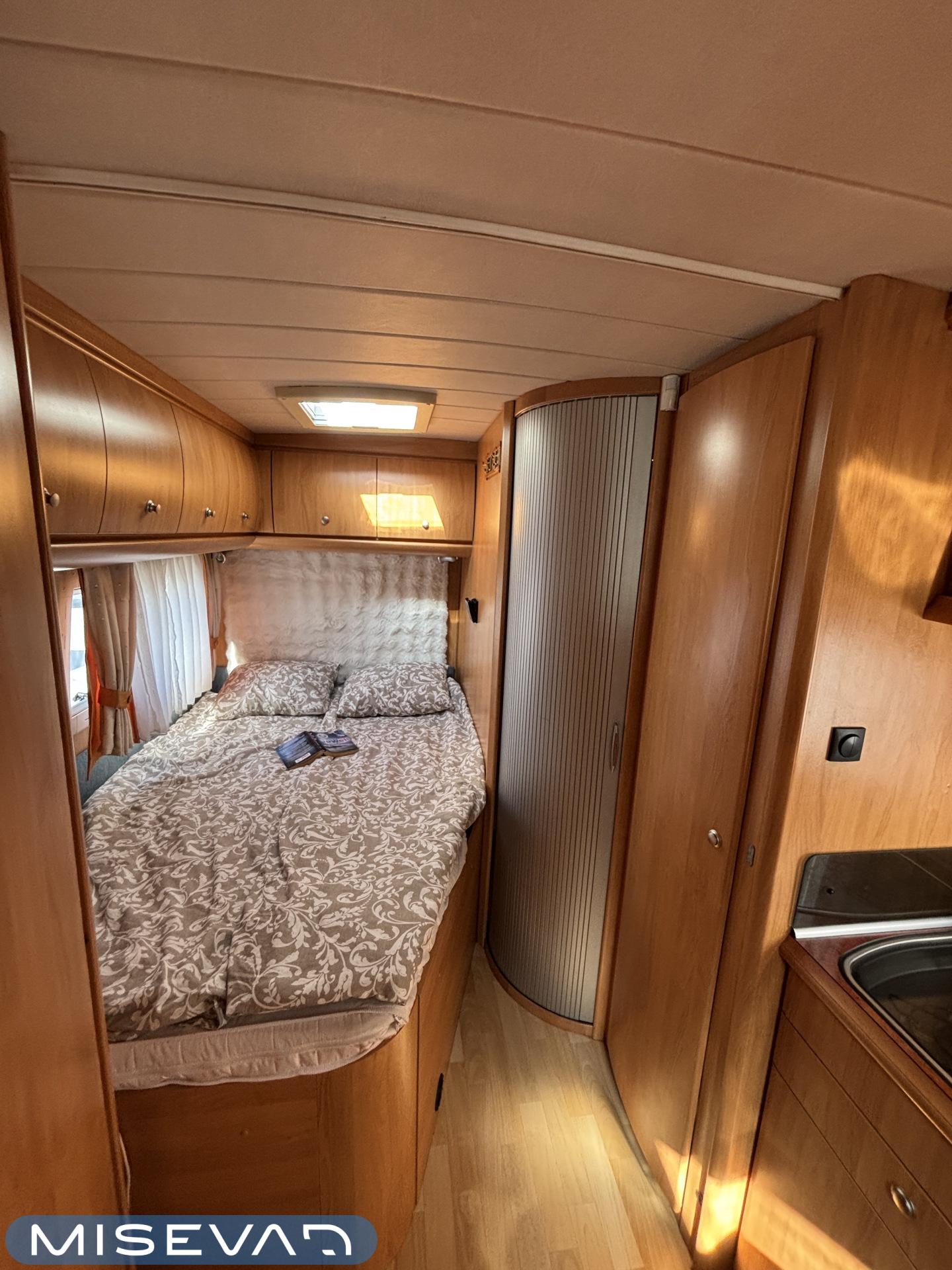 Hotellihuone pyörillä! Lähes kahdeksan metrin kokonaispituuden omaava aikansa legenda ja vieläpä ihan kohtuullisen ajomäärän omaavana. Pöytäryhmän ympärille mahtuu isompikin porukka lyömään korttia ja parantamaan maailmaa. Melkoisen hienossa kunnossa säilynyt visuaalisesti, etenkin sisätiloiltaan. Eikä tuo nyt hassumpi ole ulkohipiältäänkään. Tilaa on ruhtinaallisesti, etenkin säilytystiloja, eli voisi toimittaa hienosti vaikkapa pidempiaikaisemmankin majapaikan virkaa. Auton takaosa on makkari / kylppäritiloja missä suihku on omana erillisenä tilanaan. Keskelle sijoittuu L-keittiö, pari isompaa pystykaappia ja tilava jääkaapi/pakastin yhdistelmä. Keittiötaso tarjoilee mukavasti laskutilaa esim. kahvinkeittimelle / leivänpaahtimelle / airfryerille. Etuosahan on sitten olohuonetta. Molemmin puolin on isot sivusohvat ja taittopöytä keskellä. Tähän yhdistyvät vielä kääntyvät ohjaamon penkit, eli isommankin ryhmän illanistujaiset ovat mahdolliset. Ohjaamosta löytyy mm. ilmastointi, sekä vakionopeuden säädin. Autohan on neljälle rekisteröity ja neljälle löytyy myös vyöpaikat. Sohvaryhmästä saadaan pitkittäissuuntaiset vuoteet kooltaan 160X65 ja 190X65. Lisäksi pöytä on laskettavaa mallia. Auto on ajamiseen vaaditaan vähintään C1-luokan ajokortti. Näitä ei ole liikaa tarjolla … kuka kerkeää???