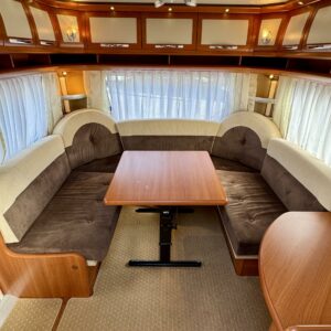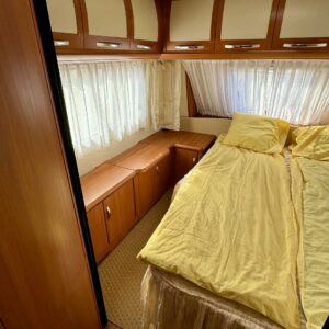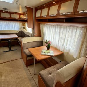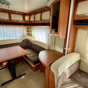 Mukavat tilat tarjoava Hobbyn teliakselinen matkailuvaunu. Vaunun etuosaan on sijoitettu makuuhuone pitkittäisellä parivuoteella. Tämä tila saadaan ”rauhoitettua” omaksi tilakseen välioven avulla. Heti makuuhuoneen vieressä on WC/kylpyhuonetilat, sekä säilytystiloja. Keskeltä vaunua löytyy keittiö normaalilla matkailuvaunun keittiövarustuksella. Jääkaappi on tilava ja siinä on erillinen pakastinlokero. Keskeltä löytyy myös vastakkain istuttava pöytäryhmä mistä saadaan tarvittaessa sijattua vuode yhdelle henkilölle. Vaunun takaosa on pyhitetty runsaan kokoiselle U-ryhmälle ja tämähän taipuu tarvittaessa vuoteeksi kahdelle henkilölle. Lämmitysjärjestelmänä on Alden nestekeskuslämmitys ja tietysti sähkövastuksilla (sähköpatruuna) varustettuna. Mukavuusvarusteena on vielä sähköinen lattianlämmitys. Tarkastettu, hiljattain katsastettu vaunu valmiina uusiin seikkailuihin.