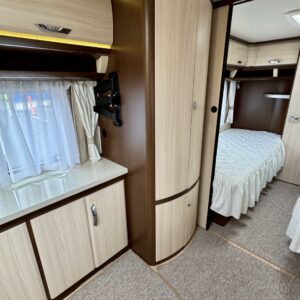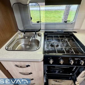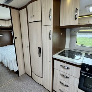 Vaunun keskivaiheilla on keittiö, joka tarjoa puitteet hiukan monimutkaisemmankin kattauksen valmistamiseen. Laskutilaa on runsaasti ja keittiön varustukseen kuuluu kaasulieden lisäksi iso jääkaappi- pakastin, kaasu- uuni ja liesituuletin.
