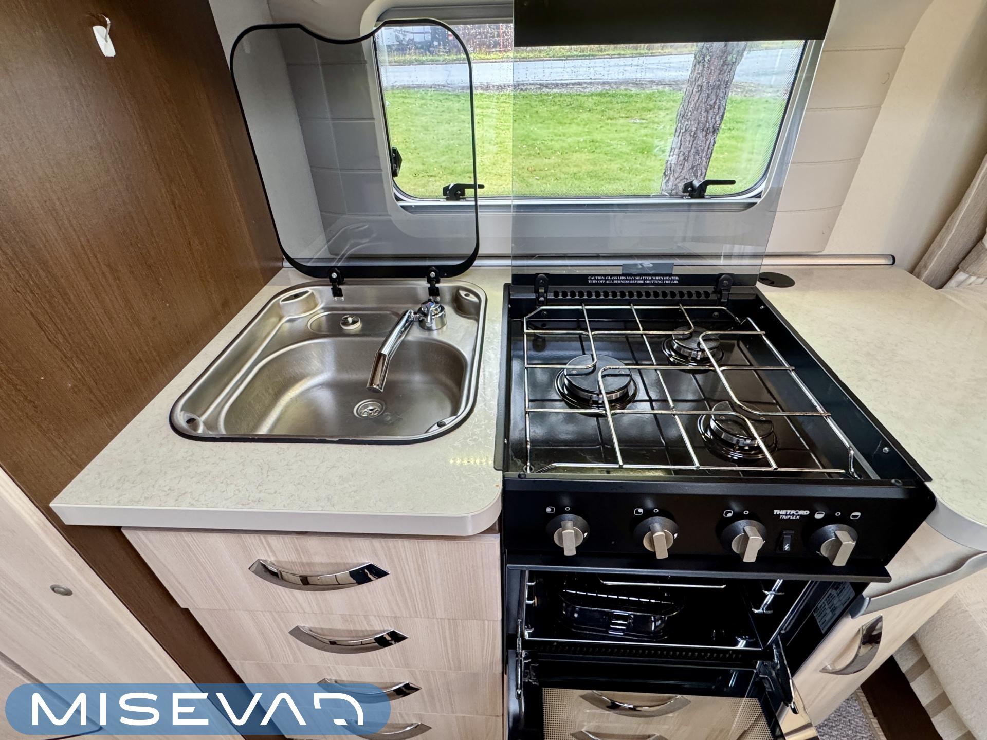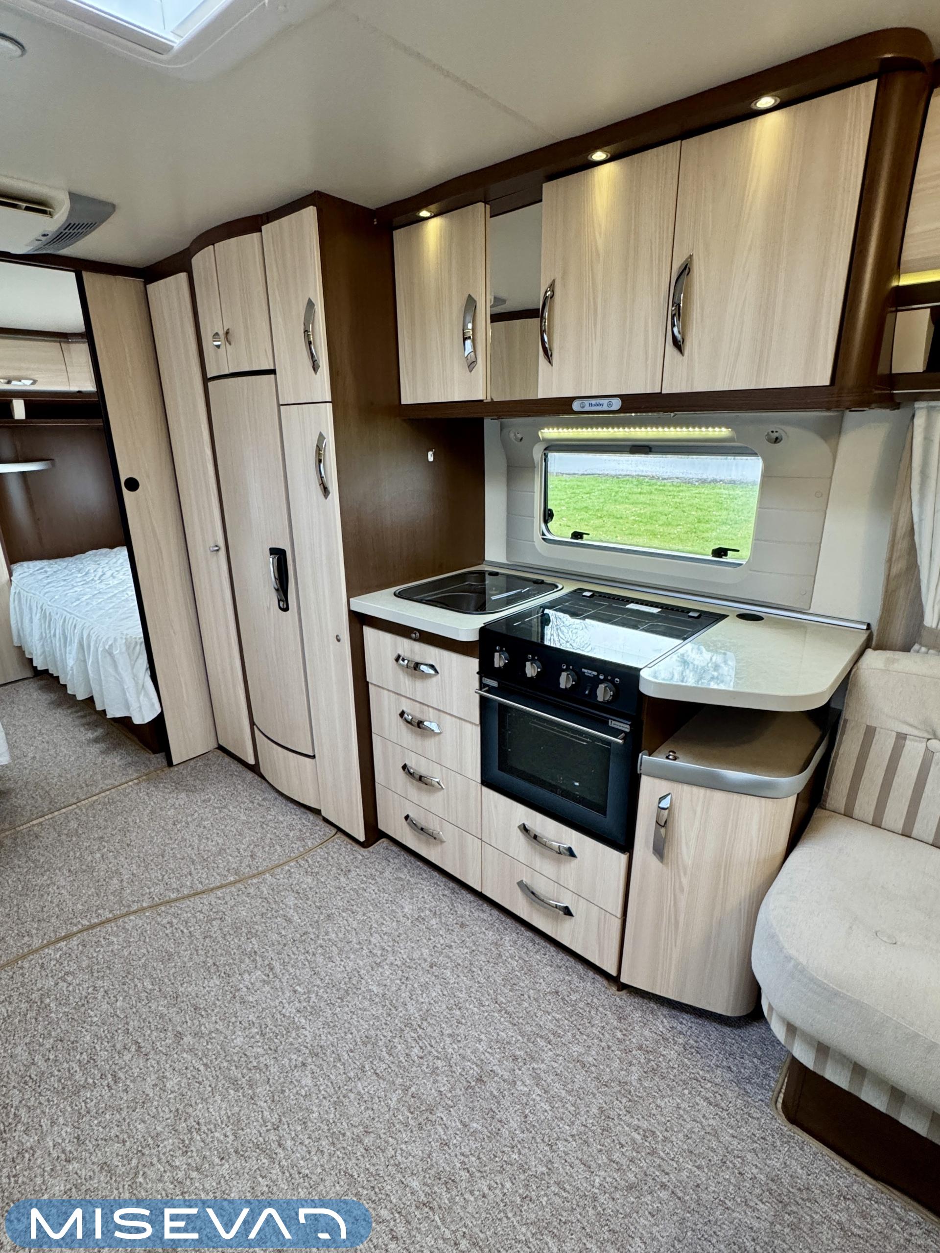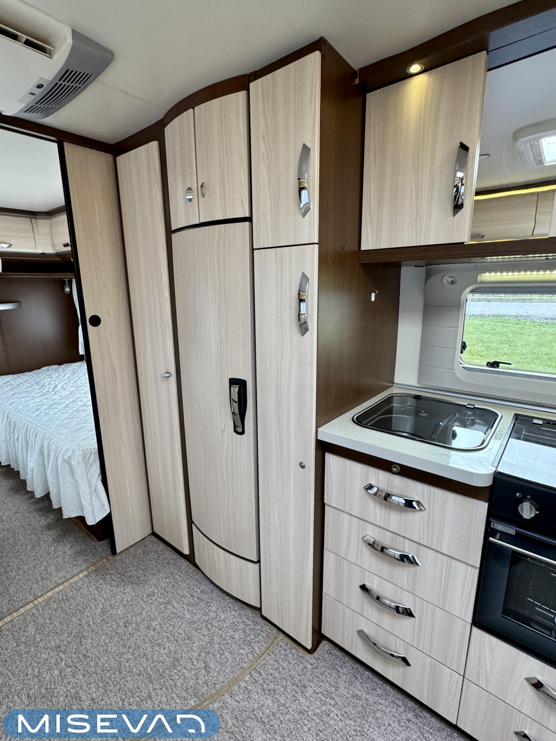 Vaunun keskivaiheilla on keittiö, joka tarjoa puitteet hiukan monimutkaisemmankin kattauksen valmistamiseen. Laskutilaa on runsaasti ja keittiön varustukseen kuuluu kaasulieden lisäksi iso jääkaappi- pakastin, kaasu- uuni ja liesituuletin.