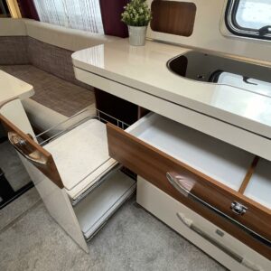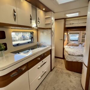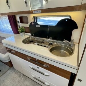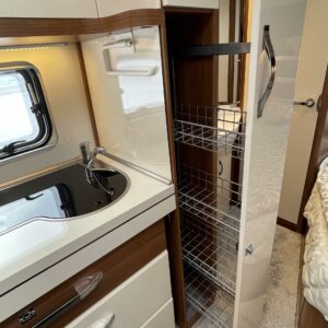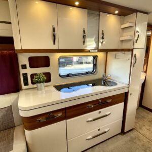 Keskeltä vaunua löytyy mukavasti laskutilaa tarjoava keittiösaareke, jonka varustukseen kuuluu korkean jääkaapin lisäksi liesituuletin.