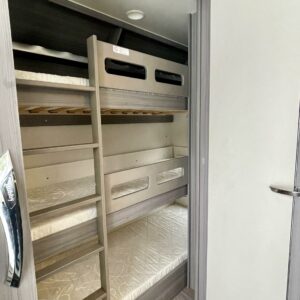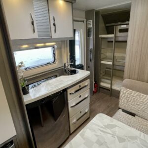 Todellinen tilaihme! Tähän näppärästi perässä kulkevaan matkakotiin mahtuu majoittumaan jopa seisemän henkilöä. Edessä on poikittainen parivuode minkä alle jää runsaasti säilytystilaa. Säilytystilan käyttöä päästään hyödyntämään myös ulkopuolelta luukun kautta. Keskelle vaunua on sijoitettu vastakkain istuttava pöytäryhmä mistä saadaan sijattua vuode kahdelle henkilölle. Toisella puolella on keittiö varusteltuna normaalilla matkailuvaunun keittiövarustuksella. Takaosaa hallitsee poikittain sijoitettu 3-kerrosvuode, sekä WC/kylpyhuonetilat. Iso kattoluukku antaa mukavasti luonnonvaloa sisätiloihin. Lämmityksenä Trumatic ilmakeskuslämmitys. Juuri katsastettu ja tarkastettu vaunu valmiina retkiin.