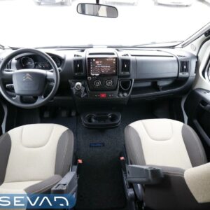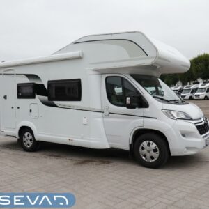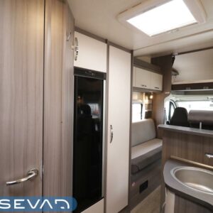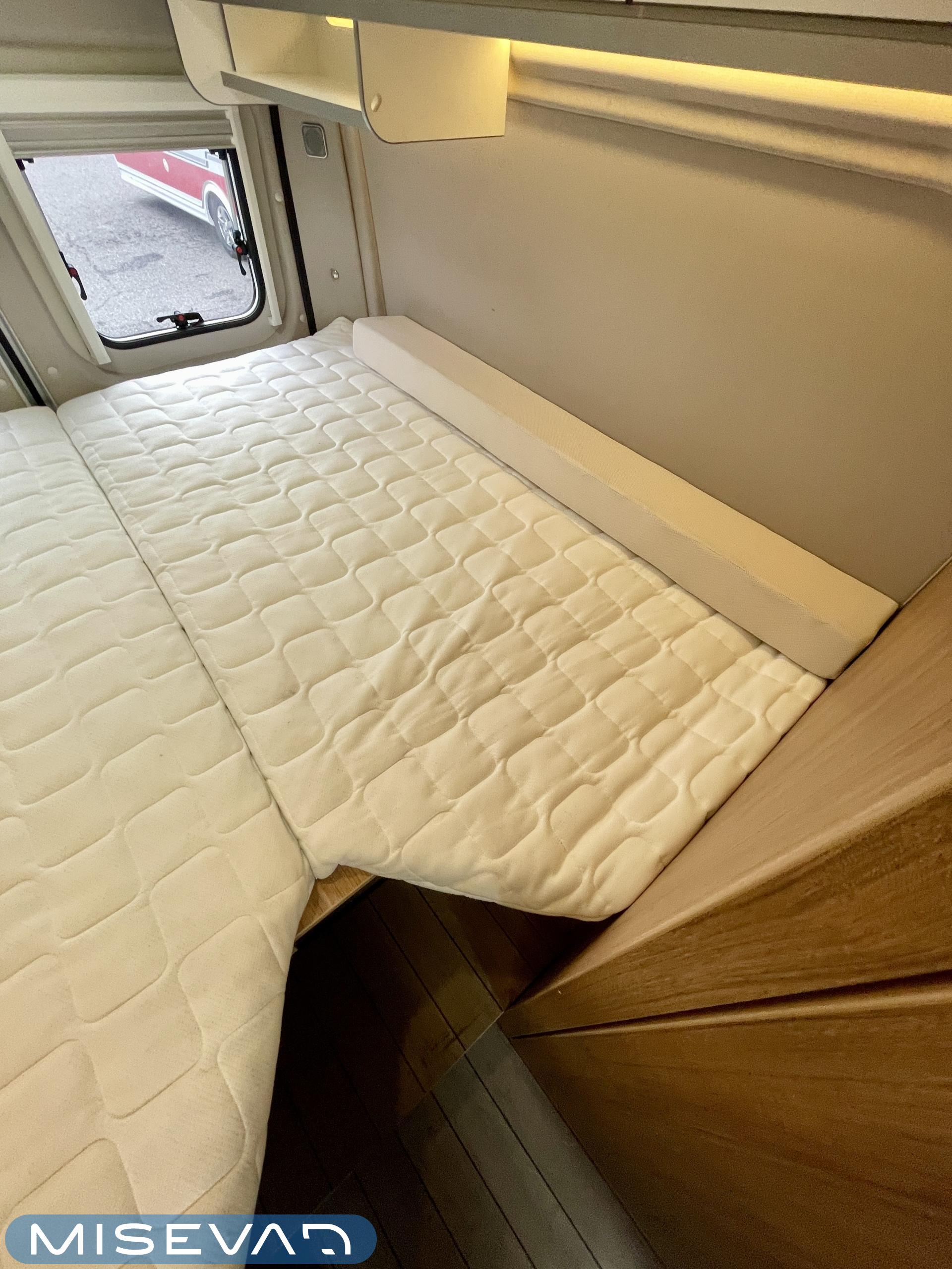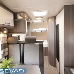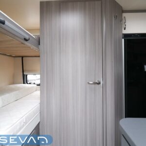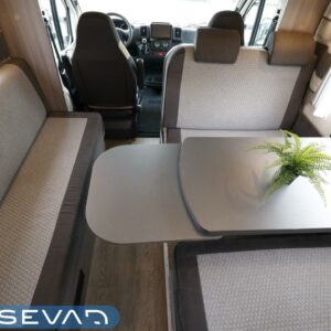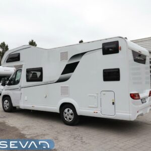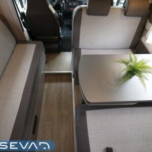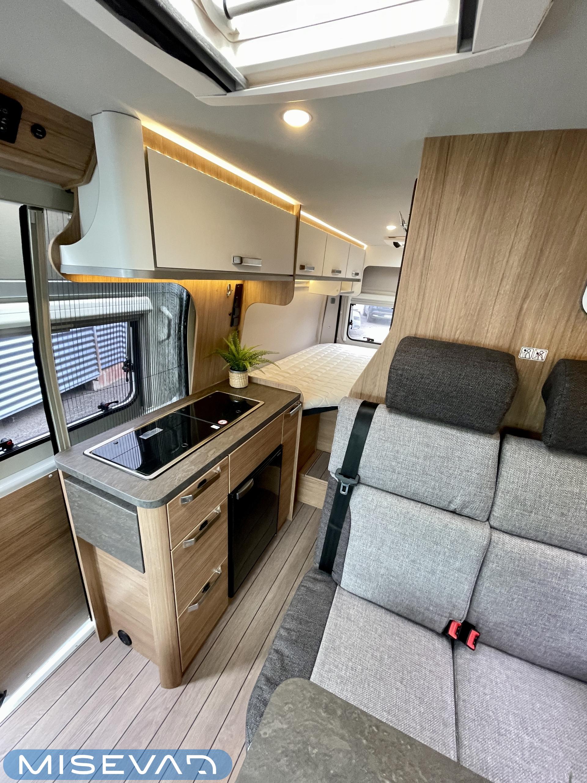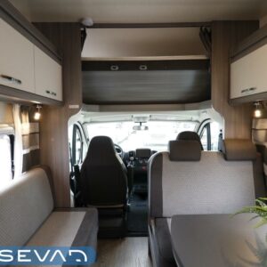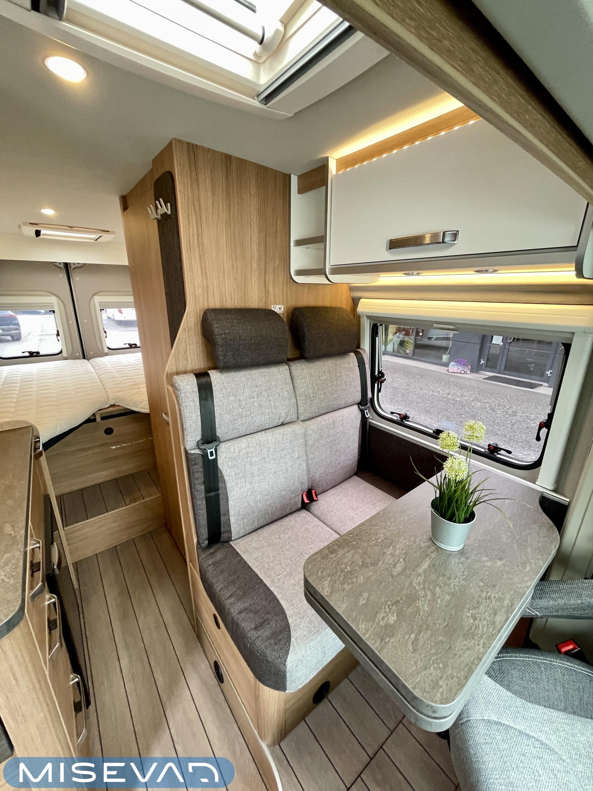Fiksulla tilankäytöllä tähän 7-metriseen autoon on saatu mahtumaan kaikki, mitä perhe matkallaan tarvitsee. Takaosan sisäänkäynnin vierestä löytyy 2-kerrosvuode, jonka alla on suuri takatalli kalusteille ja harrastusvälineille. Takaosassa sijaitsevat myös suihkulla varustettu kylpyhuone sekä L-mallinen keittiö. Auton keskiosassa on tilava pöytäryhmä pitkällä sivusohvalla, pöytäryhmästä saadaan sijattua lisävuode. Edessä hytin yläpuolella on tilava alkovi, jossa nukkuu kaksi aikuista mukavasti.