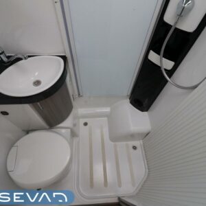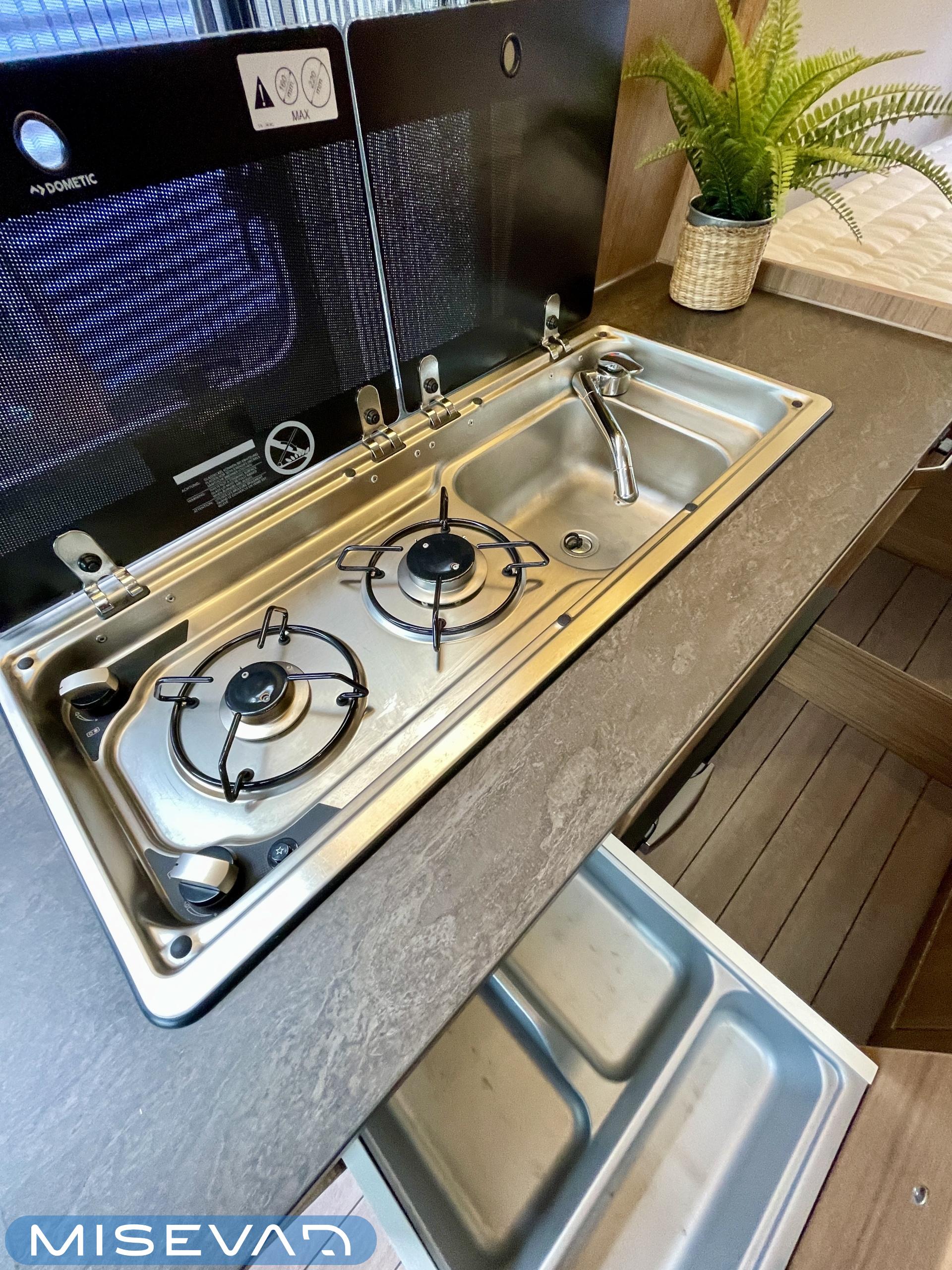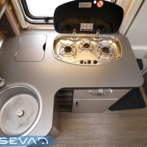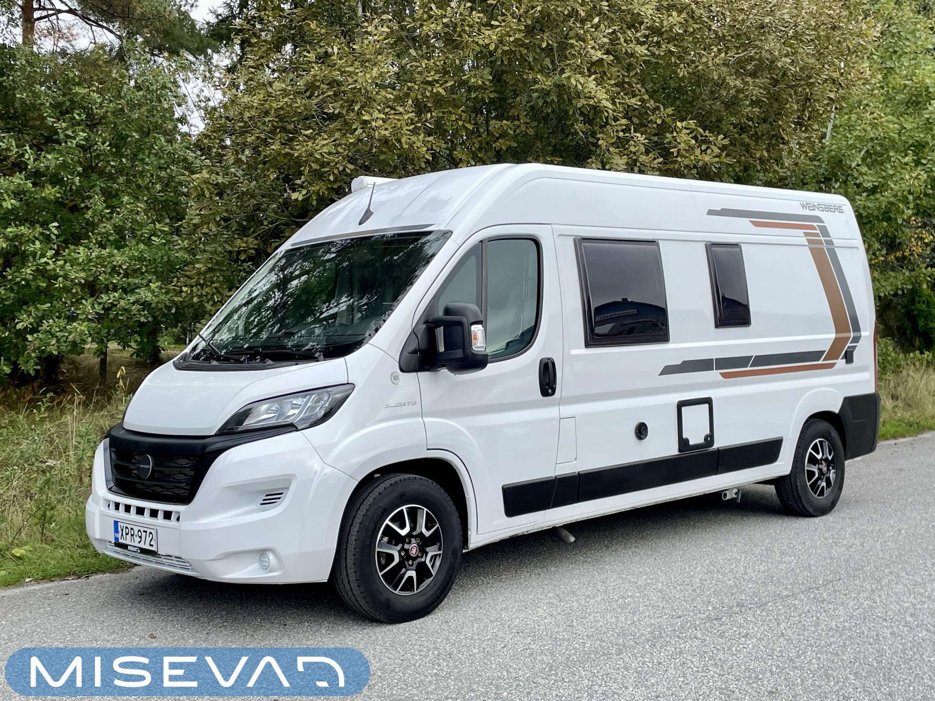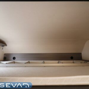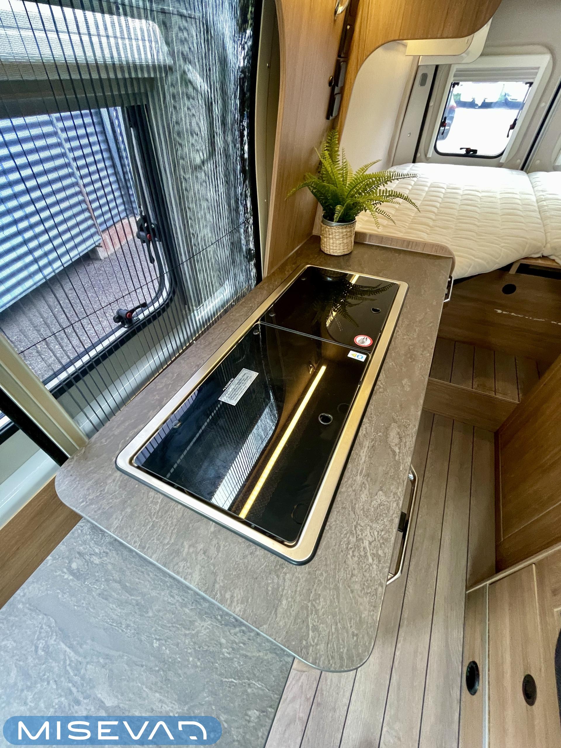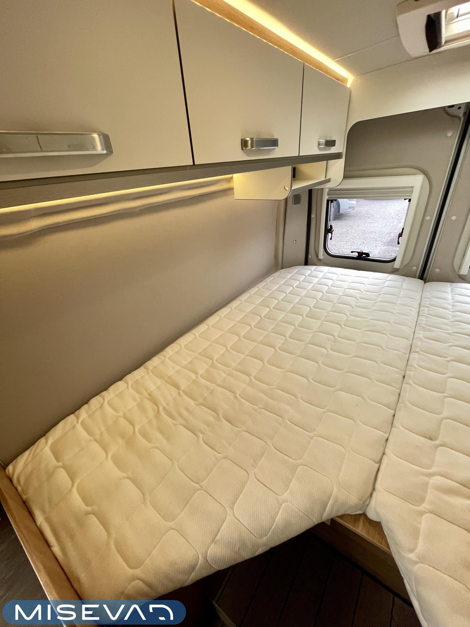 Fiksulla tilankäytöllä tähän 7-metriseen autoon on saatu mahtumaan kaikki, mitä perhe matkallaan tarvitsee. Takaosan sisäänkäynnin vierestä löytyy 2-kerrosvuode, jonka alla on suuri takatalli kalusteille ja harrastusvälineille. Takaosassa sijaitsevat myös suihkulla varustettu kylpyhuone sekä L-mallinen keittiö. Auton keskiosassa on tilava pöytäryhmä pitkällä sivusohvalla, pöytäryhmästä saadaan sijattua lisävuode. Edessä hytin yläpuolella on tilava alkovi, jossa nukkuu kaksi aikuista mukavasti.