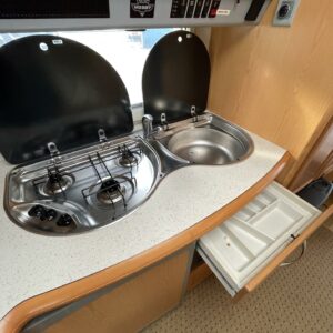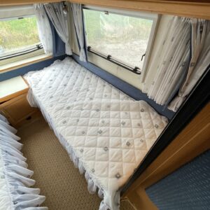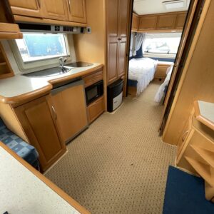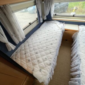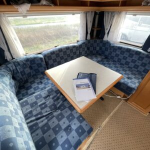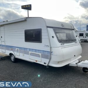 Kattoluukku, Pesuallas, Liesi, Lämminvesiboileri, Kasetti WC, Kasettiverhot, Trumatic, Pakastelokero, Erillisvuoteet, Jääkaappi, Lattiamatot asunto-osassa, Mikroaaltouuni, Pussimarkiisi