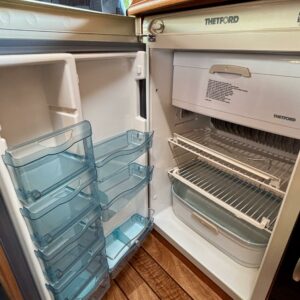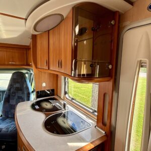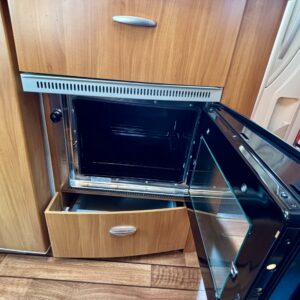 Auton etuosassa on viihtyisän ja valoisa pöytäryhmän lisäksi keittiösaareke, jonka varustukseen kuuluu jääkaapin ja kaasulieden lisäksi kaasu- uuni.
