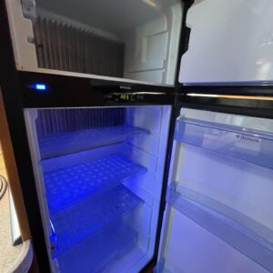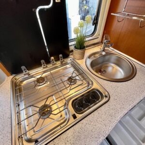 Keittiöstä löytyy kaasuhella ja liesi sekä kunnollinen jääkaappi-pakastinyhdistelmä, joten ruoanlaitto onnistuu missä tahansa. Ateriat nautitaan viihtyisässä ja tilavassa istuinryhmässä tai kesäpäivinä valtavan markiisin alla.