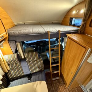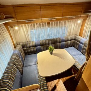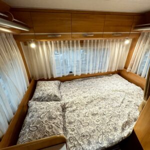 Runsaat tilat tarjoava alkovi Hymeri. Tämä on koostaan huolimatta B-kortilla ohjastettava auto, eli kokonaismassa rajoittuu 3500 kiloon. Auton takaosasta löytyy maukas U-ryhmä illanistujaisiin. Keskelle on asenmoitu keittiö, sekä WC/kylpuhuonetilat. Keittössä on mukavasti säilytys ja laskutilaa tavaroille. Kylppärissä on suihkulle oma tilansa. Etuosaa hallitsee vastakkain istuttava pöytäryhmä ja tästä saadaan sijattua tarvittaessa vuode kahdelle hengelle. Ohjaamon päällä on vielä alkovivuode minne saadaan majoitettua pari yöpyjää. Läämmitysjärjestelmänä Trumaticin ilmakeskuslämmitys sähkövastuksilla (sähköpatruuna) varustettuna.