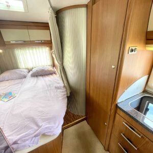 Pitkittäinen parivuode ja erillisellä suihkunurkkauksella varustettu pesuhuone/ WC ovat auton peräpäässä.