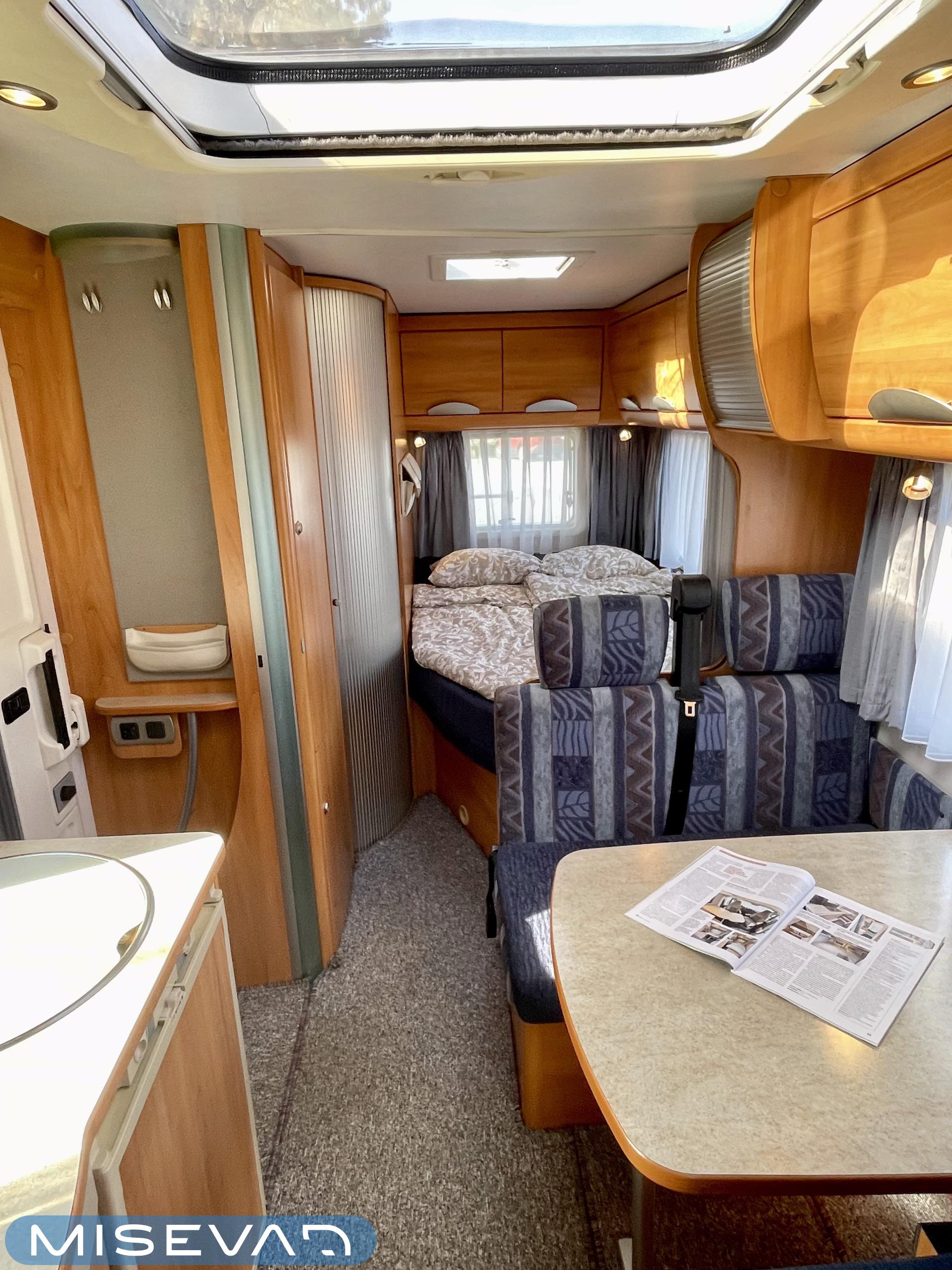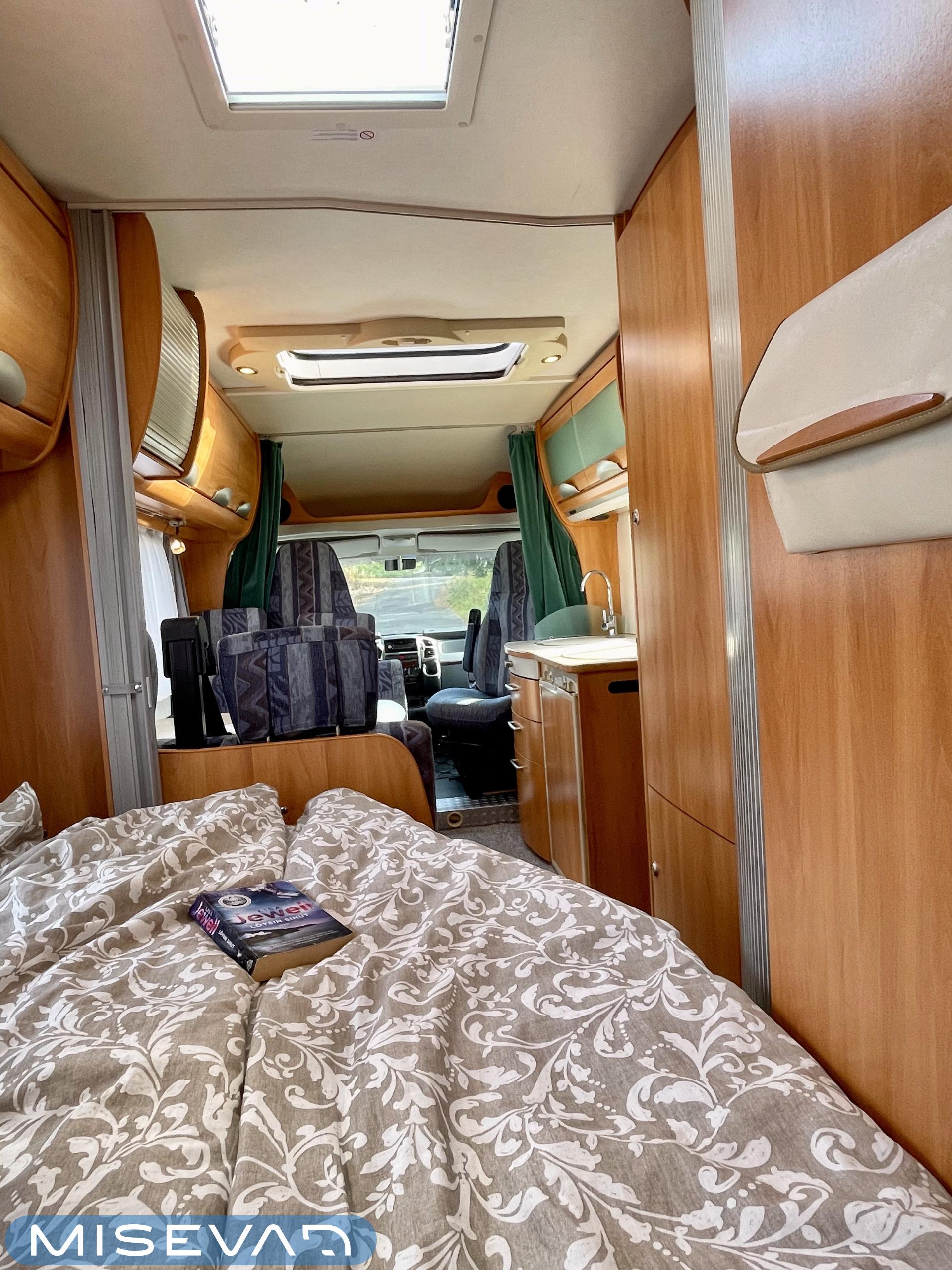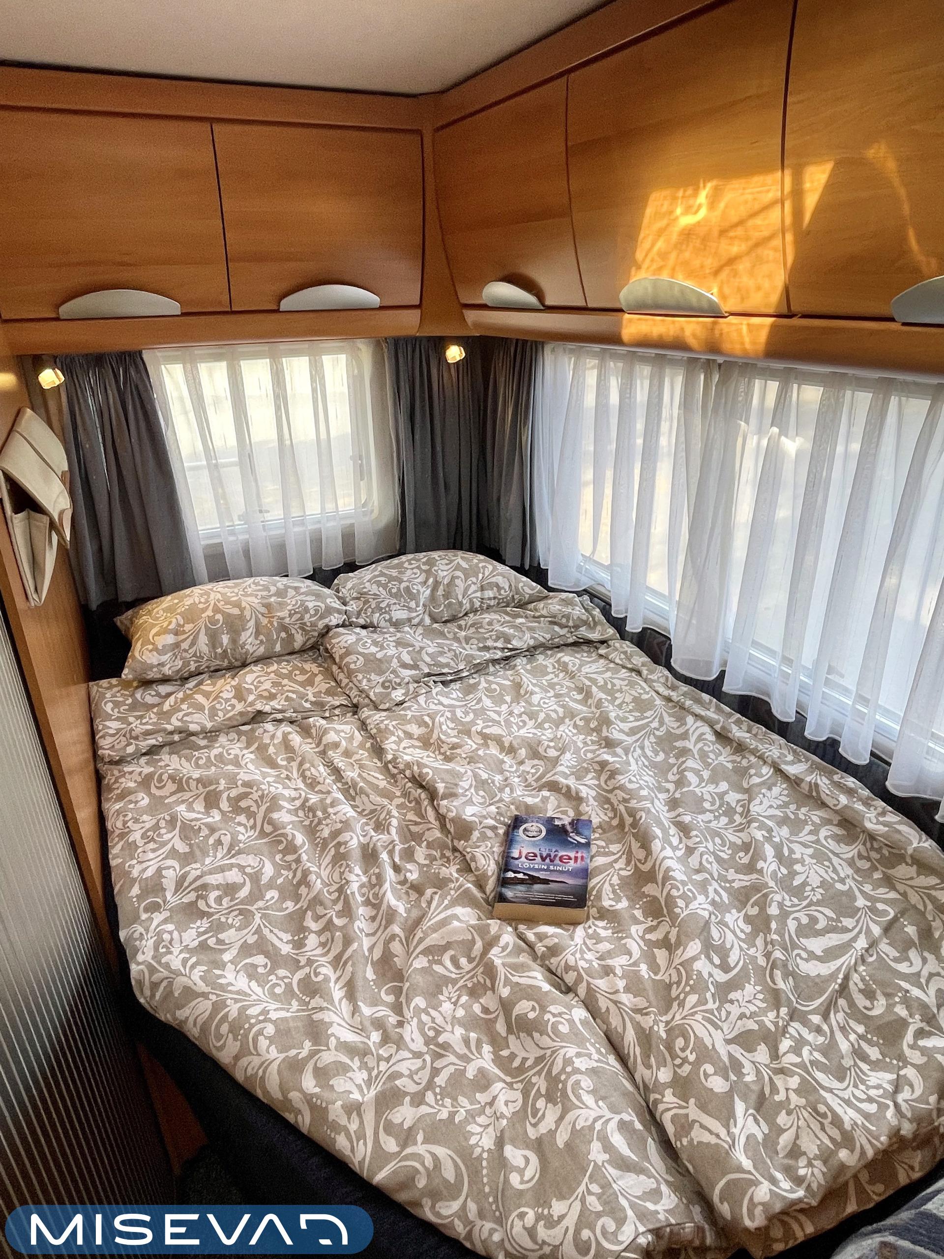 Hymerissä ei ikä näy tai kilometrit paina. Auto edelleen upeassa kunnossa ja iskussa seuraavia reissuja varten. Tästä löytyy kaikki mukavuudet mitä autolla matkustamiseen tarvitsetkin. Ja vieläpä kohtuullisen kompaktissa paketissa. Autolla on pituutta vain 6,35 metriä! Takana on wc, kunnon kokoisella suihkutilalla. Tarvittaessa suihkua voi käyttää myös ikkunan kautta, jos päätyy vaikkapa Kreikan mereen uimaan. Vaatteille ja tavaroille on autossa hyvin tilaa. Erityisesti yläkaapit korostuvat kooltaan isoiksi. Parisänky takana kutsuu nukkumaan ja on mukavan pehmeä. Ruokapöytä muuntuu helposti myös toiseksi sängyksi. Muutoin tila toimii hienosti neljän tai jopa viiden hengen oleskeluun ja ruokailuun. Keittiö tarjoilee tilat kokkailuun ja kaappeihin mahtuu tarvittavat ruoantekovälineet. Auton lattiamatot on mukava lisä, sisällä viihtyy sukkasiltaan. Terassokalusteet mahtui helposti sängyn alle, johon pääsee myös ulkoluukun kautta. Ohjaamotila on eristettävissä verholla, asuintilasta. Ajomukavuudesta saa nauttia ilmastoinnin puhaltaessa viileää ja automaattilaatikon viedessä eteenpäin. Tällä on mukava ajaa!