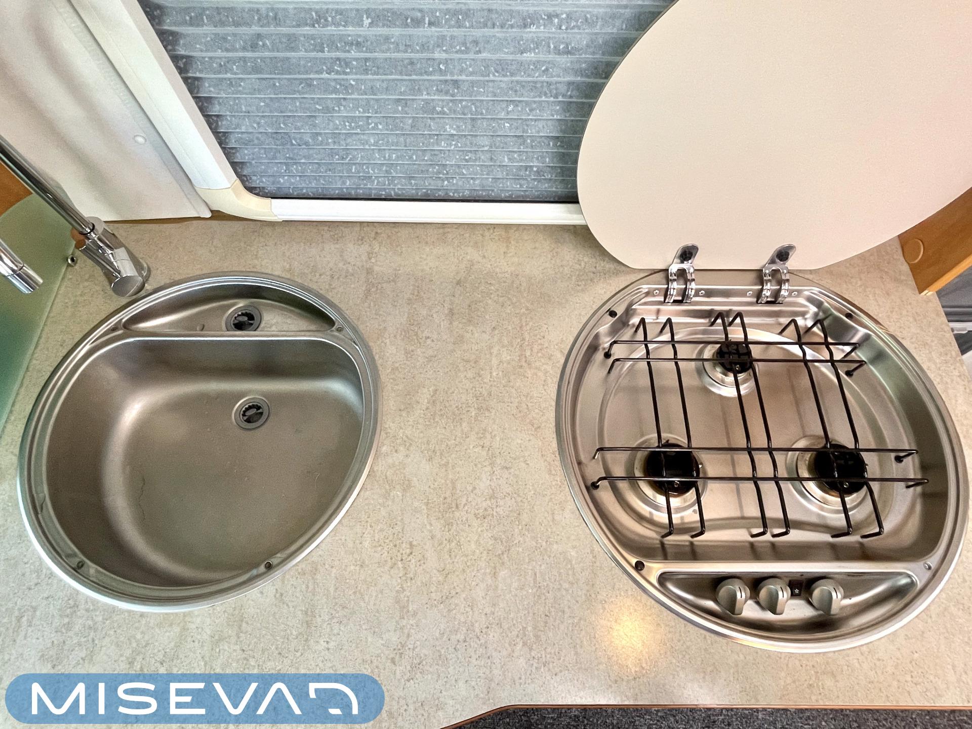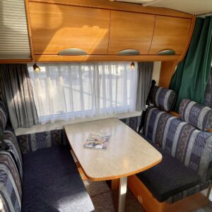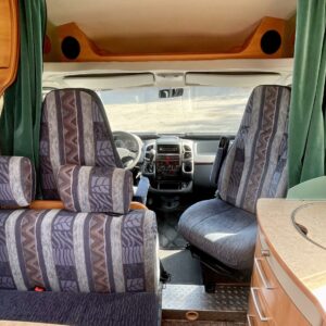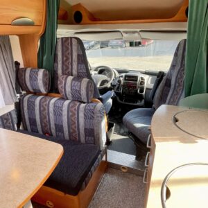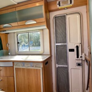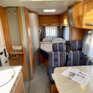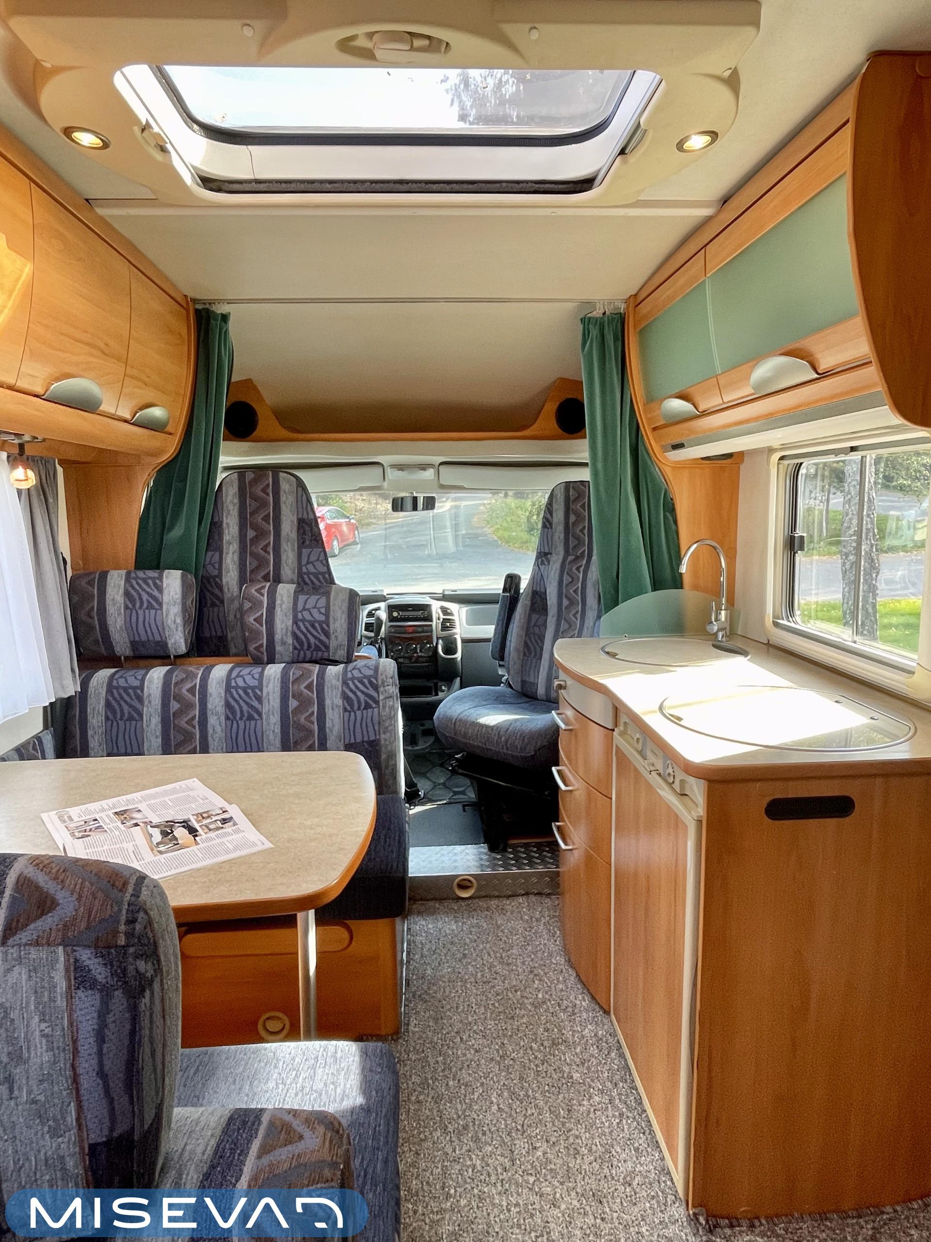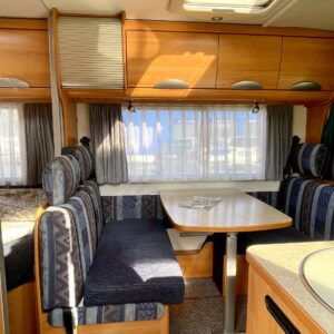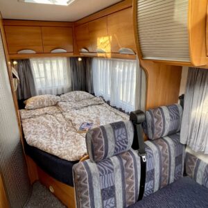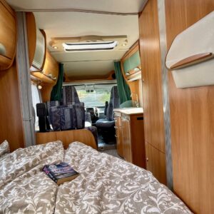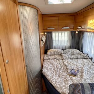 Hymerissä ei ikä näy tai kilometrit paina. Auto edelleen upeassa kunnossa ja iskussa seuraavia reissuja varten. Tästä löytyy kaikki mukavuudet mitä autolla matkustamiseen tarvitsetkin. Ja vieläpä kohtuullisen kompaktissa paketissa. Autolla on pituutta vain 6,35 metriä! Takana on wc, kunnon kokoisella suihkutilalla. Tarvittaessa suihkua voi käyttää myös ikkunan kautta, jos päätyy vaikkapa Kreikan mereen uimaan. Vaatteille ja tavaroille on autossa hyvin tilaa. Erityisesti yläkaapit korostuvat kooltaan isoiksi. Parisänky takana kutsuu nukkumaan ja on mukavan pehmeä. Ruokapöytä muuntuu helposti myös toiseksi sängyksi. Muutoin tila toimii hienosti neljän tai jopa viiden hengen oleskeluun ja ruokailuun. Keittiö tarjoilee tilat kokkailuun ja kaappeihin mahtuu tarvittavat ruoantekovälineet. Auton lattiamatot on mukava lisä, sisällä viihtyy sukkasiltaan. Terassokalusteet mahtui helposti sängyn alle, johon pääsee myös ulkoluukun kautta. Ohjaamotila on eristettävissä verholla, asuintilasta. Ajomukavuudesta saa nauttia ilmastoinnin puhaltaessa viileää ja automaattilaatikon viedessä eteenpäin. Tällä on mukava ajaa!