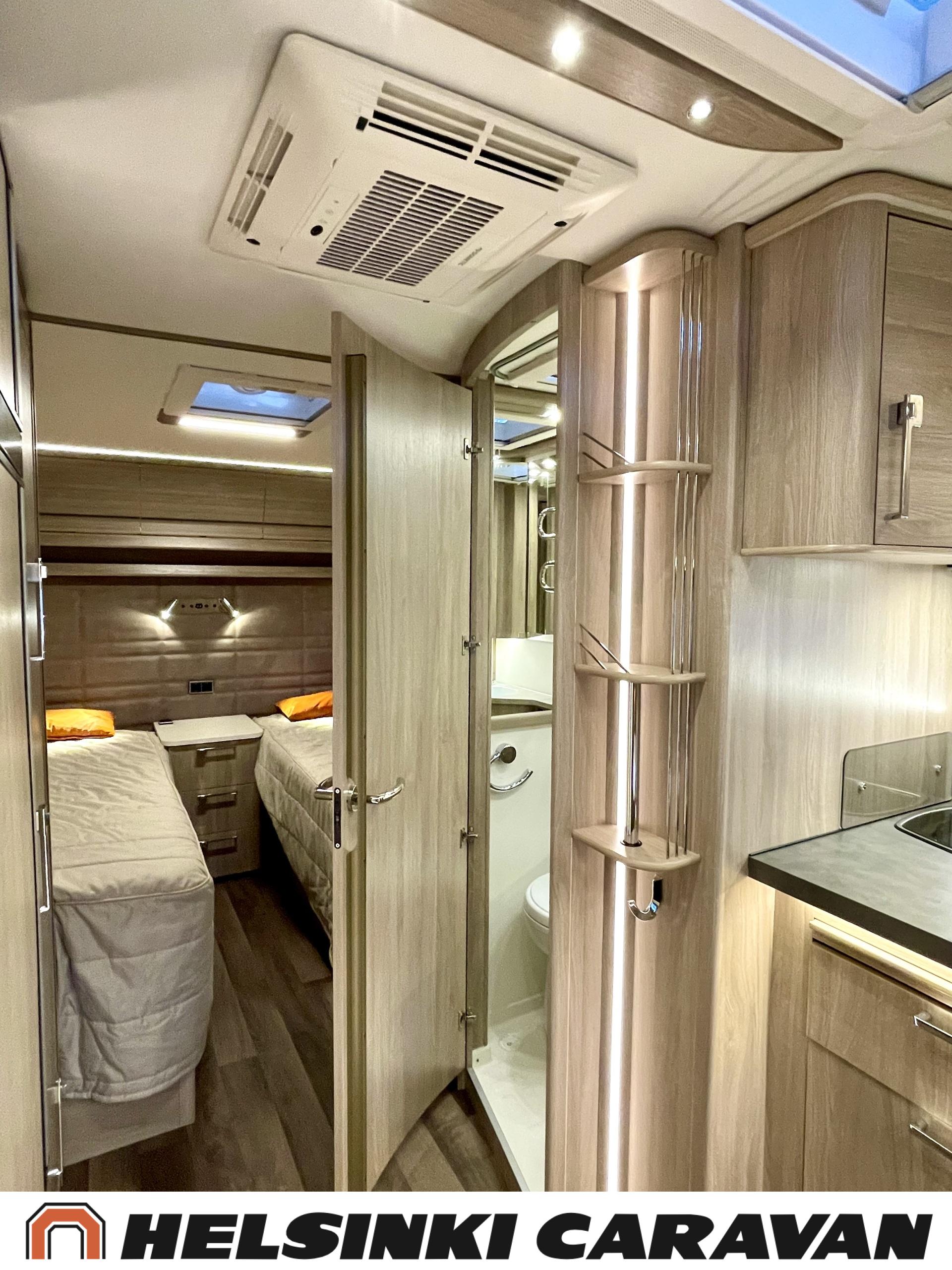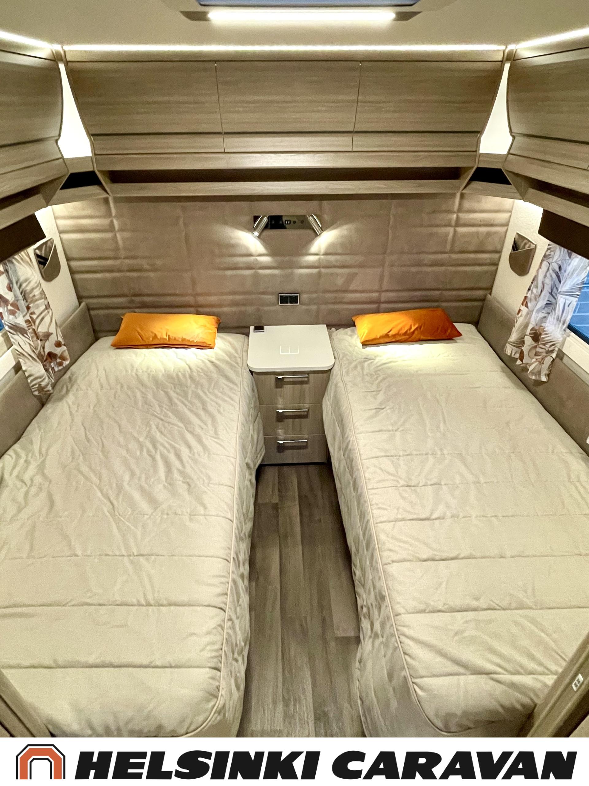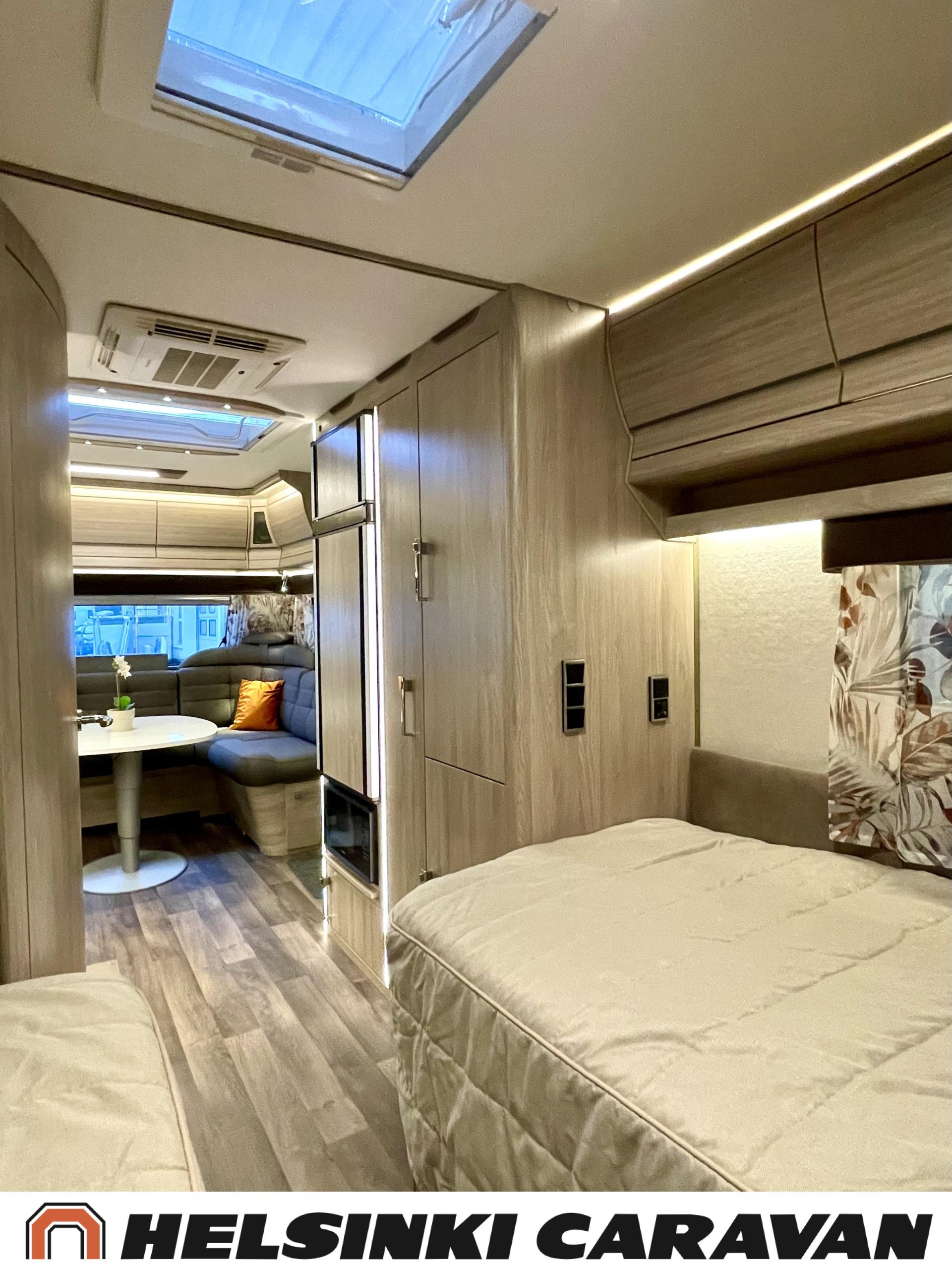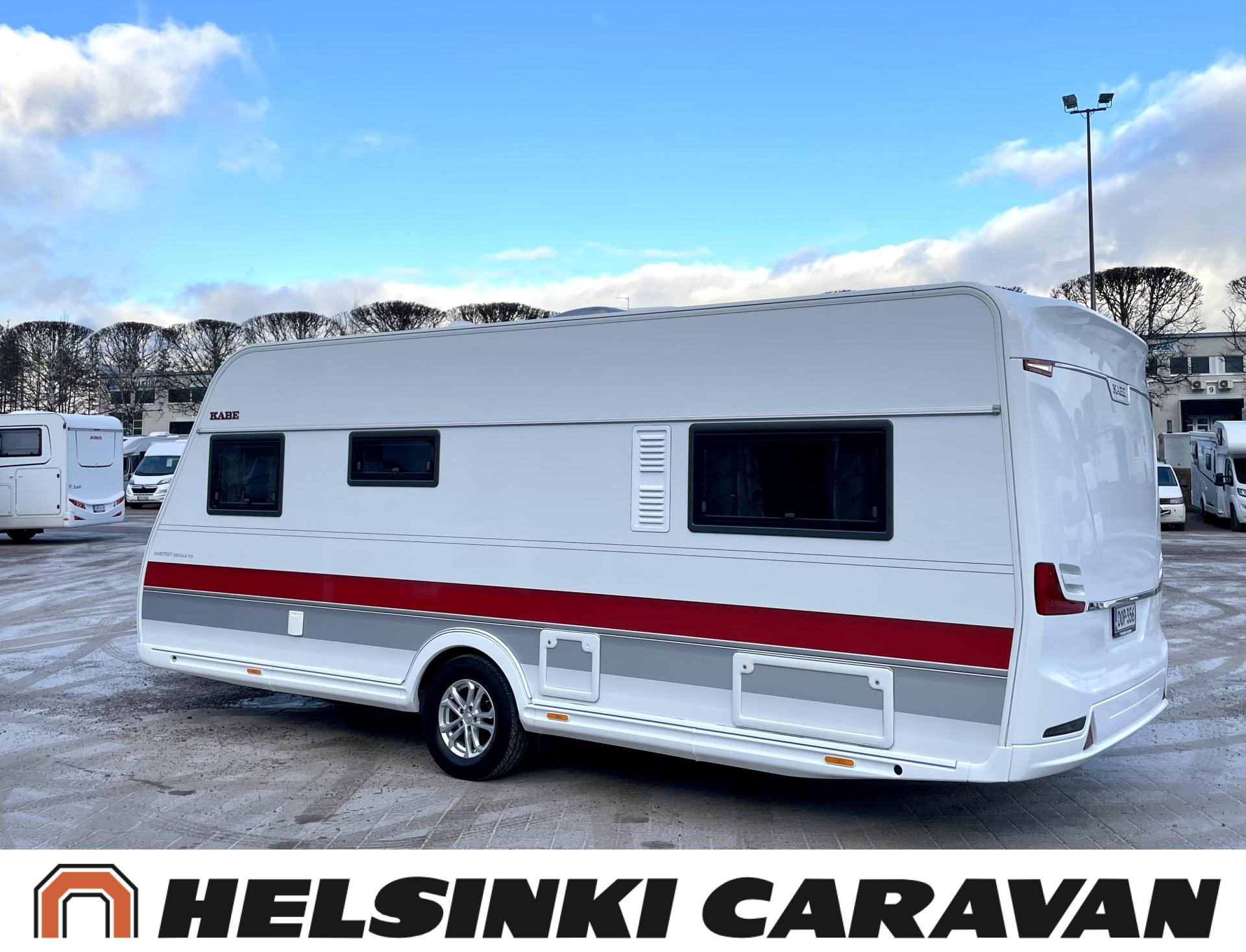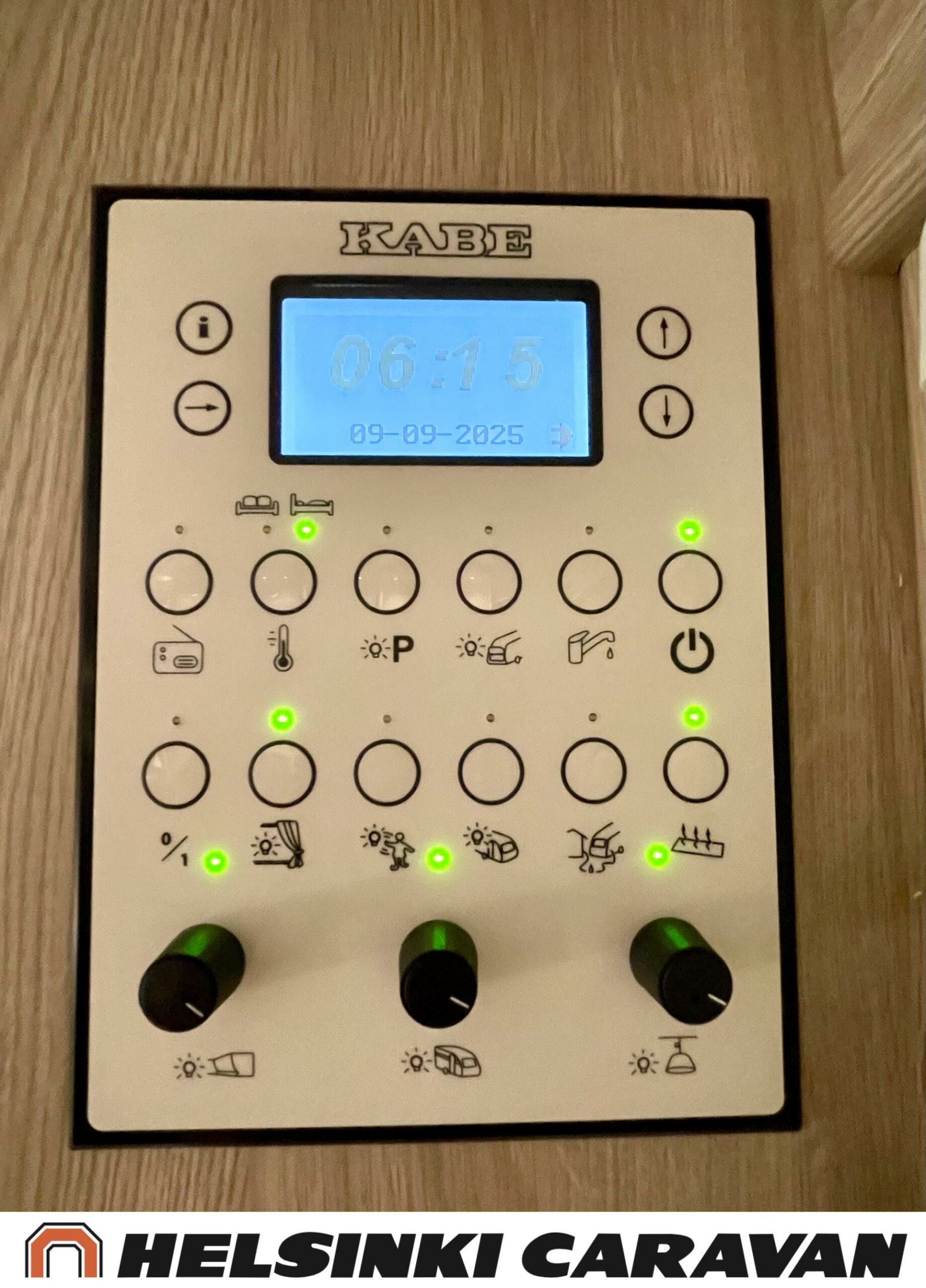 Vaativaan ympärivuotiseen käyttöön tehty ruotsalainen Kabe kysytyllä erillisvuodepohjalla! Vaunun etuosassa on huippumukava U-pöytäryhmä, jossa kelpaa lekotella televisiota katsellen talven pakkasia tai kesän helteitä karussa. Vaunun keskiosan varustellusta keittiöstä löytyy runsaiden kaappitilojen lisäksi liesituuletin, kompakti kolmiliekkinen liesi, mikroaaltouuni sekä korkea jääkaappi erillisellä pakastelokerolla. Kylpyhuone sijaitsee keittiön vieressä, joten vaunun takaosaan jää hyvä tila kahdelle täysikokoiselle sähkösäätöiselle erillisvuoteelle. Koko komeus on valaistu kauniilla epäsuoralla LED-valaistuksella ja kruunattu nestekiertoisen lattialämmityksen ja ilmastointilaitteen kaltaisilla mukavuuksilla. Tervetuloa ihastumaan!