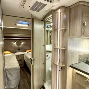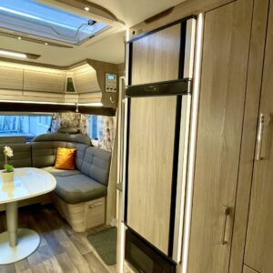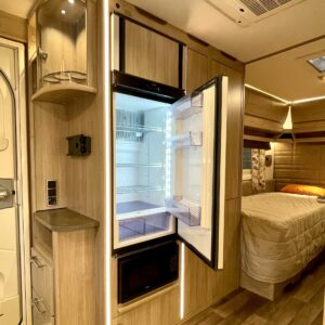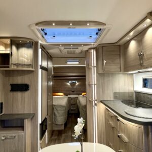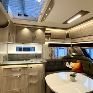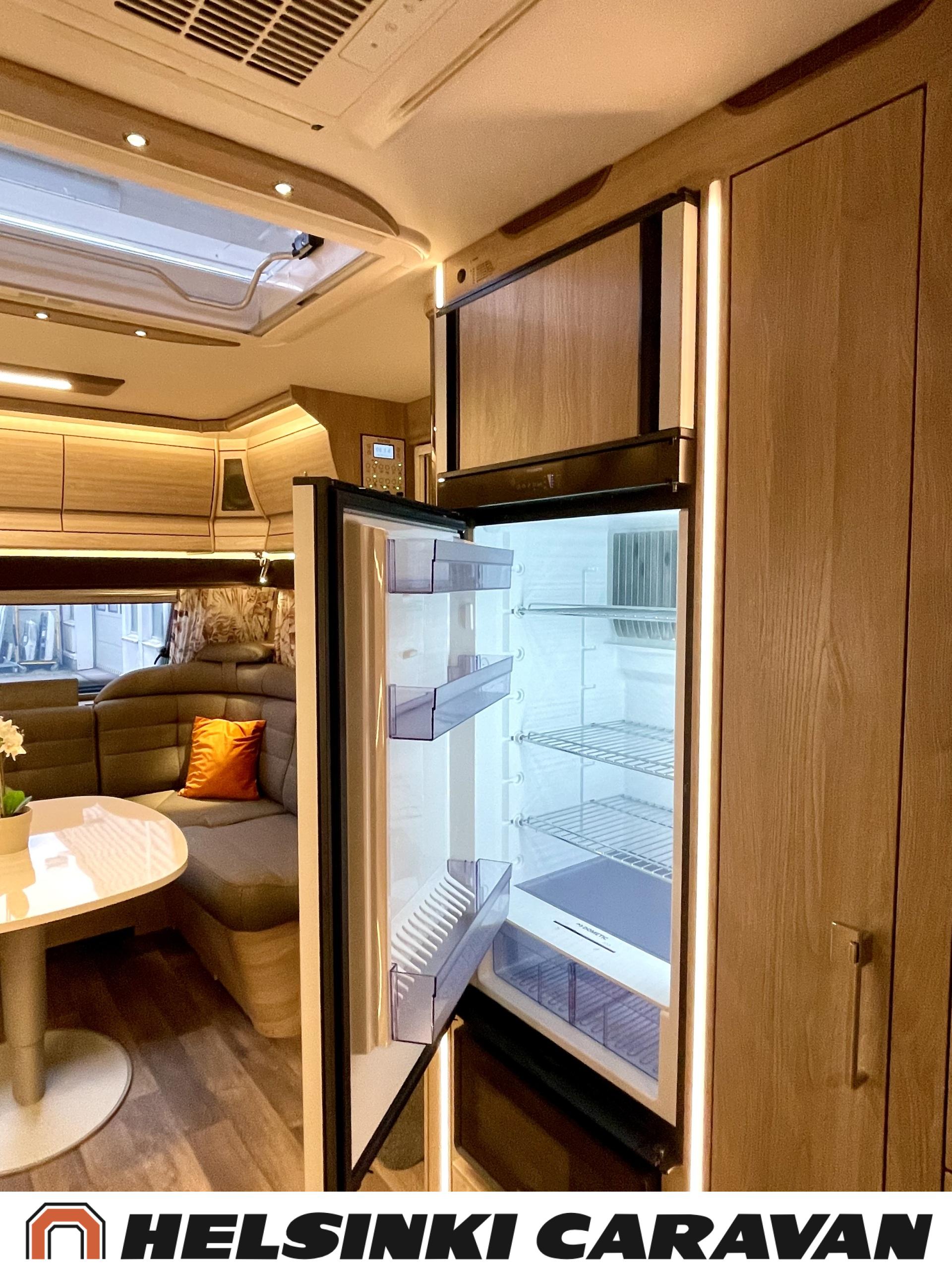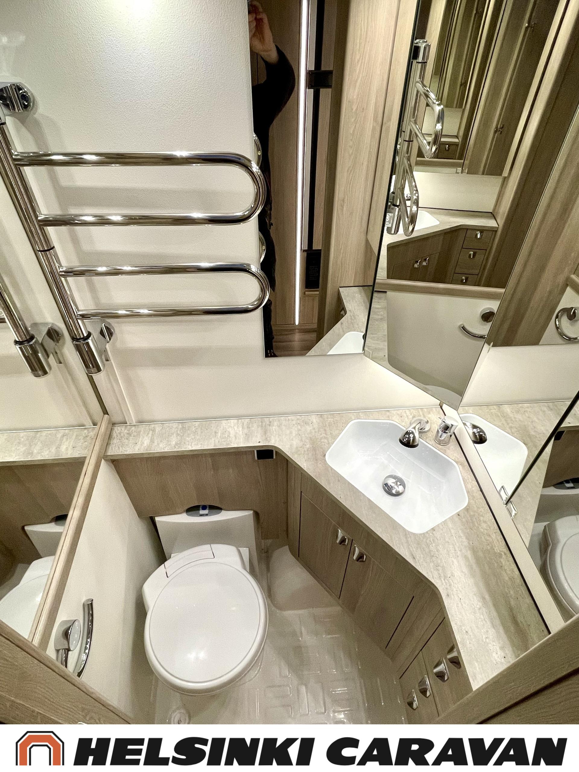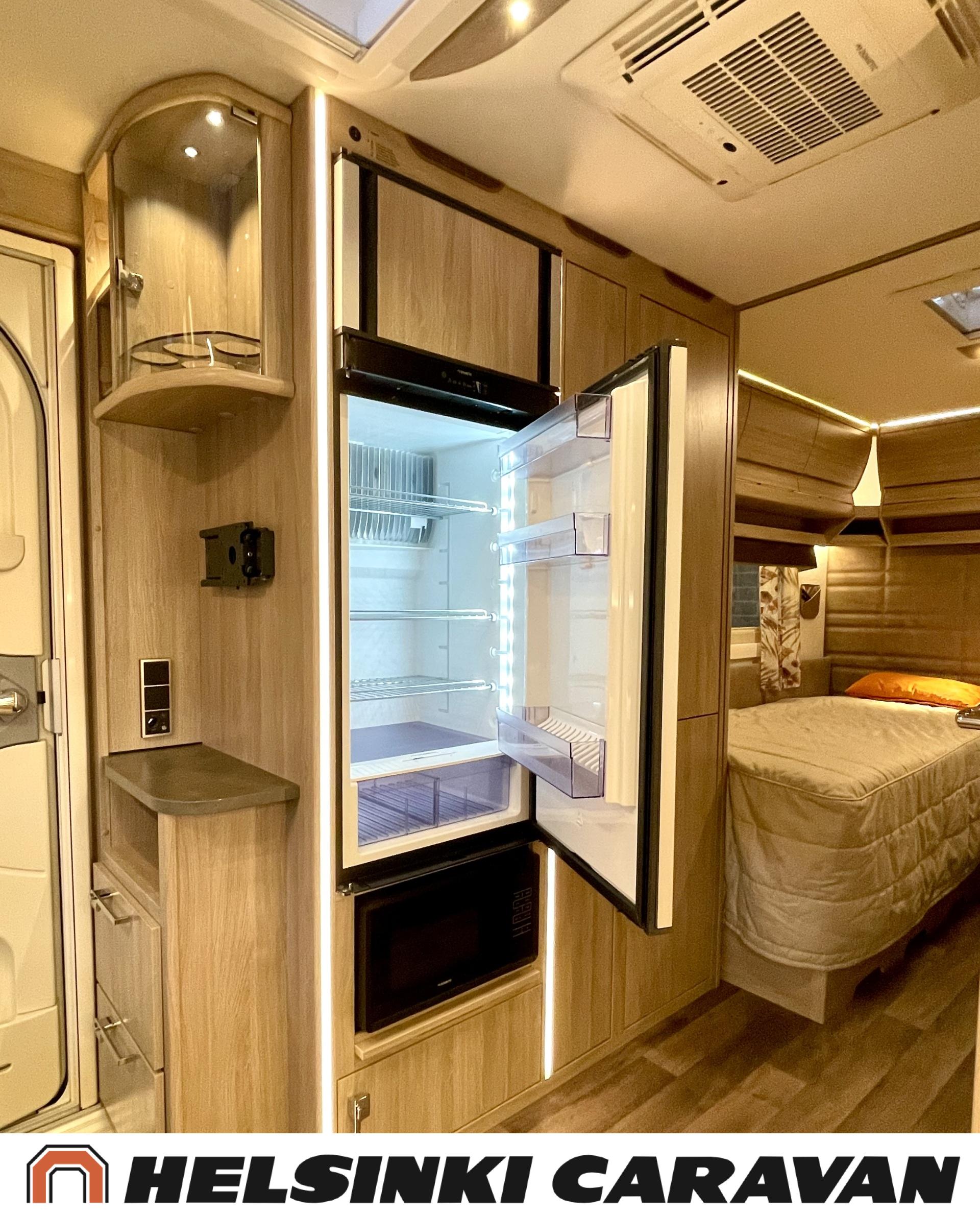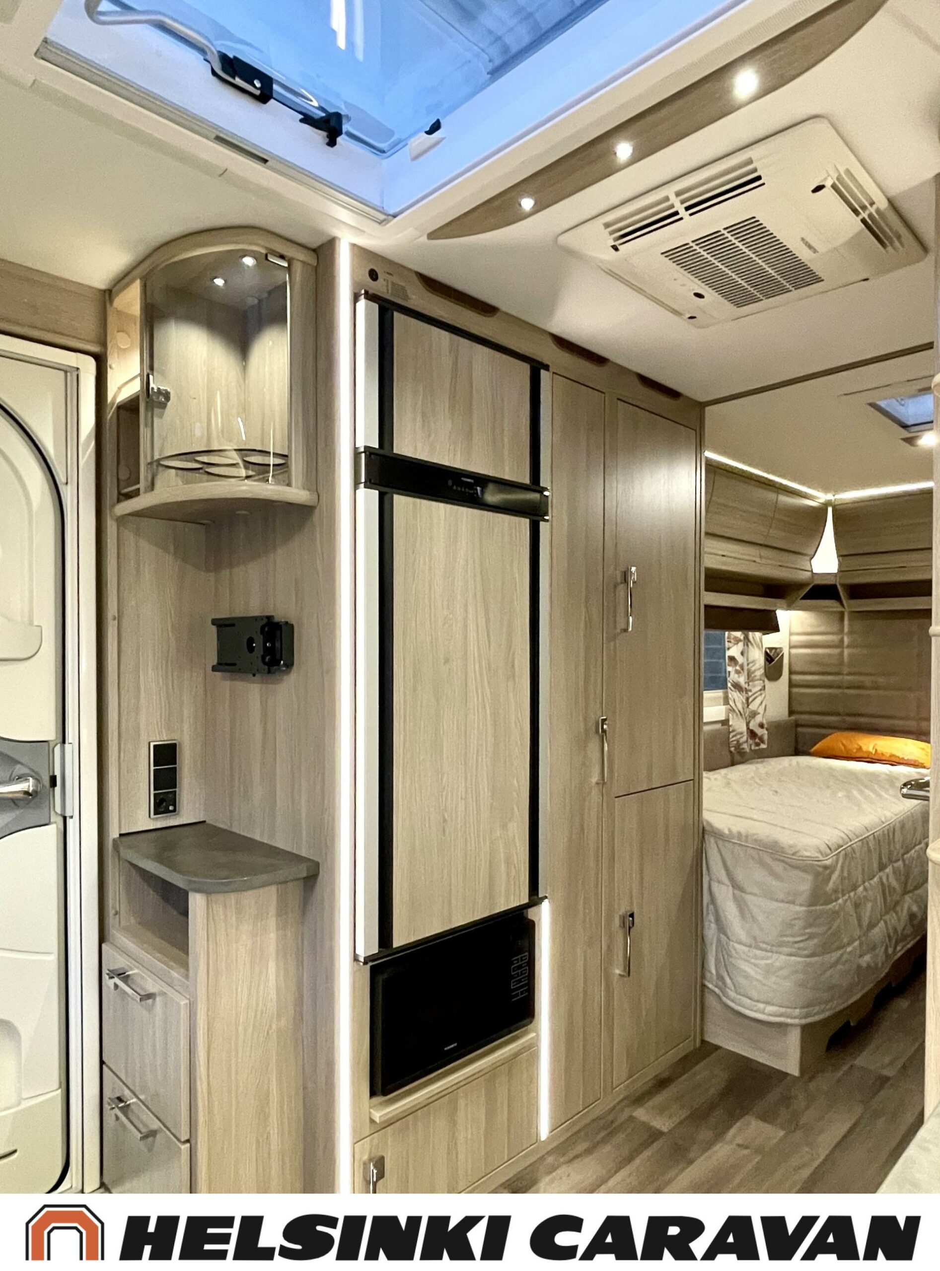 Vaativaan ympärivuotiseen käyttöön tehty ruotsalainen Kabe kysytyllä erillisvuodepohjalla! Vaunun etuosassa on huippumukava U-pöytäryhmä, jossa kelpaa lekotella televisiota katsellen talven pakkasia tai kesän helteitä karussa. Vaunun keskiosan varustellusta keittiöstä löytyy runsaiden kaappitilojen lisäksi liesituuletin, kompakti kolmiliekkinen liesi, mikroaaltouuni sekä korkea jääkaappi erillisellä pakastelokerolla. Kylpyhuone sijaitsee keittiön vieressä, joten vaunun takaosaan jää hyvä tila kahdelle täysikokoiselle sähkösäätöiselle erillisvuoteelle. Koko komeus on valaistu kauniilla epäsuoralla LED-valaistuksella ja kruunattu nestekiertoisen lattialämmityksen ja ilmastointilaitteen kaltaisilla mukavuuksilla. Tervetuloa ihastumaan!