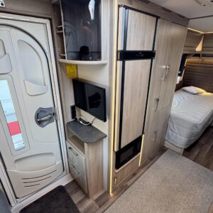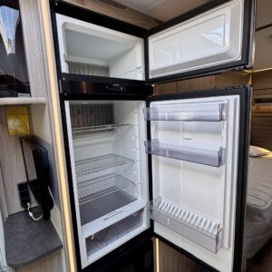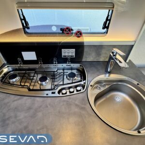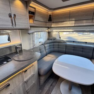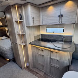 Vaunun keskivaiheilla on keittiösaareke, iso jääkaappi- pakastin ja runsaasti säilytystilaa korkean jääkaapin muodossa. Keittiön varustusta täydentää mikroaaltouuni ja liesituuletin.