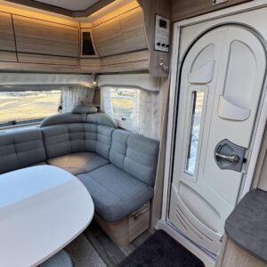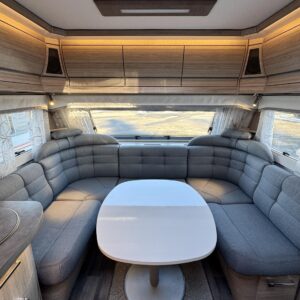 Vaunun etuosassa on viihtyisä U- ryhmä, jonka ympärille mahtuu isompikin seurue iltaa istumaan. Pöytäryhmästä saa tarvittaessa sijattua lisävuoteen.