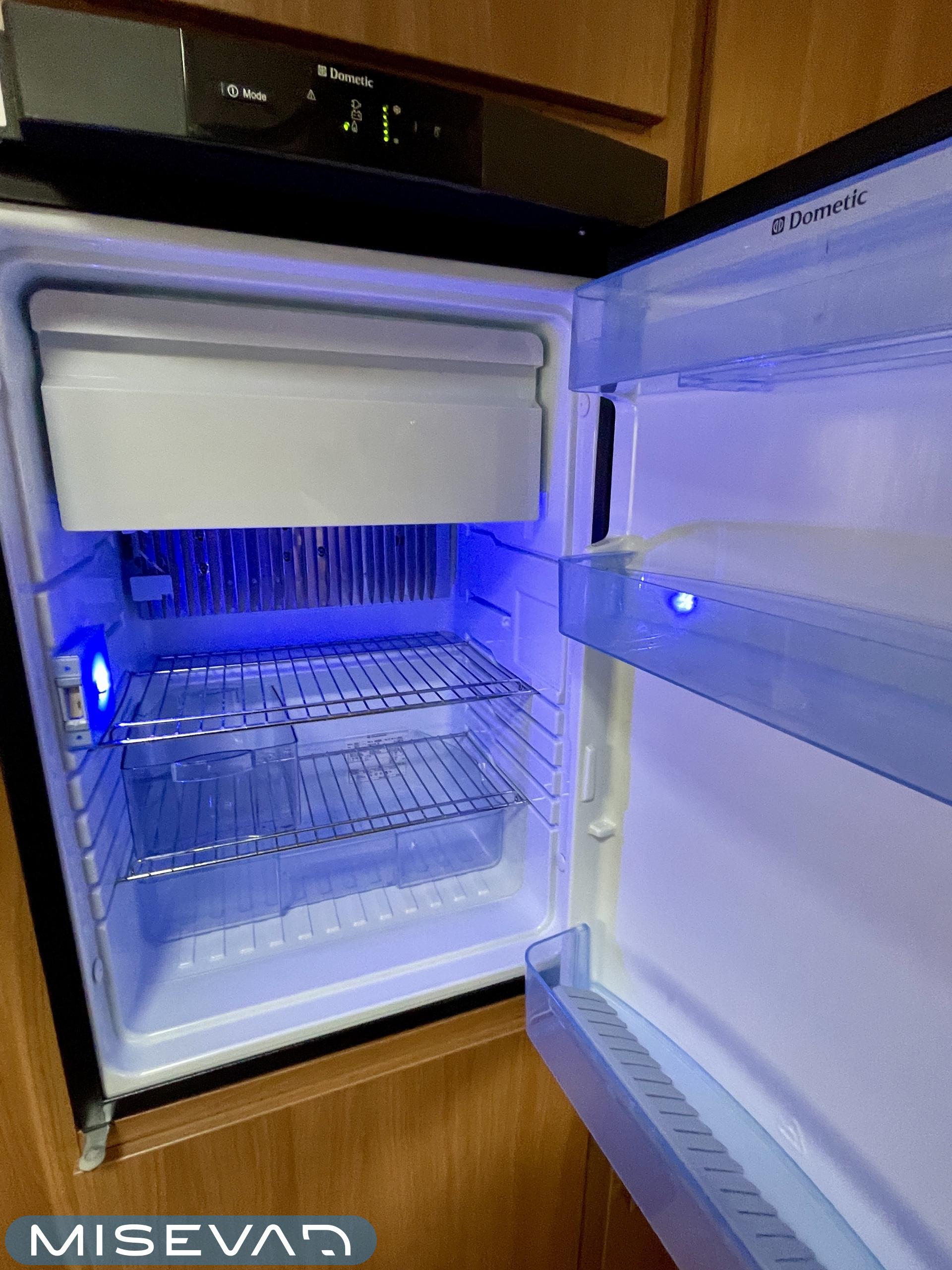 Edessä tyylikäs ja mukava U-ryhmä, keskellä käytännöllinen keittiö, jossa hyvälle korkeudelle sijoitettu jääkaappi, sekä liesi, myös valmiiksi varattu paikka mikroaaltouunille pistokkeineen. Takana tilava parisänky sekä toimivat WC-tilat.