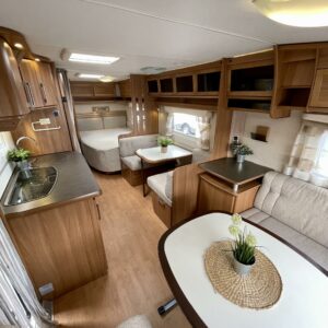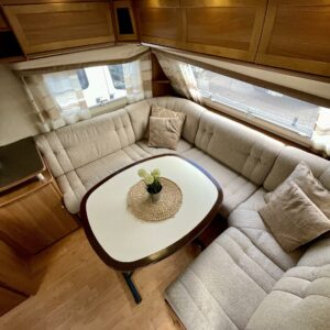 Varusteluun kuuluvat iso jääkaappi, mikroaaltouuni, liesi sekä kaasun ulosotto, jotka tekevät ruoanlaitosta monipuolista ja helppoa. Tilavassa vaunussa viihtyy isompikin porukka, joten iltaa on mukava istua yhdessä.