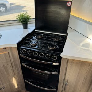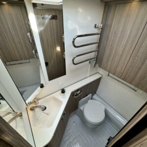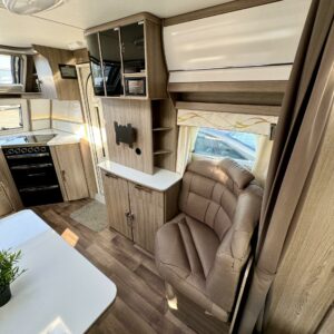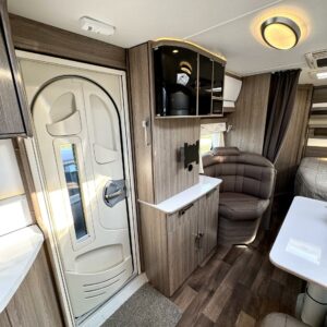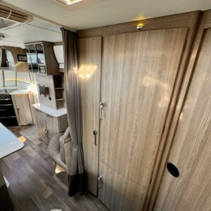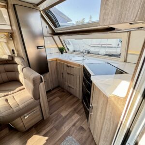 Upea parivuoteinen matkavaunu huippuvarusteilla! Edessä huikean avara keittiö jossa suuri jääkaappi-pakastin- yhdistelmä, kaasu-uuni, liesituuletin ja reilusti tilaa kahvinkeittimelle. Keskellä valoisa U-istuinryhmä pienellä sivusohvalla sekä kivasti kaappitilaa ja multimediasoitin. Takana leveä parivuode jonka alla suuri tavaratila, reilusti vaatekaappeja sekä pesuhuone.