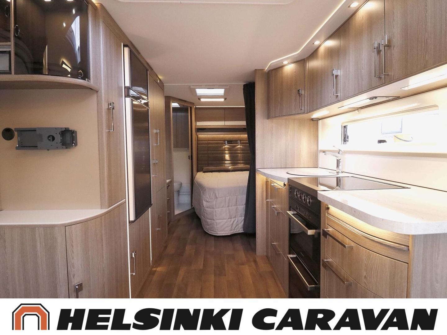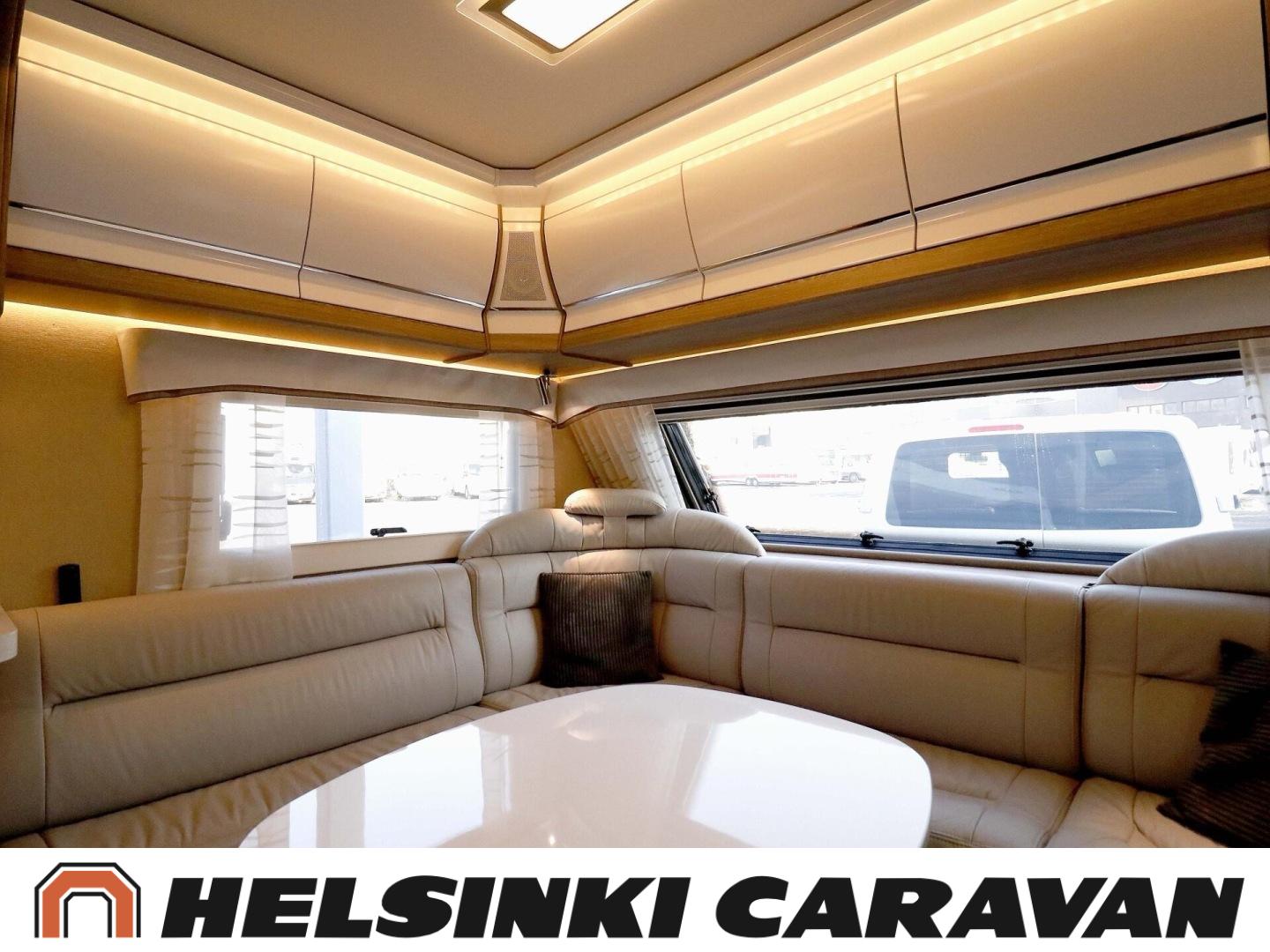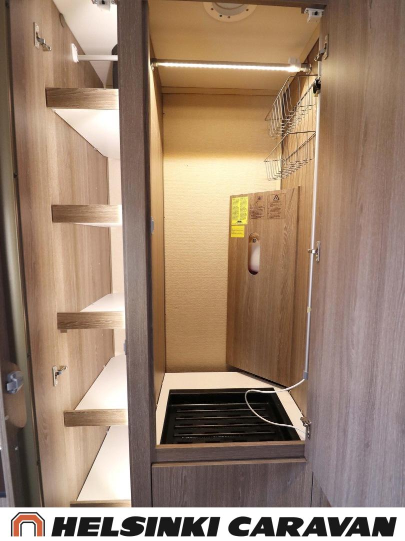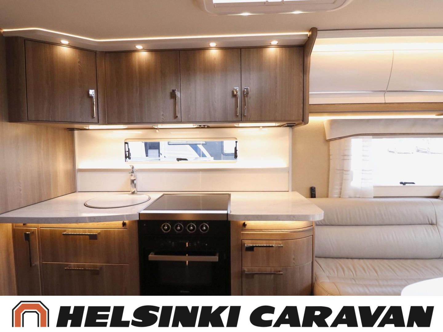 Alde, Lattialämmitys (nestekierto), Lämminvesiboileri, Eristetty harmaavesisäiliö, Sähköpatruuna, Nahkasisusta, Jääkaappi, Mikroaaltouuni, Bluetooth, kwh-mittari, Erikoisvanteet, Kasettiverhot, Kattoluukku, Parivuode, Radio, Suihku, Multimedialaite (sis. p-kamera, navi, soitin, bluetooth, handsfree), pullonvaihtajan sisänäyttö