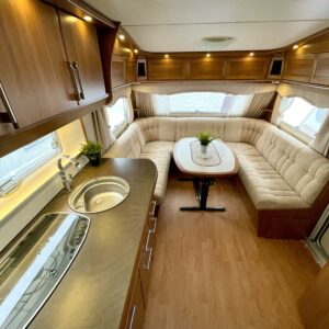 Harvinainen kokoluokka Kabella. Takaosan makuuhuoneessa hulppean kokoinen parivuode joustinpatjalla, edessä muhkean mukava u-ryhmä, keskellä avara keittiö missä voit kokkailla maittavat ateriat ja välipalat. Vaunun tunnelma ja värimaailma on aistikkaan skandinaavinen. Kesän helteeltä suojaa ilmastointi ja talven kylmillä lämmittää aito oikea nestekiertoinen lattialämmitys. Tässä vaunu joka sopii joka vuodenaikaan ja nautinnolliseen matkailuun ympäri maailman!
