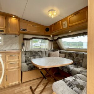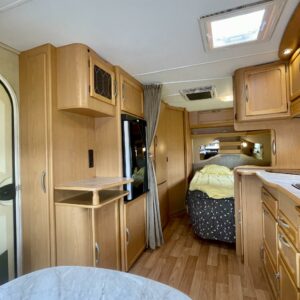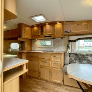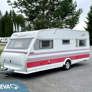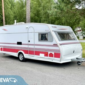 Ilmastoitua Kabe laatua tarjolla. Vaunun takaosaan on sijoitettu pitkittäinen parivuode, sekä WC/kylpyhuonetilat. Vuoteen alle jää runsaasti säilytystiloja. Lisää säilytystiloja löytyy myös takaosaan sijoitetuista kaapistoista. Keskeltä löytyy avara keittiö missä on runsaasti laskutilaa keittiötasolla. Jääkappi uusittu Dometicin molemmilta puolilta avautuvaan malliin ja se on mukavalla käyttökorkeudella. Etuosa on pyhitetty U-ryhmälle mistä saadaan sijattua tarvittaessa vuode kahdelle henkilölle. Mainittaakoon heti sisäänkäynnin vieressä oleva pieni vaatekaappi, tähän on helppo jättää ulkovaatteet heti sisään tultuaan. Ja Kabelle tyypilliseen tapaan edestä löytyy vielä koko vaunun levyinen ”suksiluukku” pitkän tavaran kuljettamista varten. Ilmastointi pitää kesähelteellä sisätilan lämpötilat miellyttävällä tasolla ja tämähän on esim. mukana kulkeville lemmikeille oikeinkin hieno juttu. Lämmityksenä Alden nestekeskuslämmitys ja kierto on myös lattiassa. Tehokas tasaisen lämmön tuottava järjestelmä takaa asumisen mukavuuden myös arktisissa olosuhteissa. Polkupyörätkin saa mukaan takaseinälle sijoitettuun pyörätelineeseen.