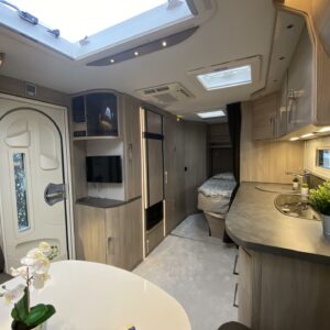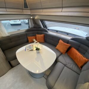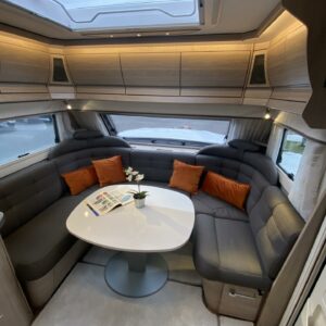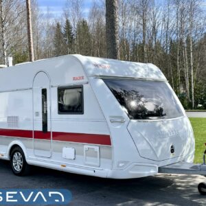 Hienokuntoinen matkavaunu huippuvarusteilla! Siinä se on tiivistettynä pariin sanaan tämän tapauksen ylisanat. Vaunun takaosaan on sijoitettu pitkittäinen parivuode, mistä saadaan päädyn korkeutta/kulmaa säädettyä sähköisesti mukavaan asentoon vaikkapa kirjaa lueskellessa. Vierestä löytyy tilava WC suihkulla ja onha siellä vielä kuivaustelinekin. Keskelle on asemoitu keittiö. Laskutilaa löytyy runsaasti ja jääkaappi on varustettuna erillisellä pakastinlokerolla. Lisäherkkuna keittövarustelussa on myös Dometicin mikro. Etuosaa hallitsee U-ryhmä mistä saadaan tarvittaessa lisävuode kahdelle henkilölle. Kabemaiseen tyyliin lämmityksenä on Alden nestekeskuslämmitys ja tietysti myös lattiakierrolla varustettuna. Kesäkuumalla sisätilat viilennetään sopivaan lämpötilaan Dometicin ilmastoinnin avulla. Jos ei olla valtionverkon sähköissä kiinni, niin akkua lataa katolle sijoitettu aurinkopaneeli. On siisiti, niin sisältä kun päältäkin! Ja tässä vaunussa on suoritettu vuosittaiset kosteusmittaukset, joten tehtaan tiiveystakuu on voimassa. Tule ihastumaan, ehkä tässä on sinun uusi matkailuvaunusi?