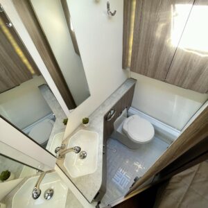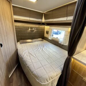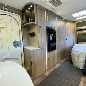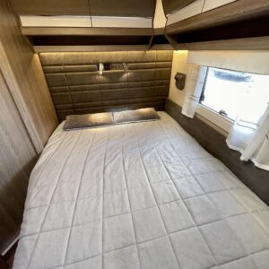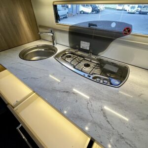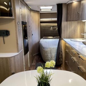 Sisustuksessa pehmeät ja tyylikkäät värisävyt kankaissa sekä puumateriaaleissa luovat viihtyisän tunnelman. Käytännöllinen keittiö, jossa jääkaappi on sopivalla korkeudella ilman turhaa kyykistelyä, sekä runsaasti laskutilaa helpottavat arkea matkalla.