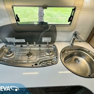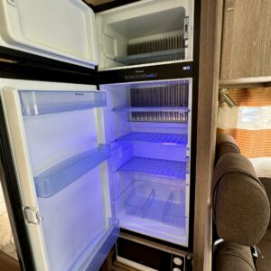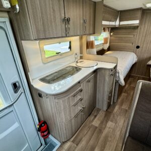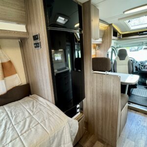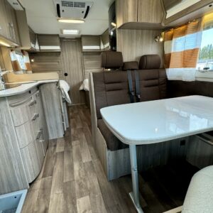 Lähes 7,5 m kokonaispituus mahdollistaa hulppeat sisätilat. Auton etuosassa on pöytäryhmä neljälle. Muutama askel kohti takapäätä vie kulkijan keittiöön, jonka varustukseen kuuluu ison jääkaappi- pakastimen lisäksi mikroaaltouuni ja liesituuletin.