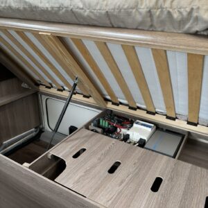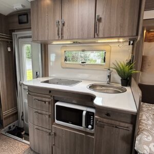 Auton etuosassa on viihtyisä pöytäryhmä neljälle. Keskivaiheilla sijaitsee keittiösaareke, jonka varustukseen kuuluu kaasulieden lisäksi mikroaaltouuni ja iso jääkaappi erillisellä pakastinlokerolla.