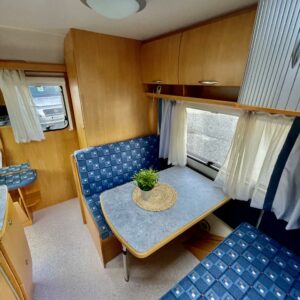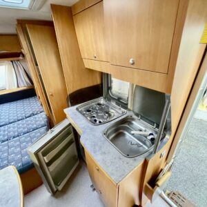 Truma, Jääkaappi, Kasetti WC, Kasettiverhot, Kattoluukku, Liesi, Lämminvesiboileri, Pakastelokero, Parivuode, Pesuallas, Tukijalat