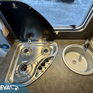 Keskeltä autoa löytyy saniteettitilojen lisäksi keittiösaareke korkealla jääkaapilla varustettuna.