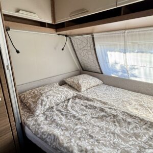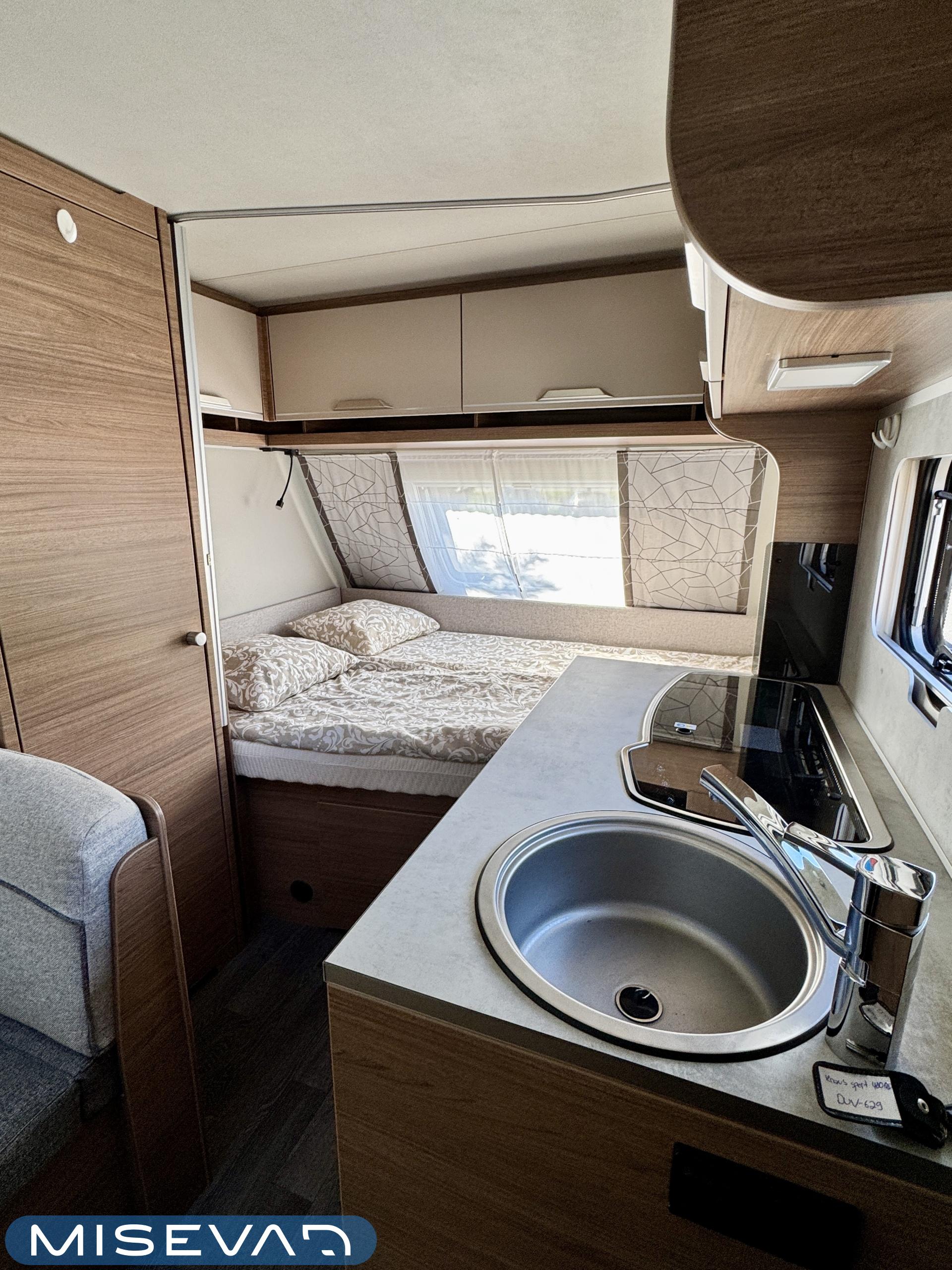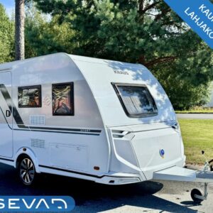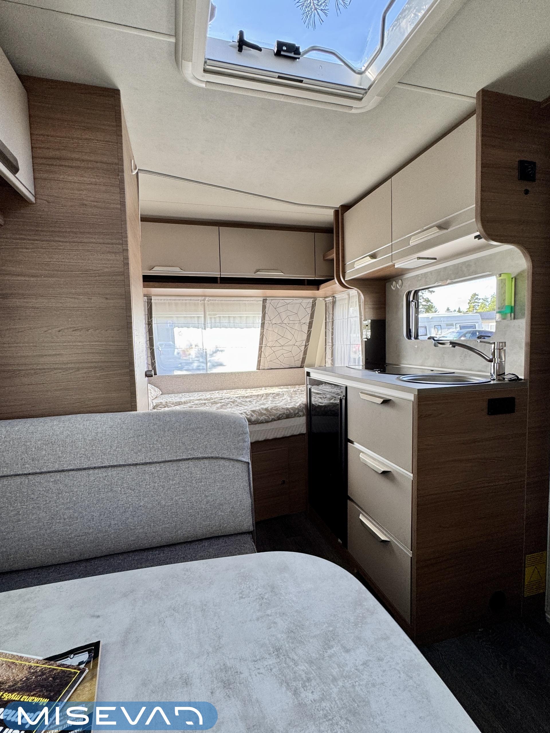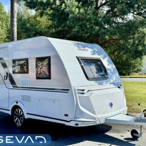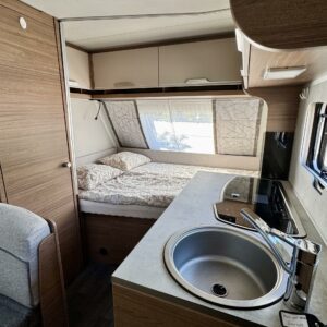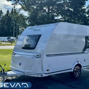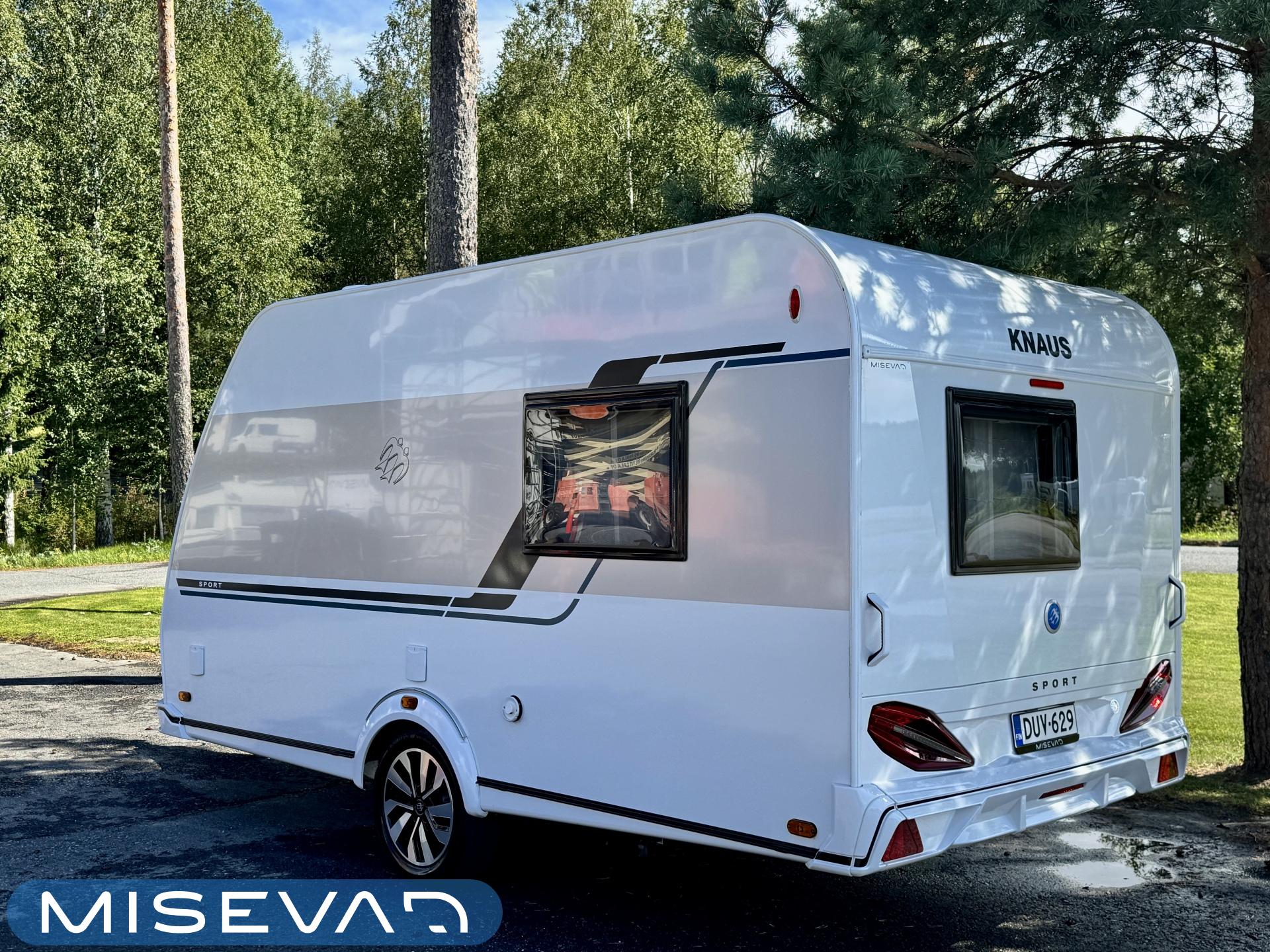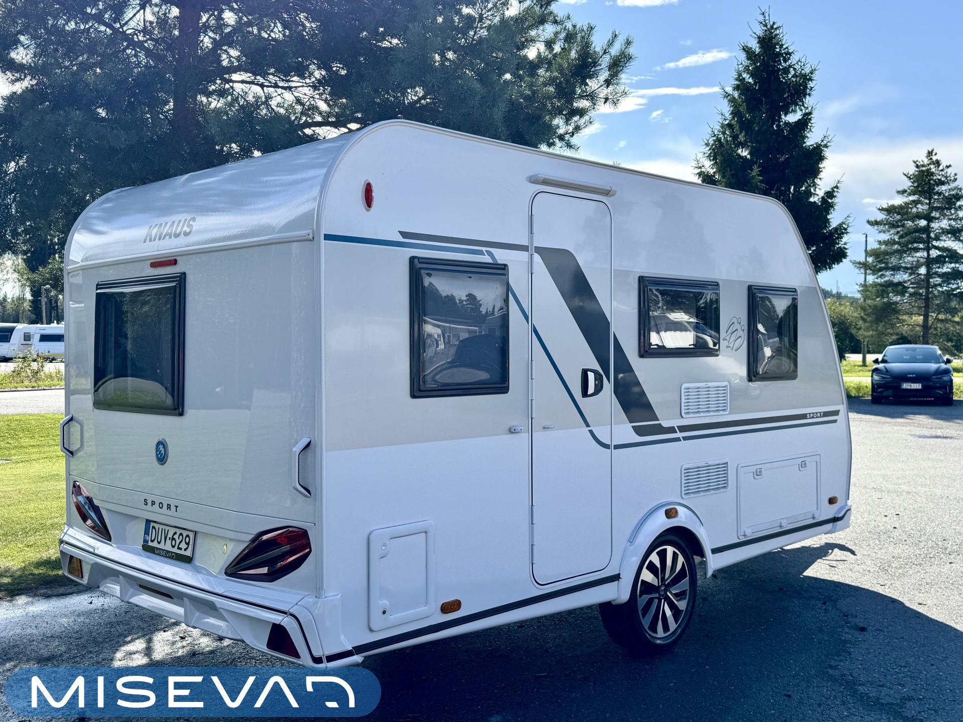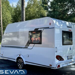 Uudenakarhea (käyttöönotto 6/25) näpsäkkä Knaus ja tosiaan hohtaa uutuuttaan, eli tähän pätee hienosti vanha fraasi ”vaihtoehto uudelle”. Edessä on poikittainen parivuode minkä alle jää säilytystiloja. Säilytystiloissa päästään operoimaan ulkopuolisen luukun kautta, tai sitten sisätilojen kautta. Keskelle asemoituu keittiö mistä löytyy normaali matkailuvaunun keittiövarustus. Takaosaan on sijoitettu vastakkain istuttava pöytäryhmä, sekä WC/kylpyhuonetilat. Pöytäryhmästä saadaan vuode aikuiselle tai pari pienempää lasta tässä mahtuu myös yöpymään.