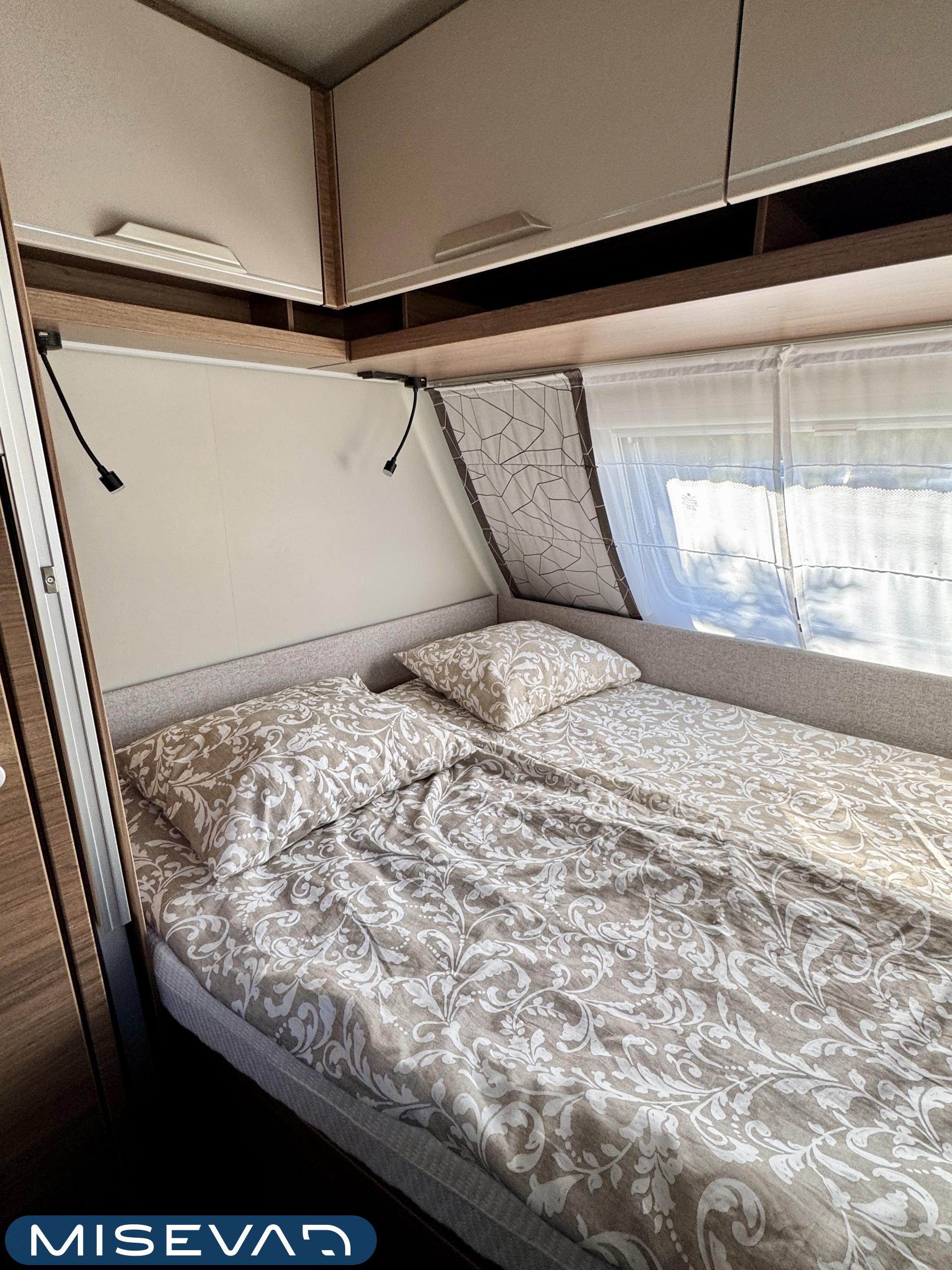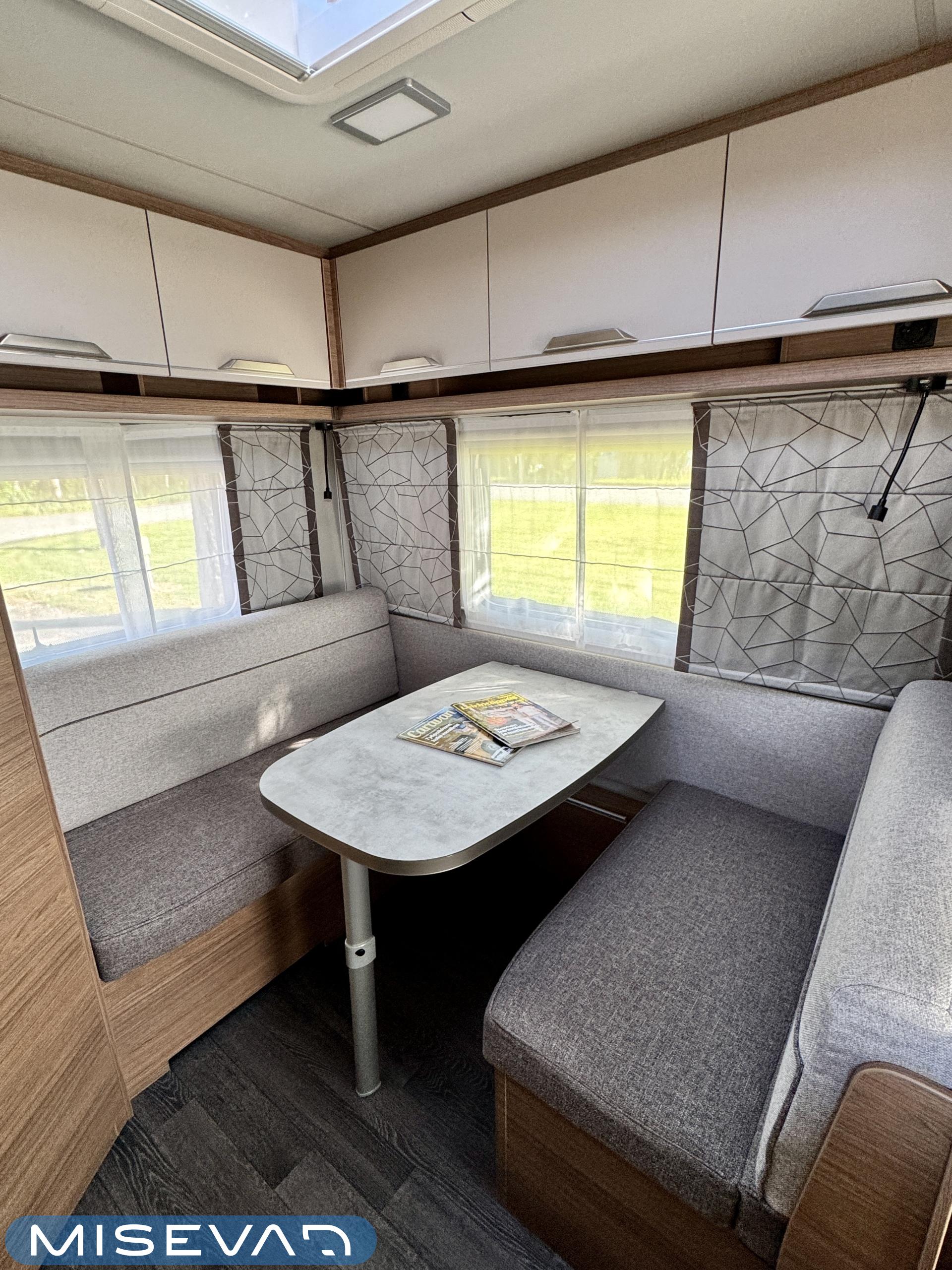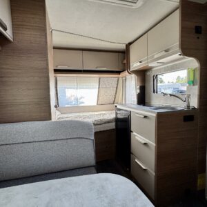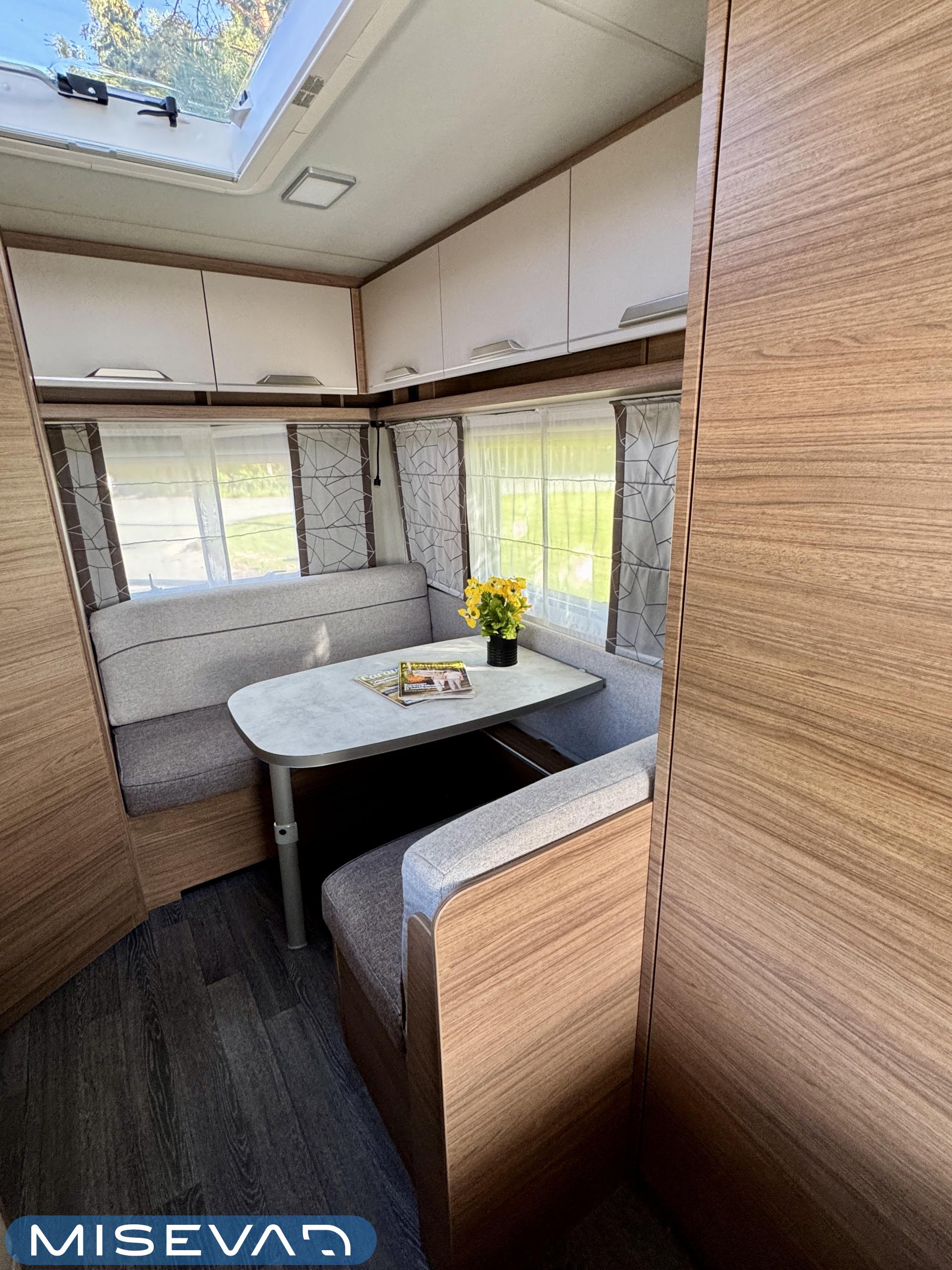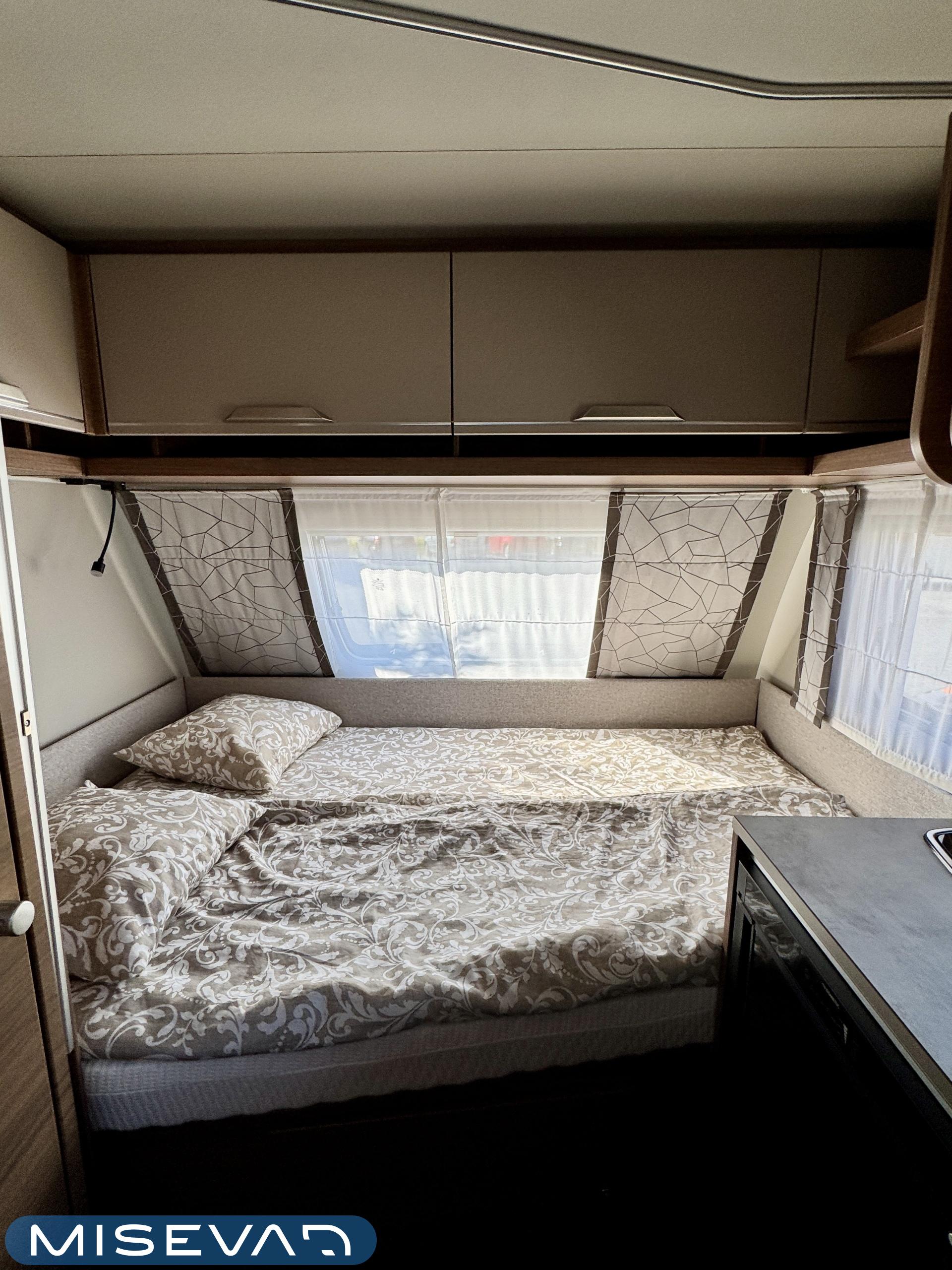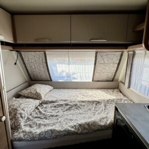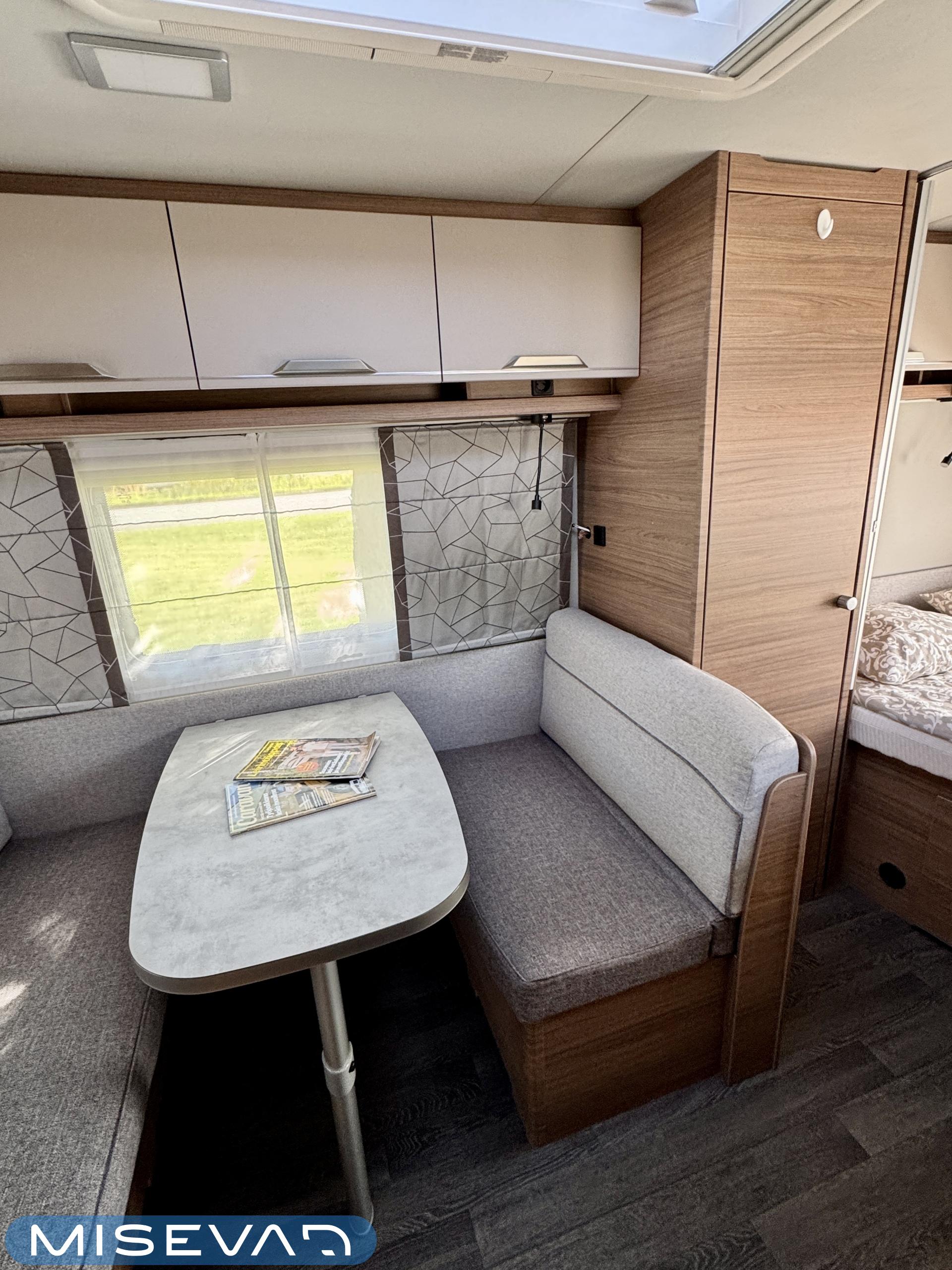 Uudenakarhea (käyttöönotto 6/25) näpsäkkä Knaus ja tosiaan hohtaa uutuuttaan, eli tähän pätee hienosti vanha fraasi ”vaihtoehto uudelle”. Edessä on poikittainen parivuode minkä alle jää säilytystiloja. Säilytystiloissa päästään operoimaan ulkopuolisen luukun kautta, tai sitten sisätilojen kautta. Keskelle asemoituu keittiö mistä löytyy normaali matkailuvaunun keittiövarustus. Takaosaan on sijoitettu vastakkain istuttava pöytäryhmä, sekä WC/kylpyhuonetilat. Pöytäryhmästä saadaan vuode aikuiselle tai pari pienempää lasta tässä mahtuu myös yöpymään.