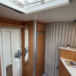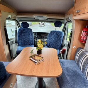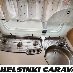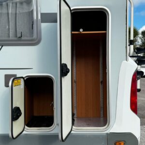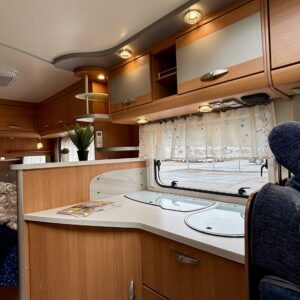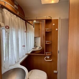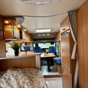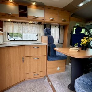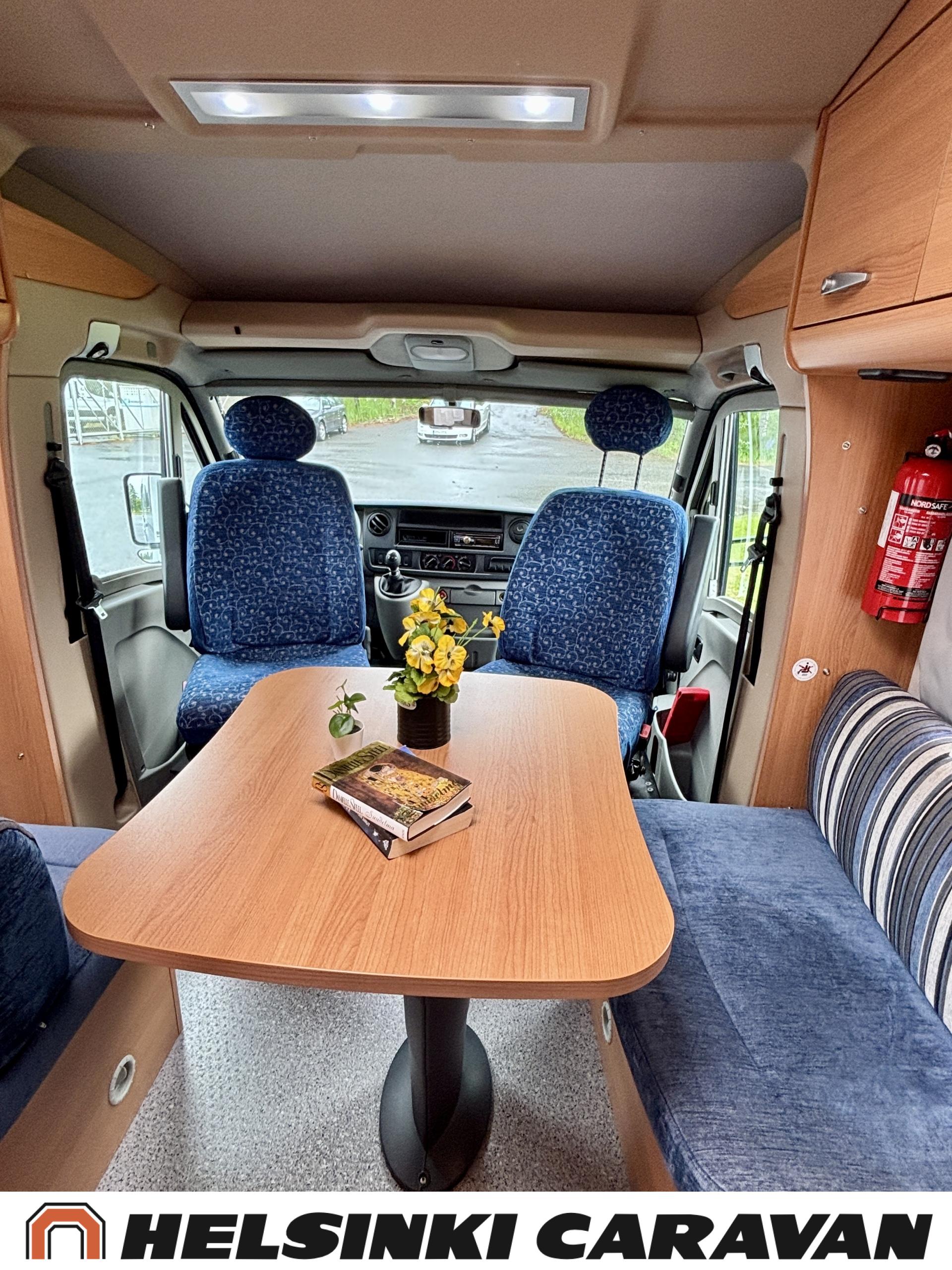 Tupla-ilmastoinnilla ei tule hiki, vaikka lähtisi tällä autolla Espanjan helteisiin. Erikoisuutena tästä autosta löytyy kunnon kokoinen wc ja suihkutila takaa. Voi siis kutsua jo spa-osastoksi. Hempeä musiikki soimaan ja ruusun terälehtiä vielä sängylle odottamaan, niin ilta on täydellinen kuuman suihkun jälkeen. Parisängyn lisäksi takaa löytyy ilmastointi ja reilusti kaappitilaa. Leninkejä ja pukuja varten on myös täysimittainen vaatekaappi. Jääkaappi koristaa ulko-oven vierustaa ja on nostettu lattiatasosta mukavampaan korkeuteen. Keittiössä on kokille sitä kuuluisaa tasotilaa. Tässä autossa loihtisi helposti vaikka kynttiläillallisen kahdelle. Etupenkit kääntyvät ruokailupöydän ympärille. Ja itse pöydästä löytyy teleskooppijalka, millä saadaan rakennettua ylimääräinen sänky. Auton ulkopuolella, takaosassa on vielä erikoisuutena koko auton pituinen kaappi. Ulkotavaroille tai miksei vaikkapa työkalukaappi Puuha-Petelle tai -Paulalle.