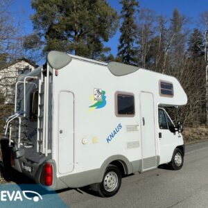 Nyt on tosi lyhyt ketterä Knaus jossa makuutilat 4:lle. Mahtuu parkkiruutuunkin. Takaosassa todella tilava pesuhuone.