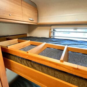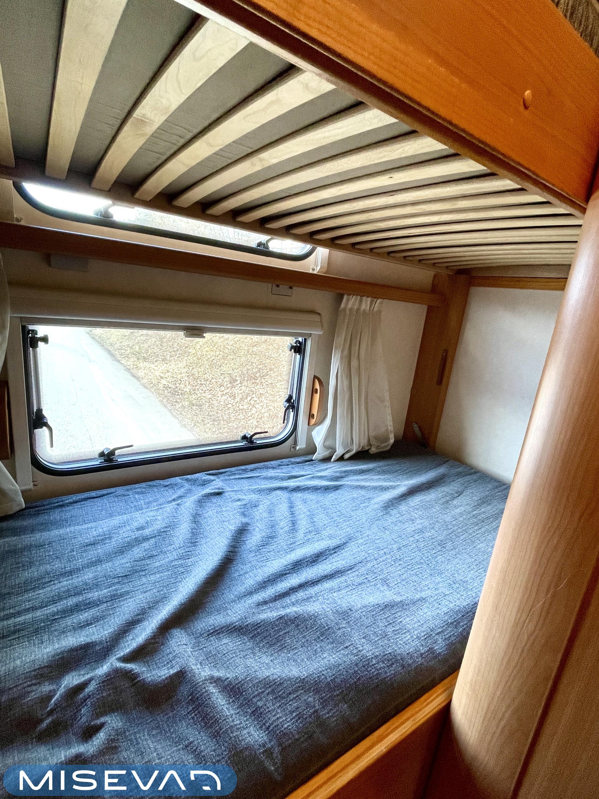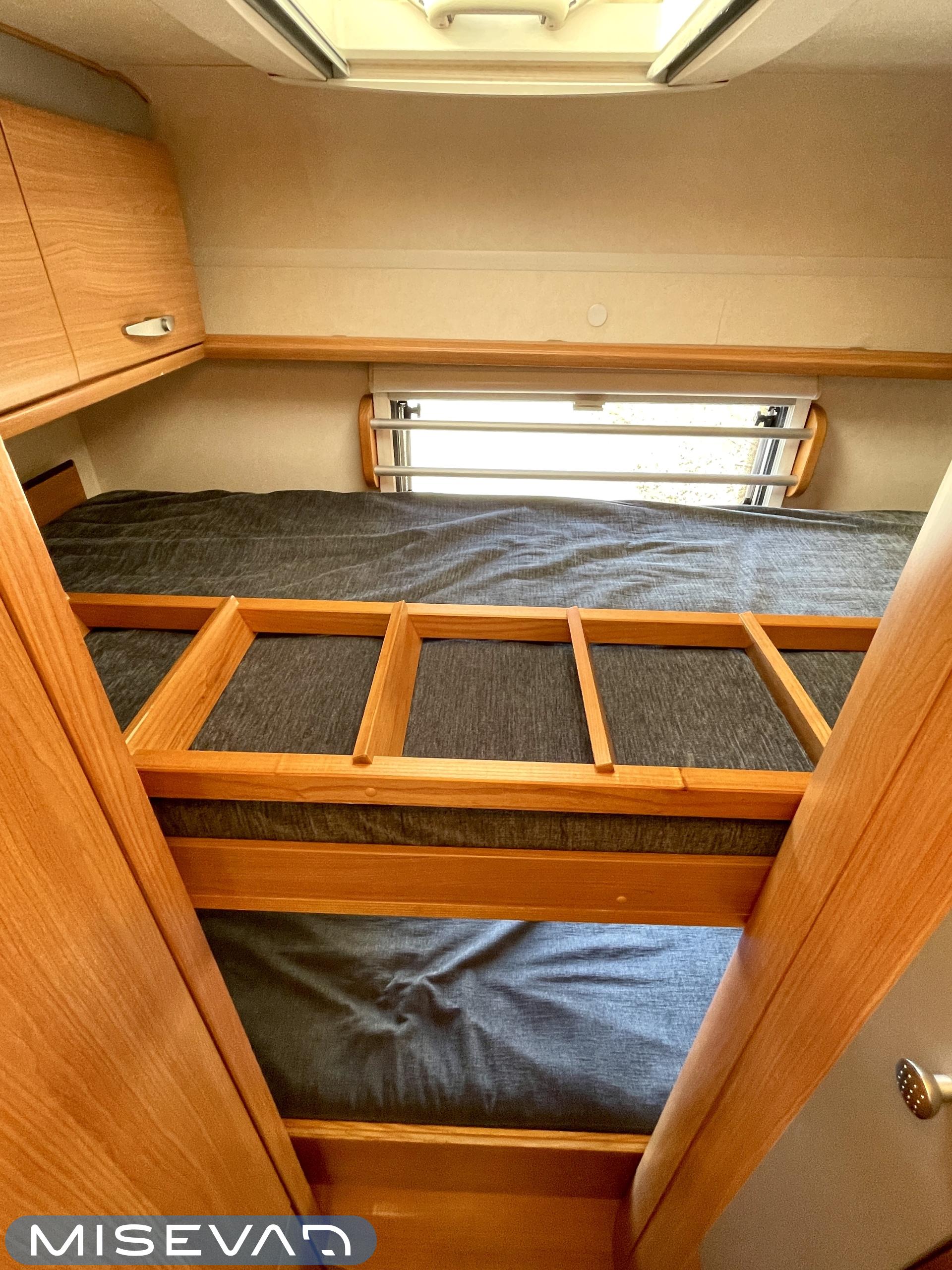 -Takana kerrossängyt, edessä tilava alkovi ja pöytäryhmästä sängynpohjaksi laskettava sänky.