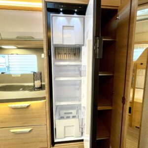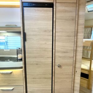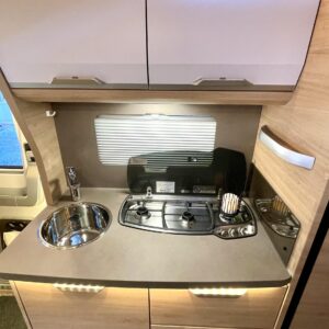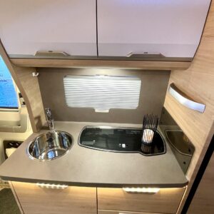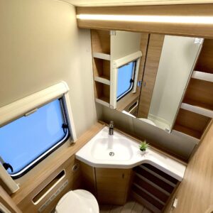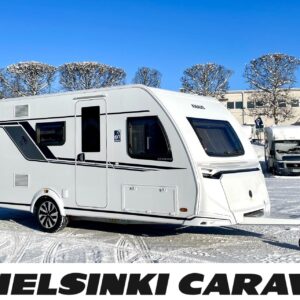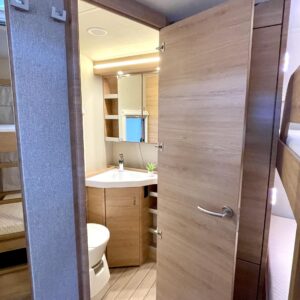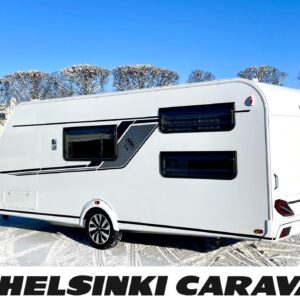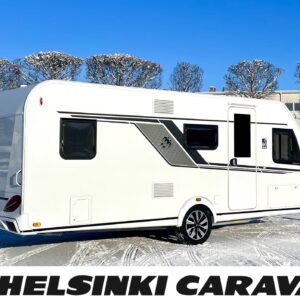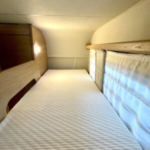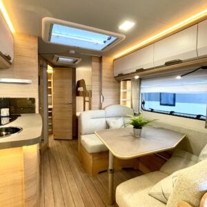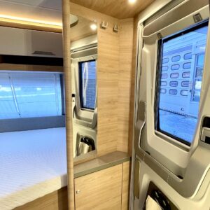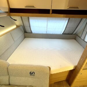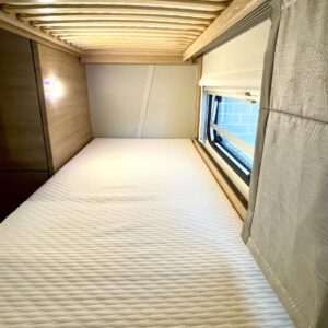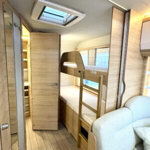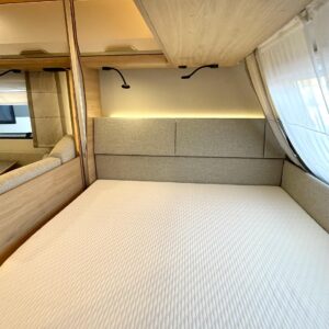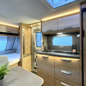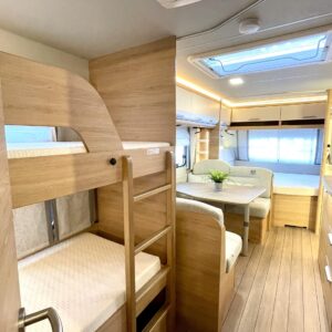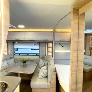 Sisään astuessa laadukas tunnelma säilyy, upea epäsuora ledvalaistus ja laadukkaat materiaalit suorastaan kutsuvat peremmälle. Vaunun edessä on 145cm leveä ranskalaistyylinen parivuode, keskiosan sohvaryhmästä saa tarvittaessa makuusijan kahdelle ja takaosasta löytyy kaksikerroksinen kerrossänky. Tässä vaunussa majoittuu siis tarvittaessa kuusi henkilöä kerrallaan!