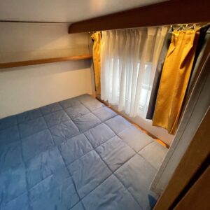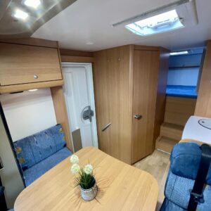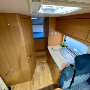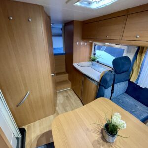 Lyhyehkö mutta tilavahko Knaus, jossa käytännöllinen pohjaratkaisu. Auton takaosassa on iso takatalli sekä mukava poikittainen parisänky, joka tekee nukkumisesta helppoa ja tilavaa ilman turhaa säätämistä.