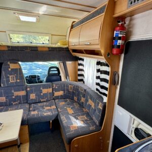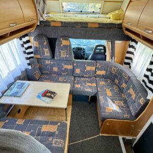 Auton etuosasta löytyy leveän alkovivuoteen lisäksi pöytäryhmä, jonka ympärille mahtuu jopa 7 henkeä toisiaan hauskuuttamaan. Pöytäryhmästä saa tarvittaessa sijattua toisen parivuoteen.