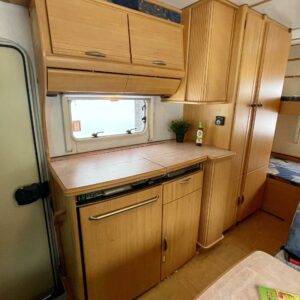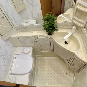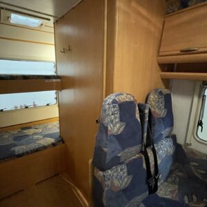 Auton takaosassa poikittaiset parivuoteet ja tilava pesuhuone/ WC.