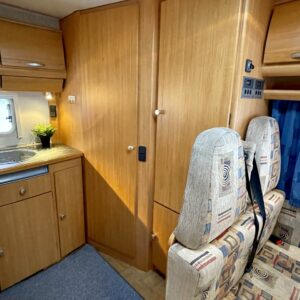 Erittäin avara pohjaratkaisu: Auton takaosassa on keittiö ja pesuhuone/ WC. Etuosasta löytyy leveä alkovuode ja pöytäryhmä pitkällä sivusohvalla.