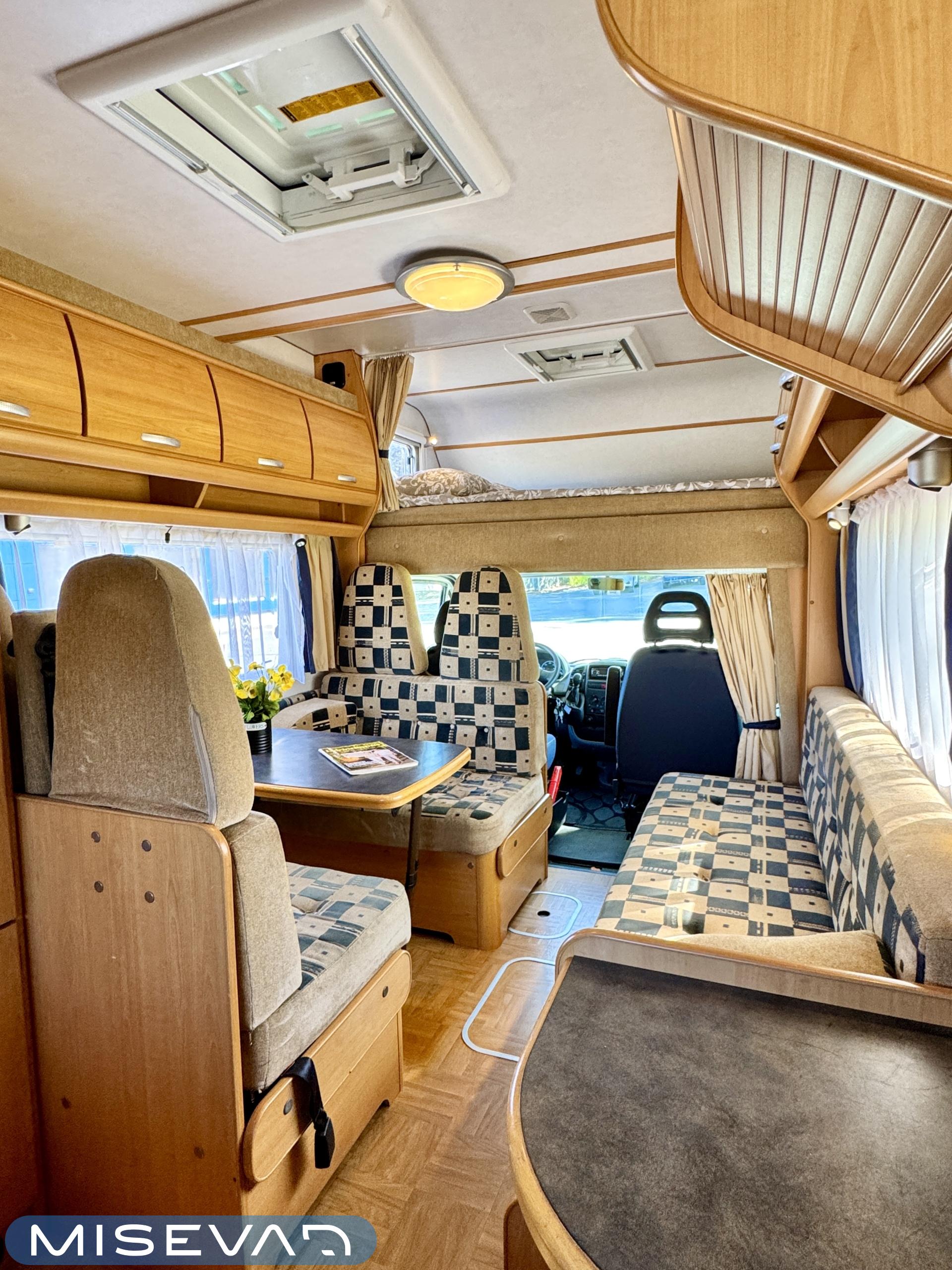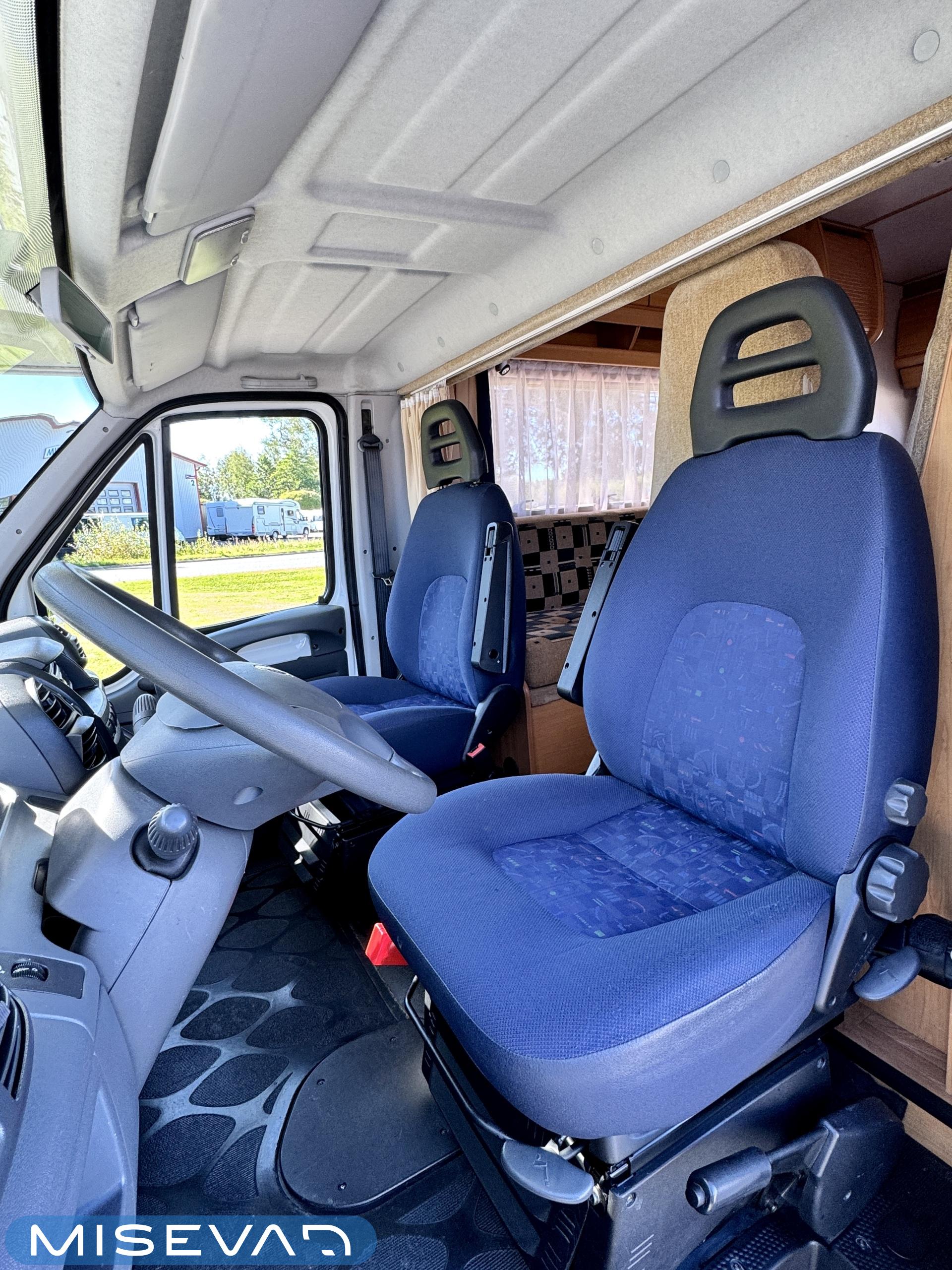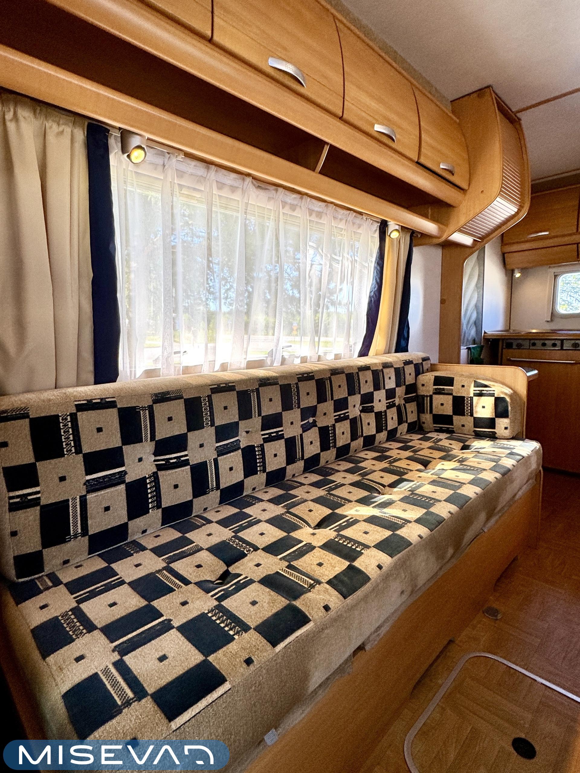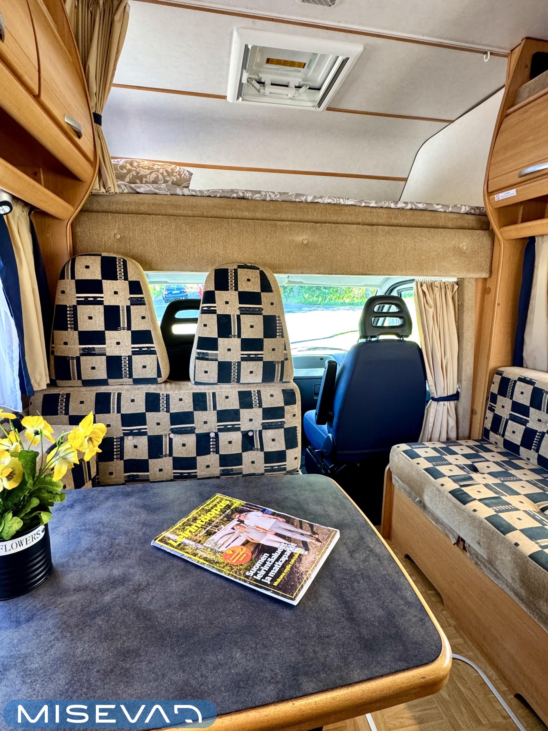 Autosta näkee heti, että sitä on pidetty hyvin. Asuintila on siisti ja todella avara. Suuri parivuode kutsuu pötköttelemään, kooltaan se on jopa 140cm x 200cm. Keskellä autoa on avara pöytäryhmä sivusohvalla, jonka ympärille mahtuu helposti kuusikin henkilöä viettämään iltaa. Karavaanikokki saa takakeittiössä oman rauhan ruoanlaittoon ja laskutilaa on kokkailuun. Pesu-/ wc-tila on reilun kokoinen takaosassa. Kokonaisuus on varusteltu myös runsaalla kaappitilalla. Fiatin iso kone takaa että puhti ei lopu kesken ja mukavia kilometrejä on varmasti edessä!