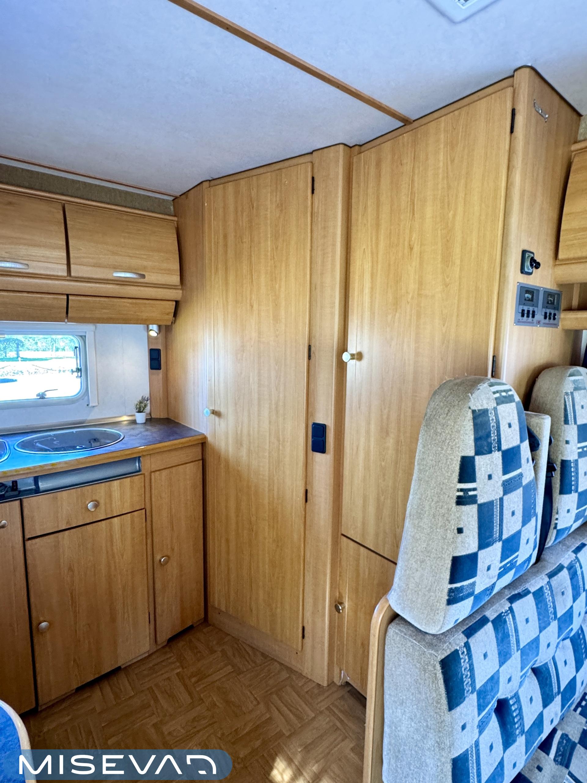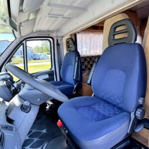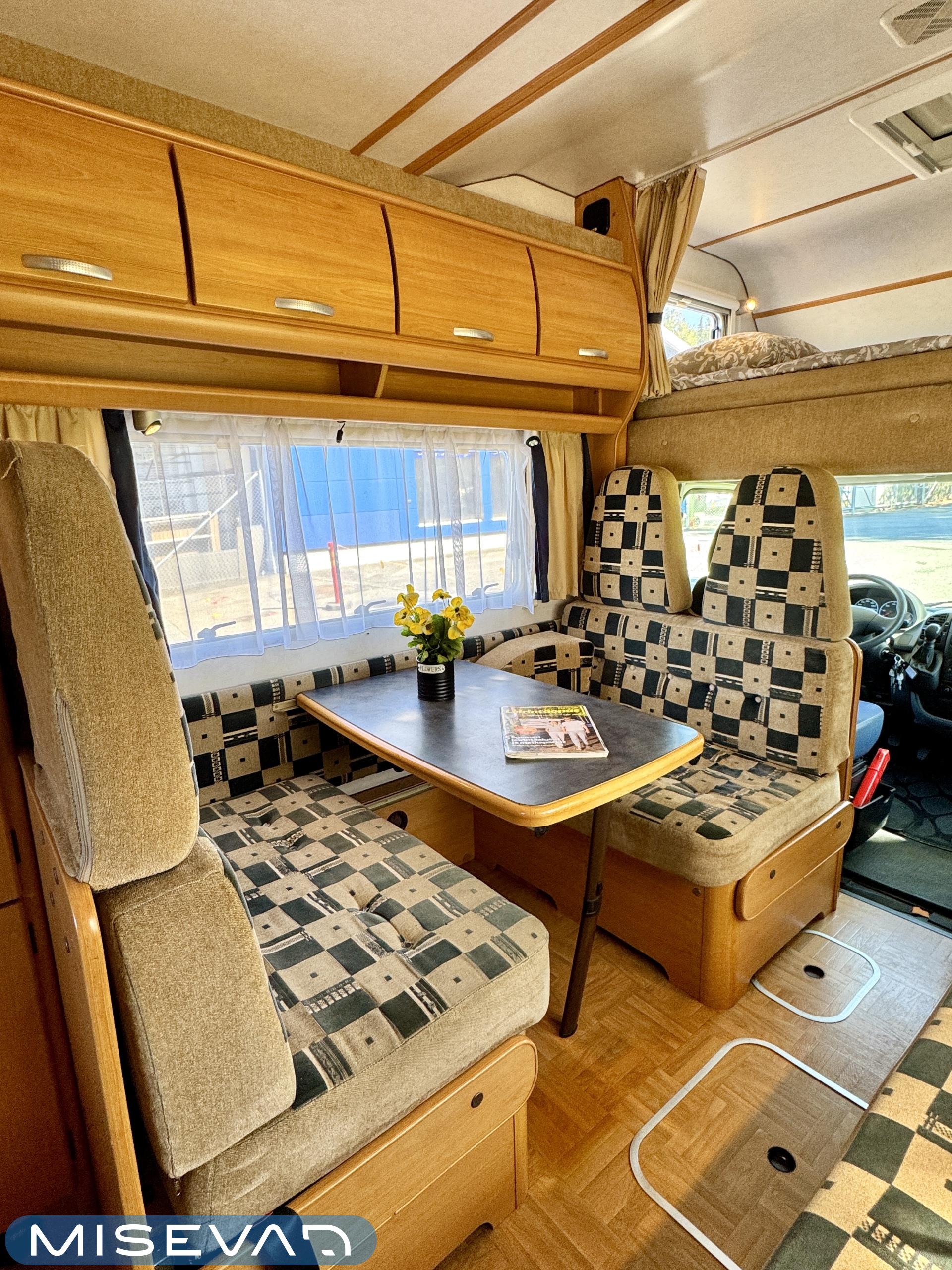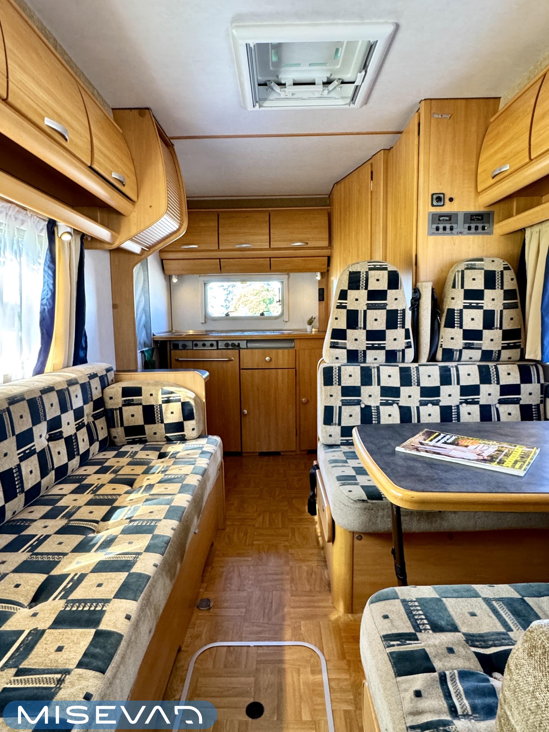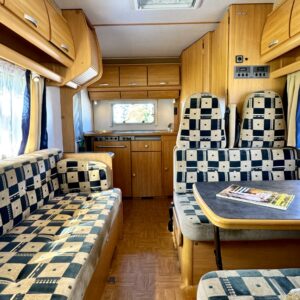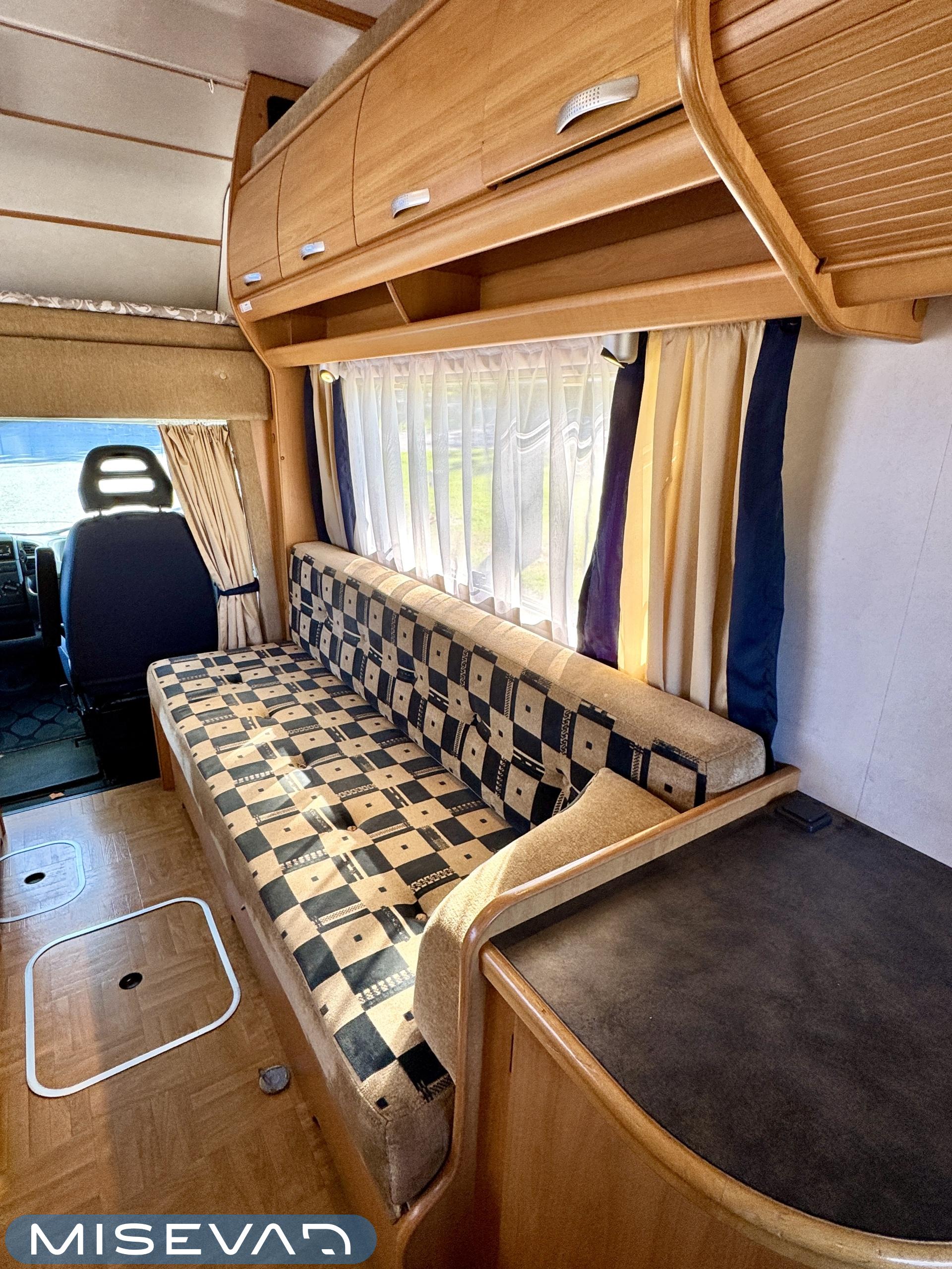 Autosta näkee heti, että sitä on pidetty hyvin. Asuintila on siisti ja todella avara. Suuri parivuode kutsuu pötköttelemään, kooltaan se on jopa 140cm x 200cm. Keskellä autoa on avara pöytäryhmä sivusohvalla, jonka ympärille mahtuu helposti kuusikin henkilöä viettämään iltaa. Karavaanikokki saa takakeittiössä oman rauhan ruoanlaittoon ja laskutilaa on kokkailuun. Pesu-/ wc-tila on reilun kokoinen takaosassa. Kokonaisuus on varusteltu myös runsaalla kaappitilalla. Fiatin iso kone takaa että puhti ei lopu kesken ja mukavia kilometrejä on varmasti edessä!