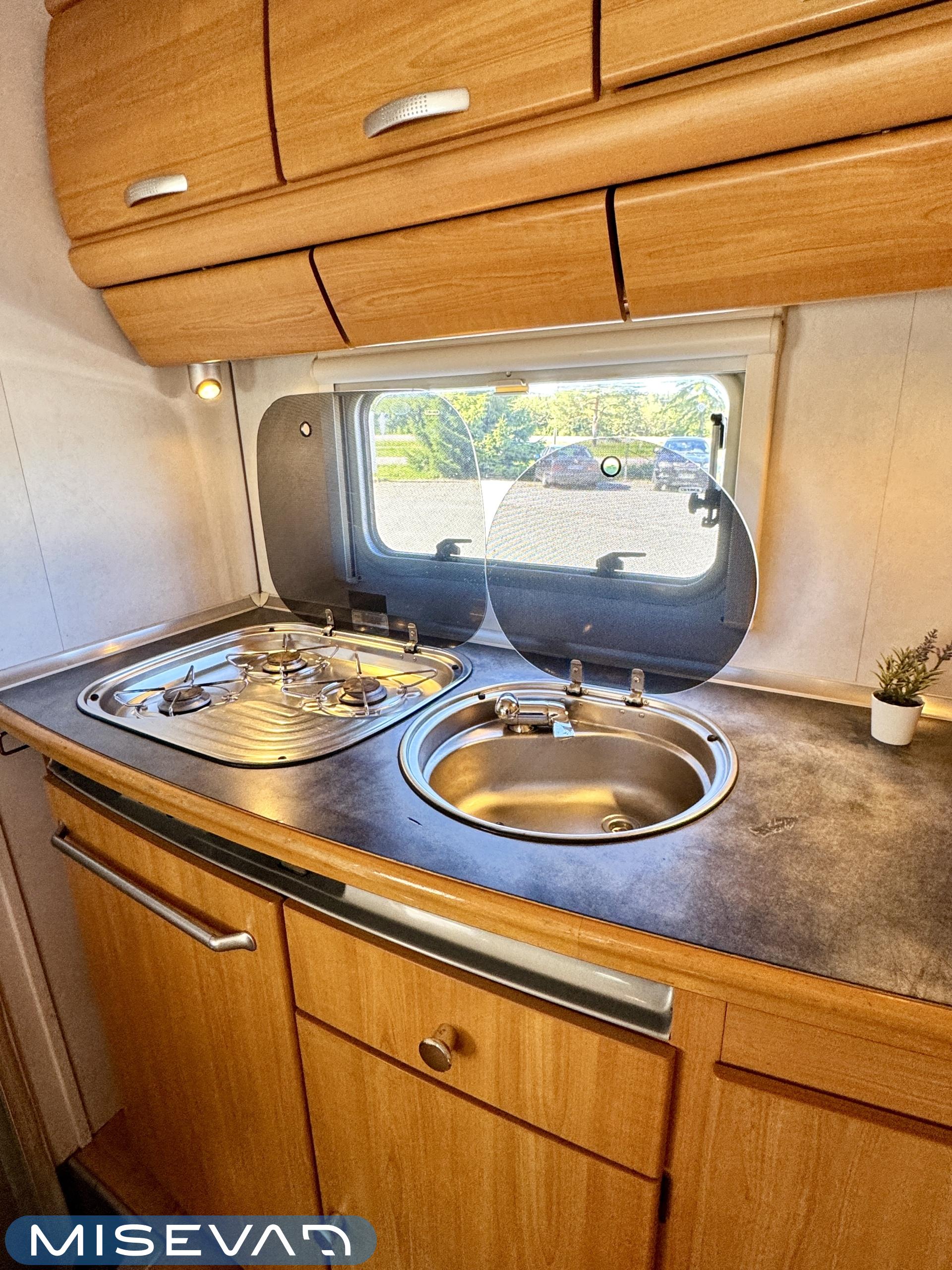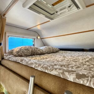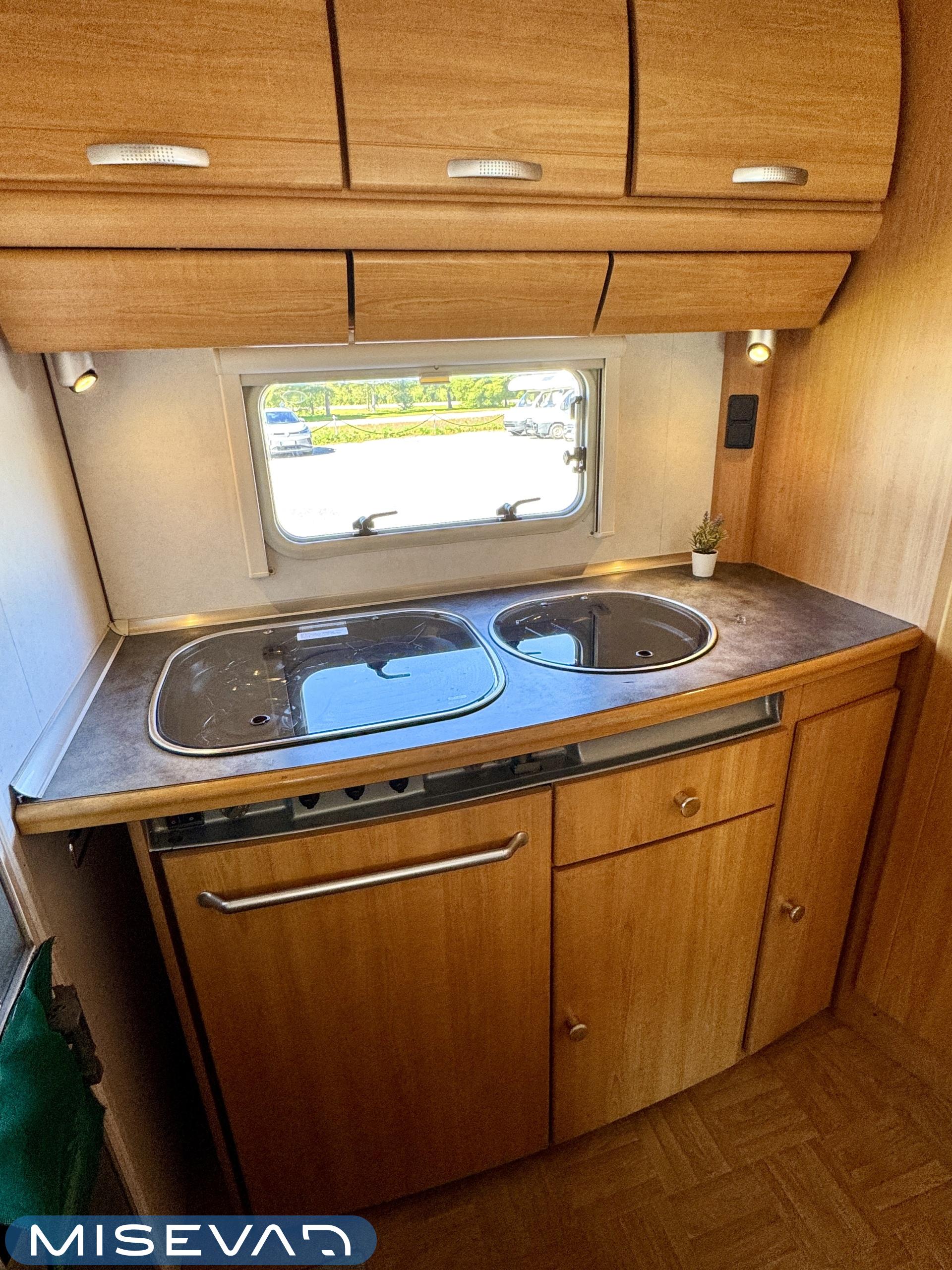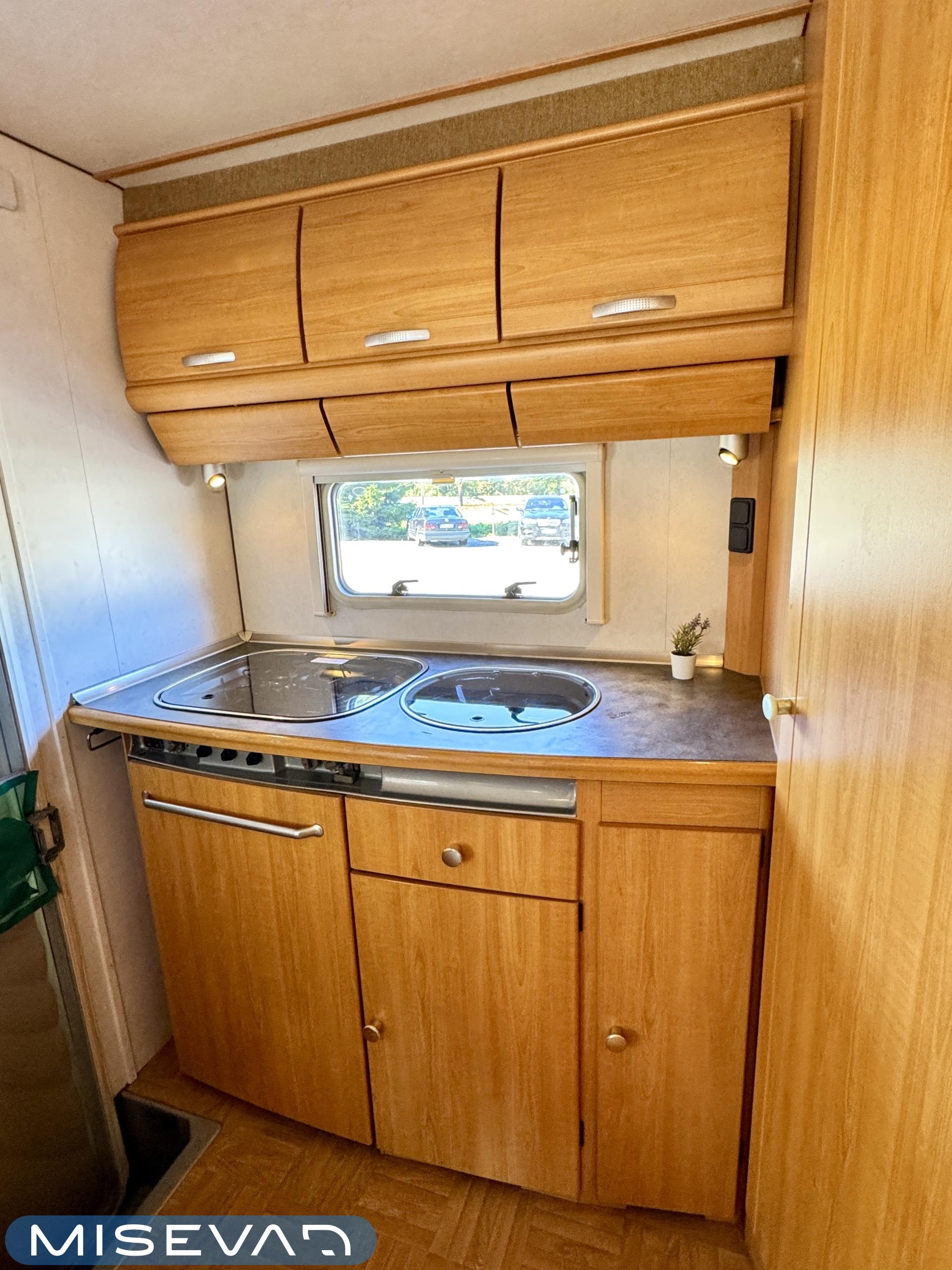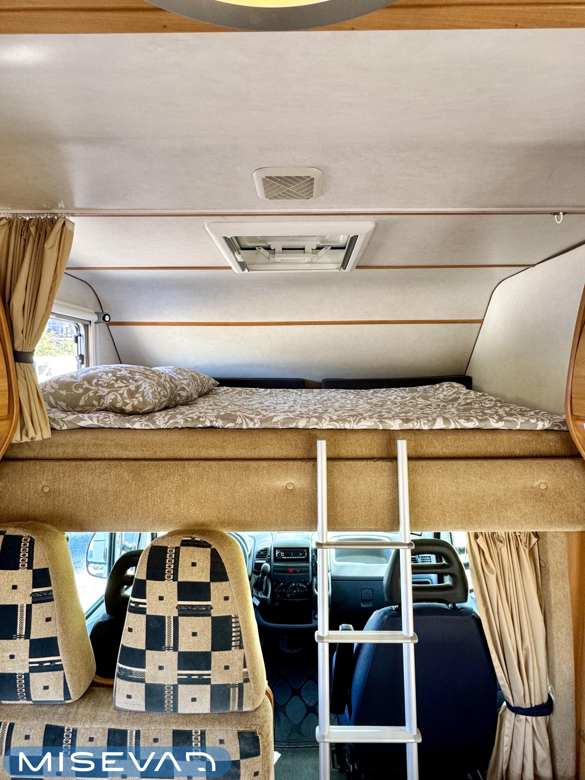 Autosta näkee heti, että sitä on pidetty hyvin. Asuintila on siisti ja todella avara. Suuri parivuode kutsuu pötköttelemään, kooltaan se on jopa 140cm x 200cm. Keskellä autoa on avara pöytäryhmä sivusohvalla, jonka ympärille mahtuu helposti kuusikin henkilöä viettämään iltaa. Karavaanikokki saa takakeittiössä oman rauhan ruoanlaittoon ja laskutilaa on kokkailuun. Pesu-/ wc-tila on reilun kokoinen takaosassa. Kokonaisuus on varusteltu myös runsaalla kaappitilalla. Fiatin iso kone takaa että puhti ei lopu kesken ja mukavia kilometrejä on varmasti edessä!